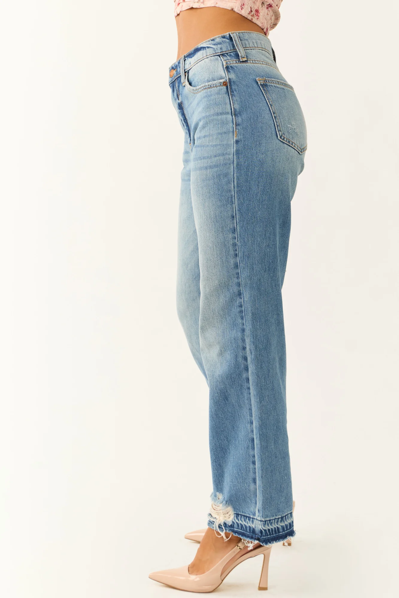 Discover the perfect addition to your wardrobe with our Medium Wash Distressed Hem High Rise Jeans. Crafted from 78% Cotton and 22% Rayon, these non-stretchy denim jeans feature a high rise fit, a trendy distressed hemline, and a stylish zipper fly with button closure. The waistband runs large, so we recommend sizing down for the ideal fit. These jeans are ideal for casual outings and events, with a front rise of 11, back rise of 13, and inseam length of 28. Additionally, they come unlined and can be machine washed cold. Elevate your fashion with these versatile jeans today!
