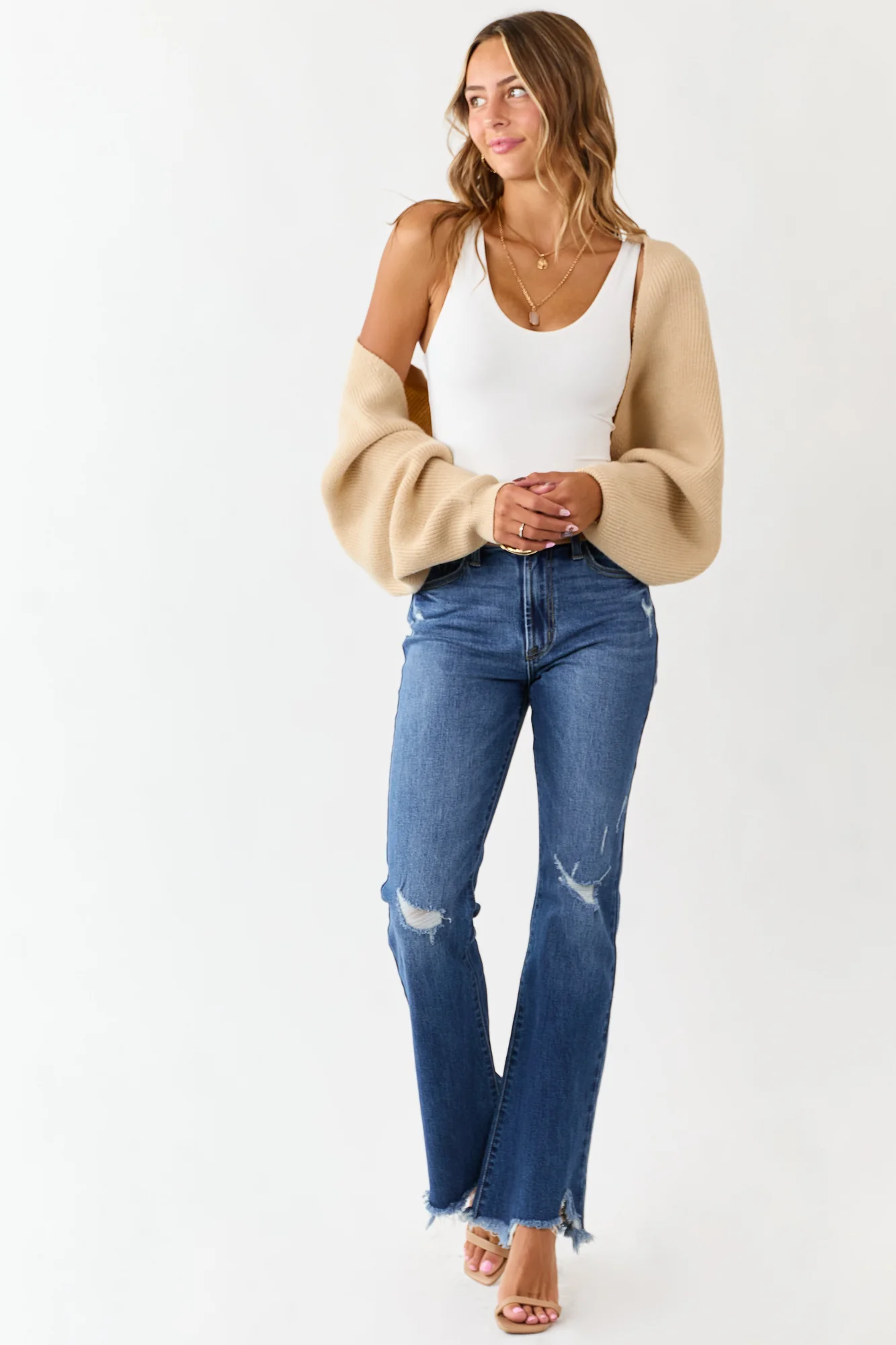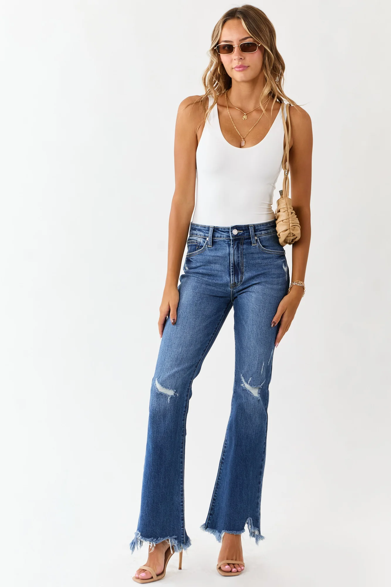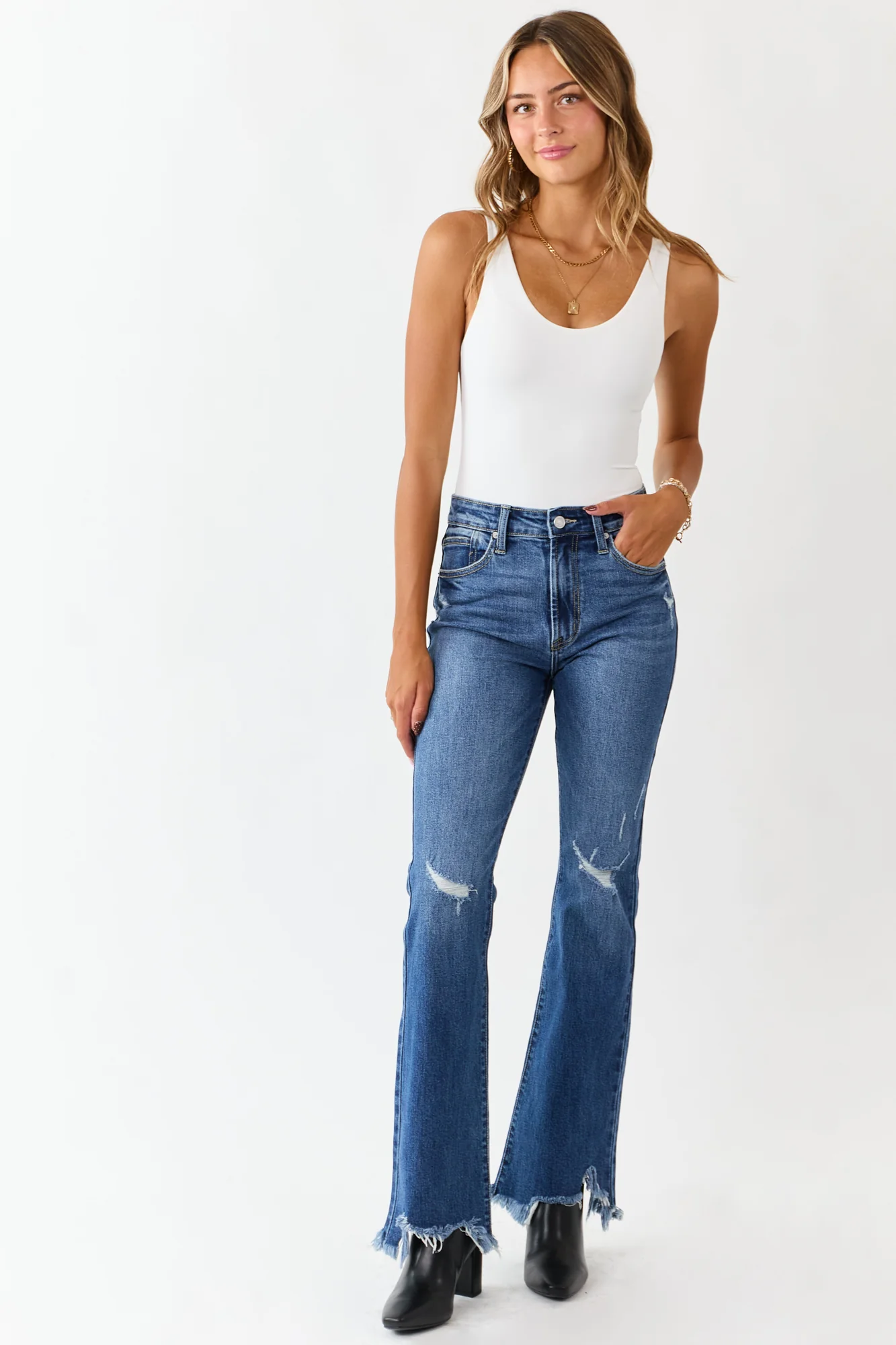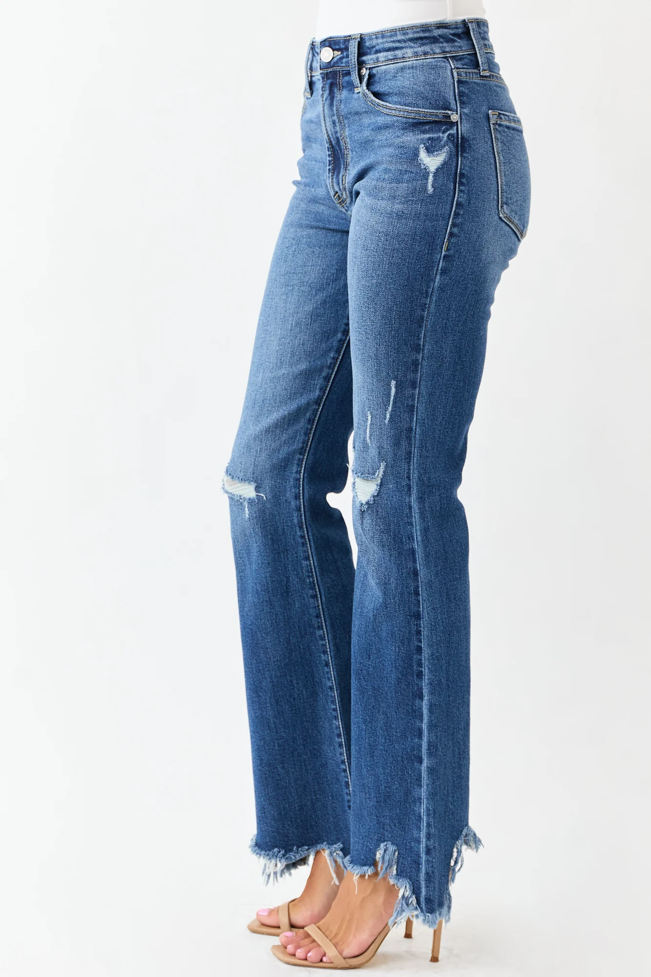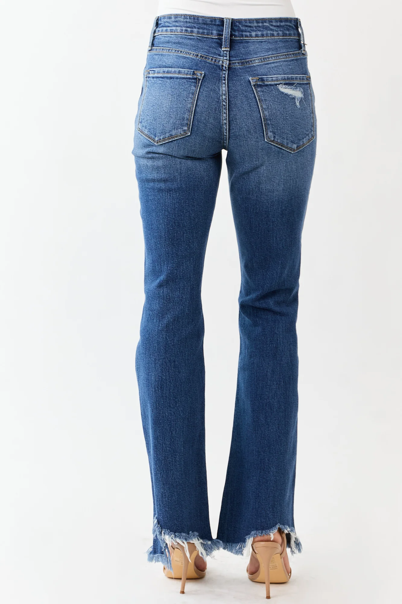 Experience comfort and style with our Medium Wash Distressed High Rise Flare Denim Jeans. Crafted from semi-stretchy denim, these jeans feature distressed details and an uneven shark bite hem for a lived-in look. With a high rise fit and tall length, these jeans are perfect for your everyday adventures. Complete with a zipper fly, button closure, belt loops, and 5 pockets. Made of 99% Cotton and 1% Spandex. Available in sizes 1 to 15.