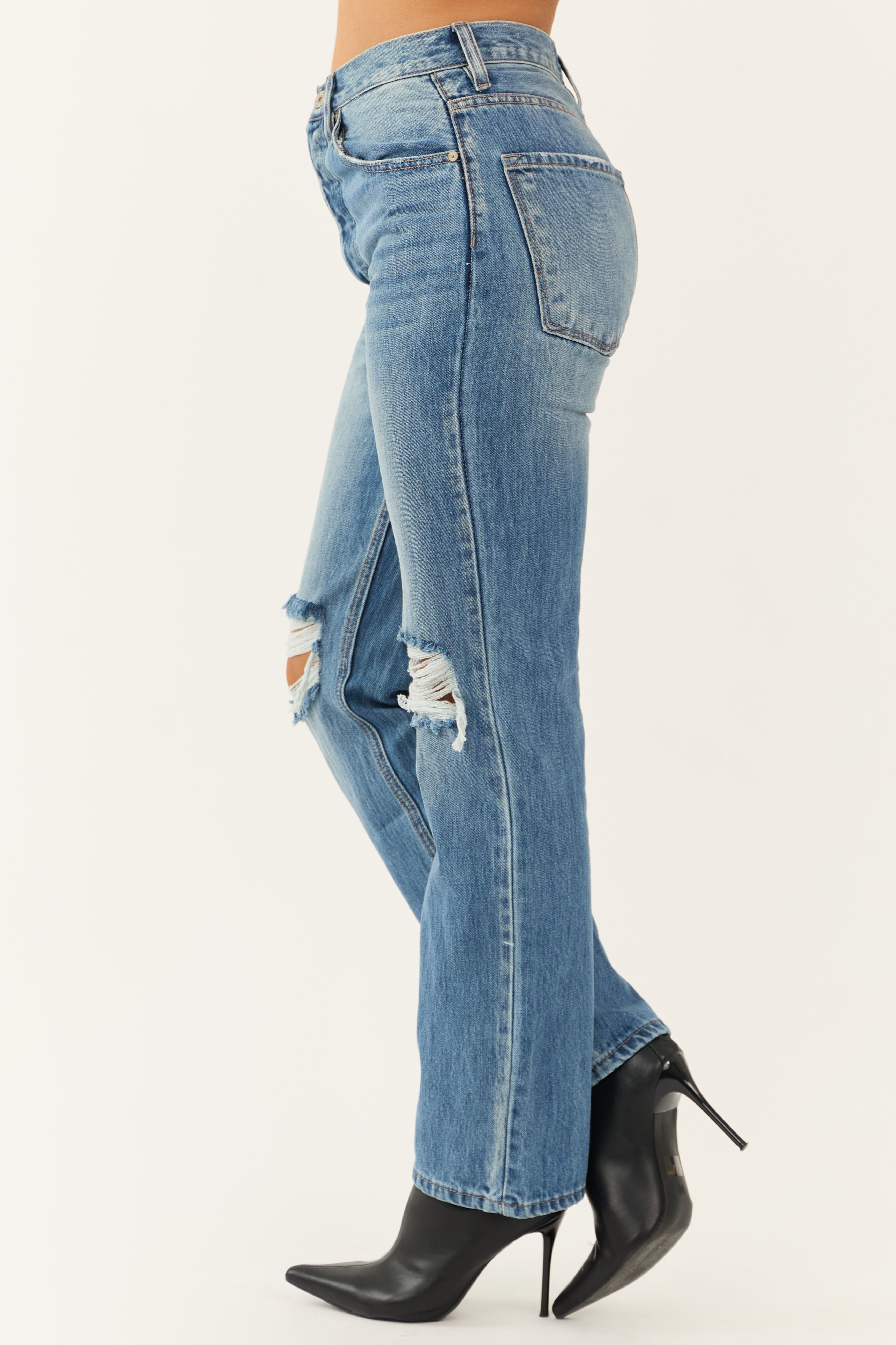 Experience vintage charm and modern style with our KanCan Medium Wash 90s Straight Leg Jeans. These non-stretchy washed denim jeans feature a high rise fit, 5 pockets, belt loops, and a hidden button fly. The distressed knees and pockets add a touch of edginess to your look. With a comfortable waistband and varying inseam lengths, these 100% cotton jeans are perfect for everyday wear. Available in sizes ranging from 1 to 15, these jeans are a must-have addition to your wardrobe. Care instructions: Machine wash in cold water, wash with like colors, tumble dry low, iron on low if needed. Model is wearing size 3. Waist measurements may vary. Imported .