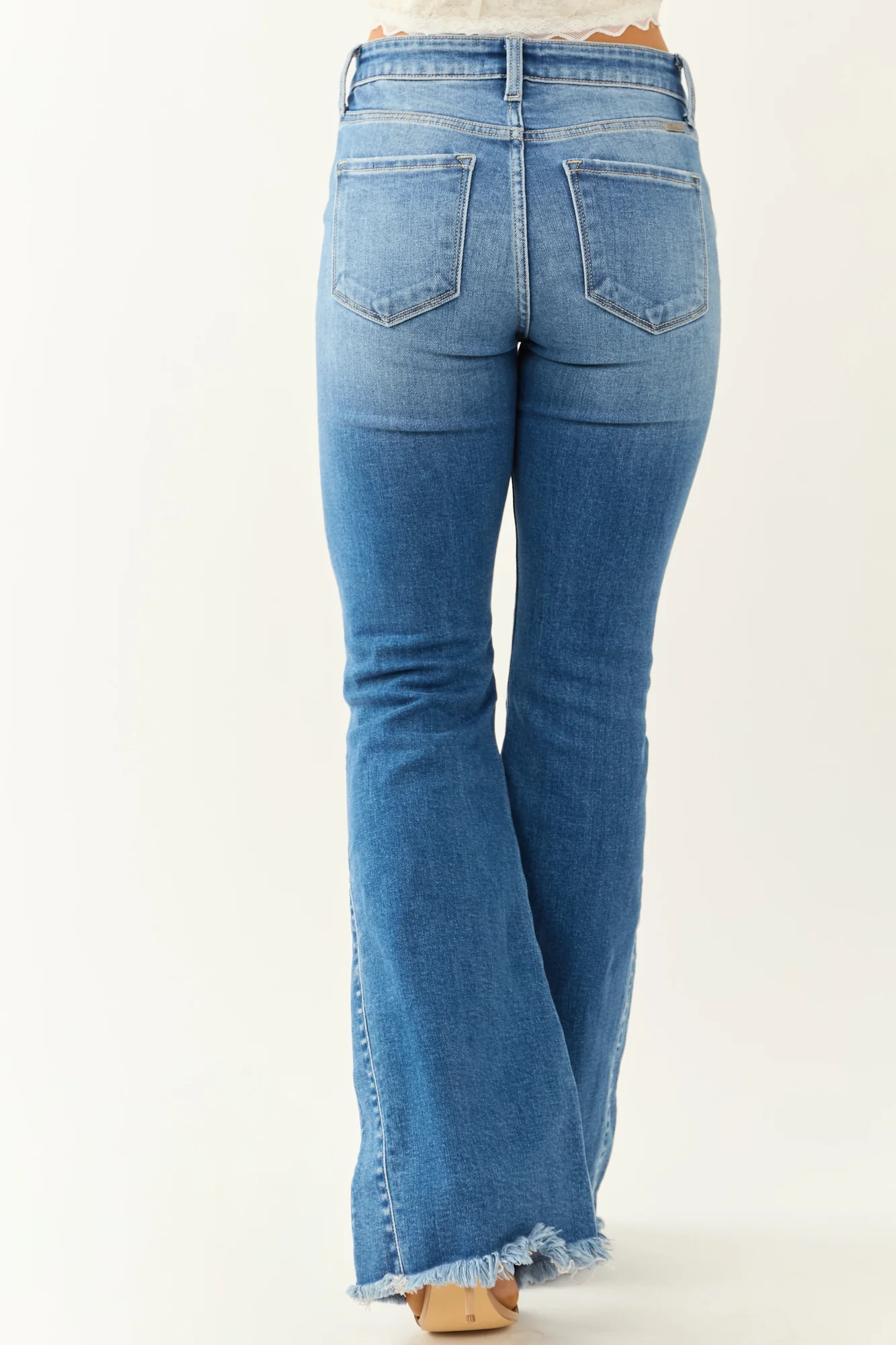 Explore our collection of Medium Wash Flare Leg Stretchy Jeans for women in sizes 1/24 to 15/31. These unique jeans feature a detailed side panel on the hem, a flattering stretchy fit, high rise of 9.5 inches, frayed hem, and a longer 33-inch inseam. Made of 93% Cotton 5% Polyester 2% Spandex, our jeans fit true to size with a waistband that allows for 1-3 inches of extra space. Customer feedback suggests sizing up if needed. Dont miss out on these semi-stretchy denim jeans with an open side panel hem design!