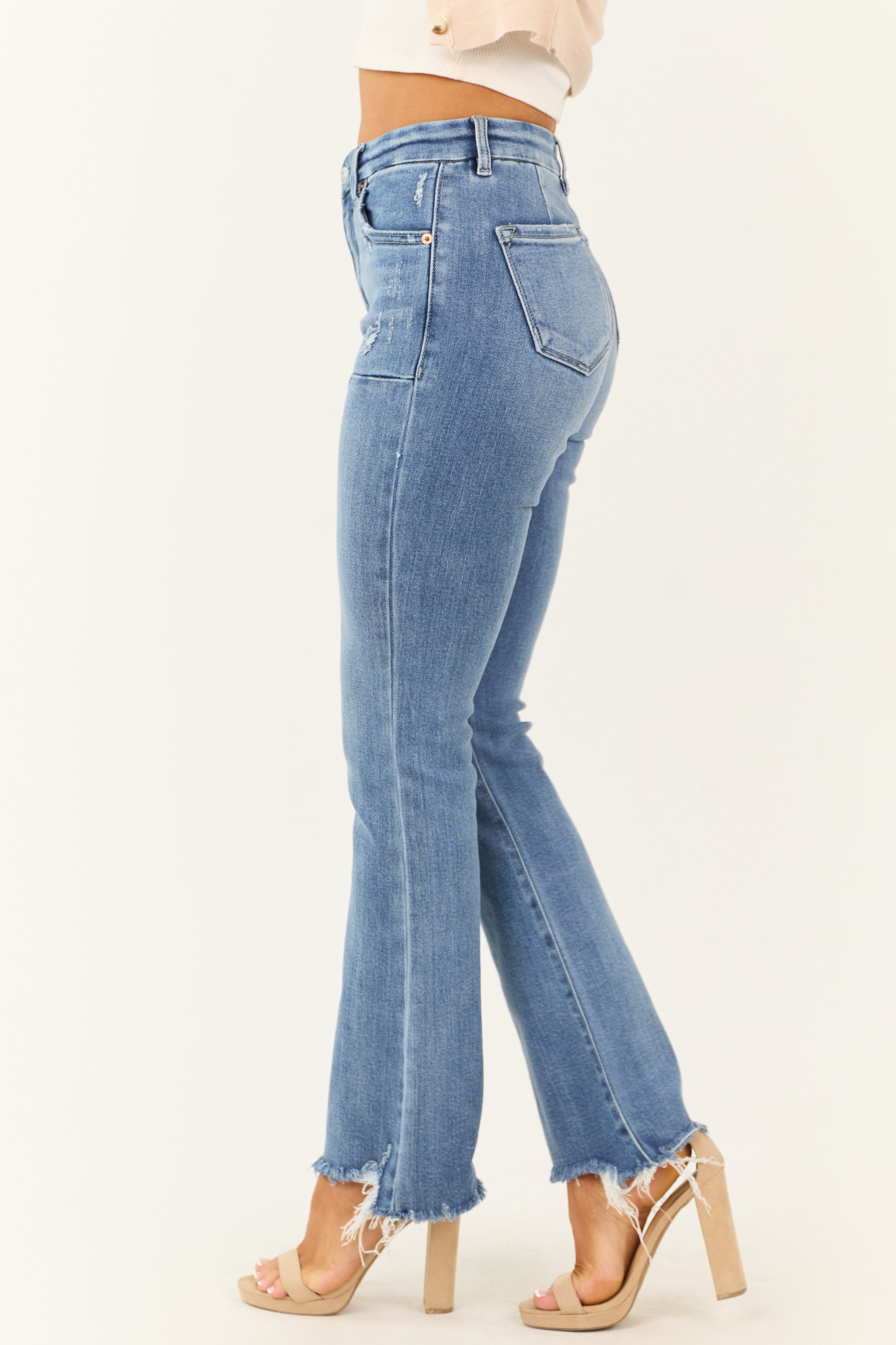Discover the perfect blend of style and comfort with our Medium Wash High Rise Flare Leg Stretch Jeans. Crafted from 67% Cotton, 25% Lyocell, and a hint of Spandex for flexibility. Designed for a flattering fit with a 11″ front rise and a 31″ inseam. These tummy control jeans feature 5 pockets, a sharkbite hem, and a zipper fly with button closure. Elevate your look with these semi-distressed jeans offering a versatile wardrobe staple. Available in waist sizes 23″ to 30″.