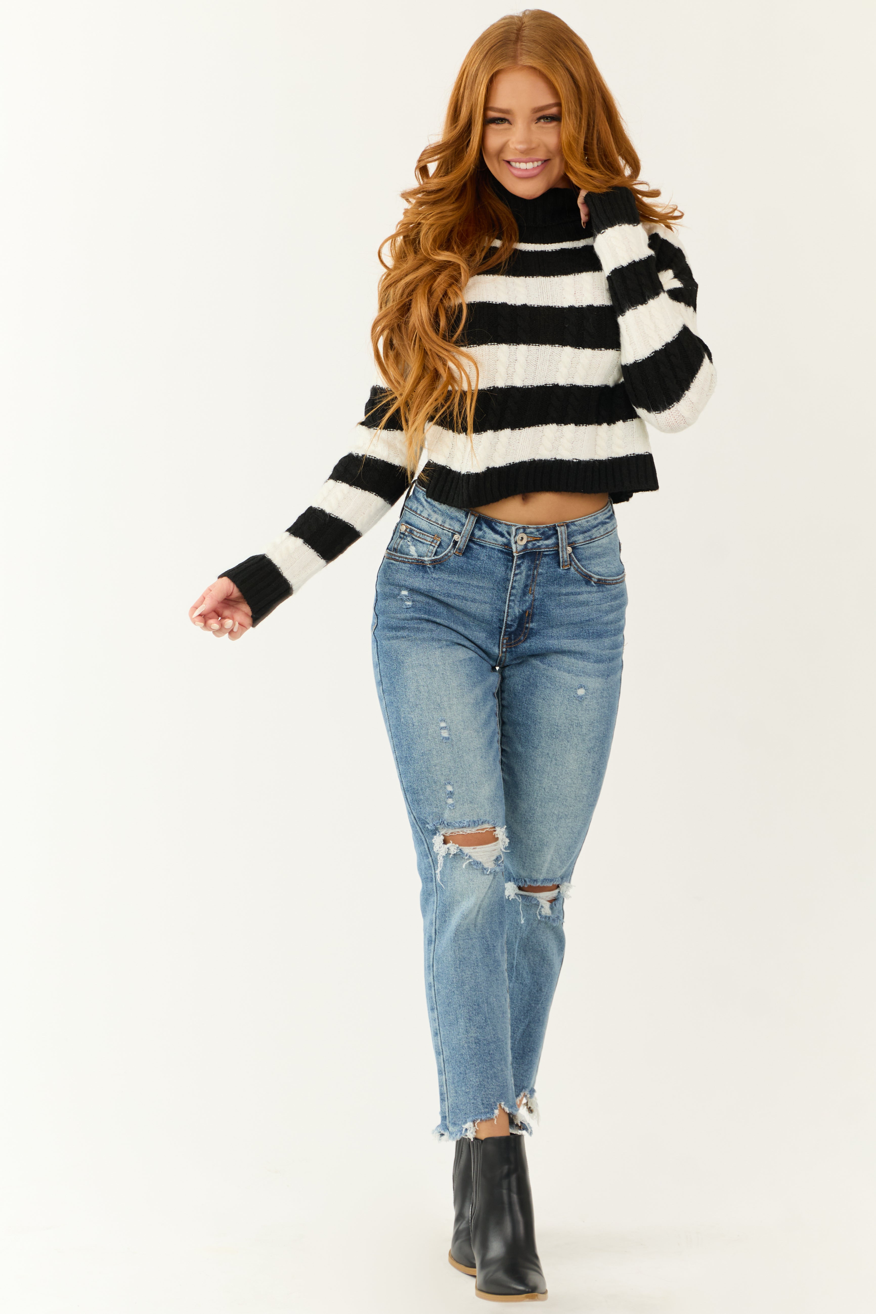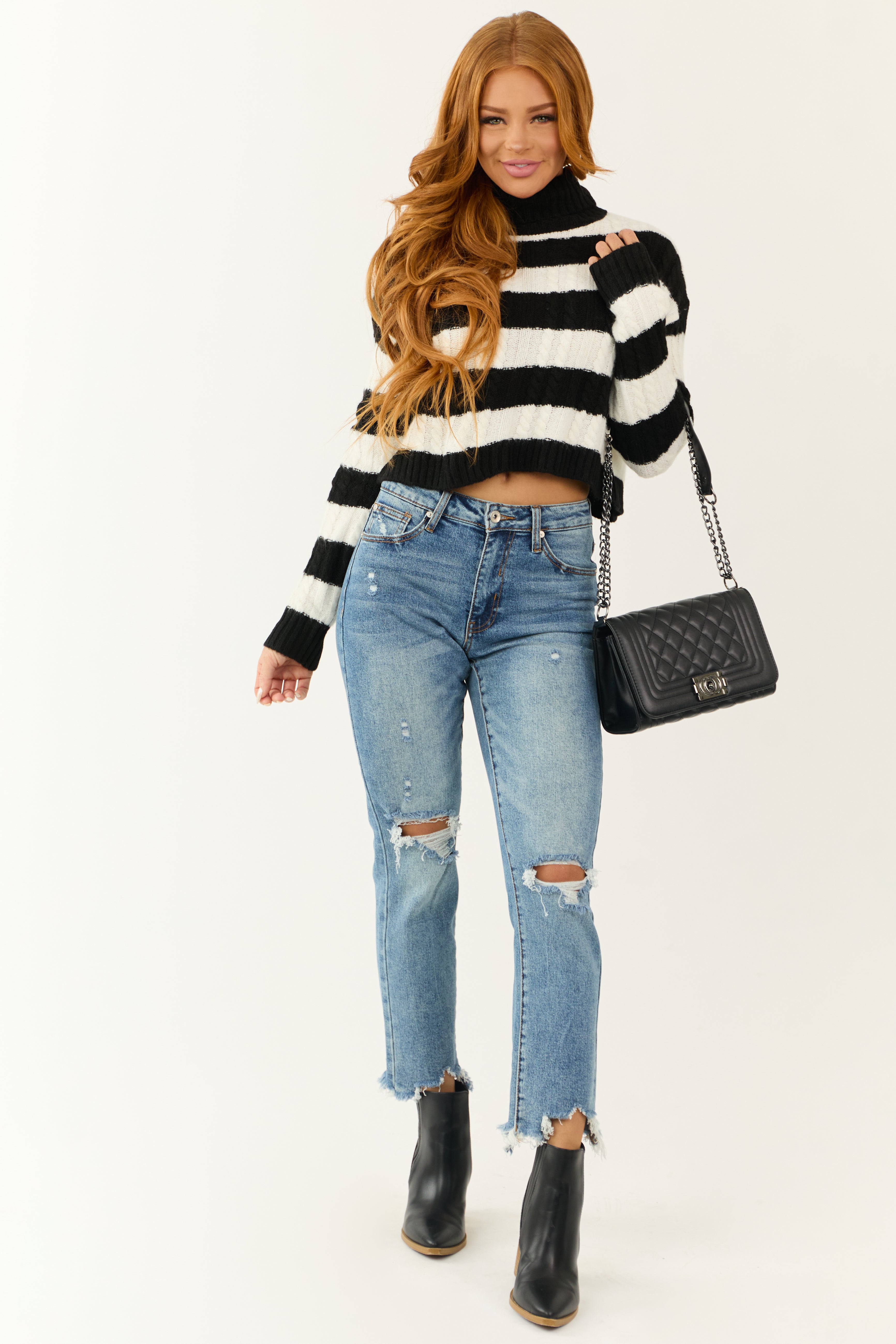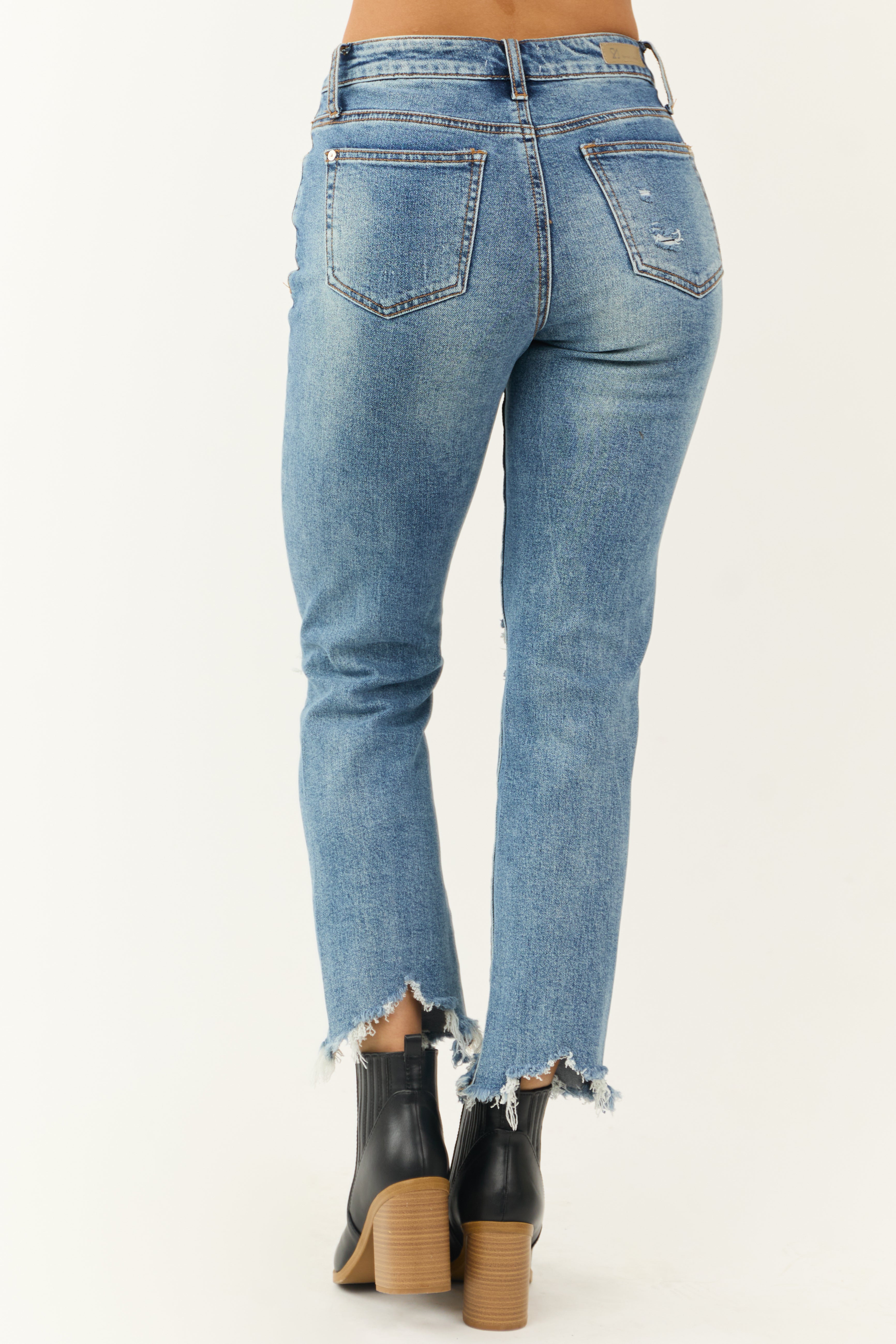 Experience comfort and style with our Medium Wash High Rise Straight Leg Womens Jeans. Made of 94% Cotton, 5% Polyester, and 1% Spandex, these jeans feature a tummy control design, belt loops, zipper fly with button closure, and 5 pockets for convenience. The distressed shark bite hem adds a trendy touch, while the stretchy semi-stretch denim ensures a perfect fit. Whether its a casual day out or a night in, these jeans are the perfect choice for any occasion. Care instructions: Wash inside out in cold water with like colors, hang dry only.