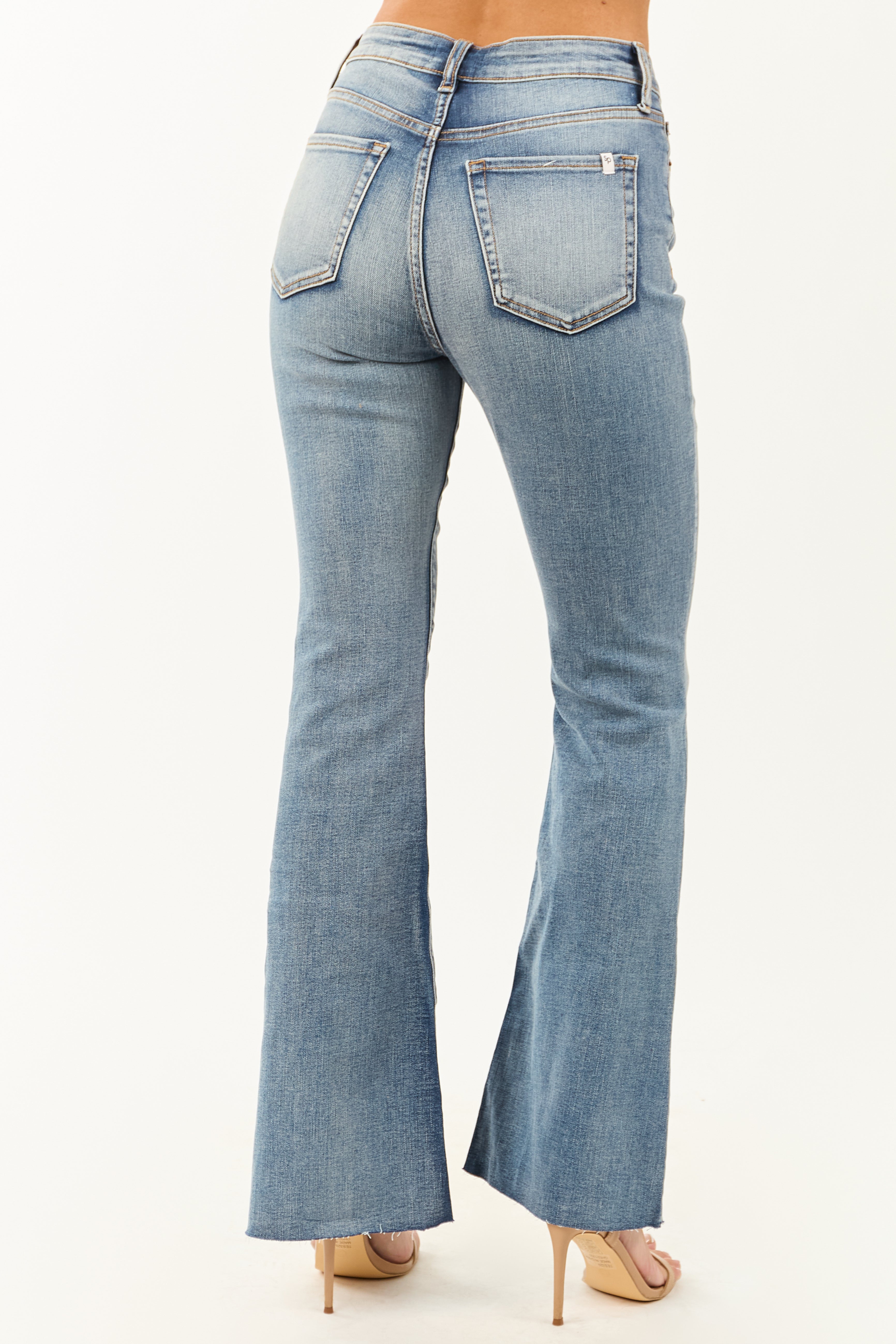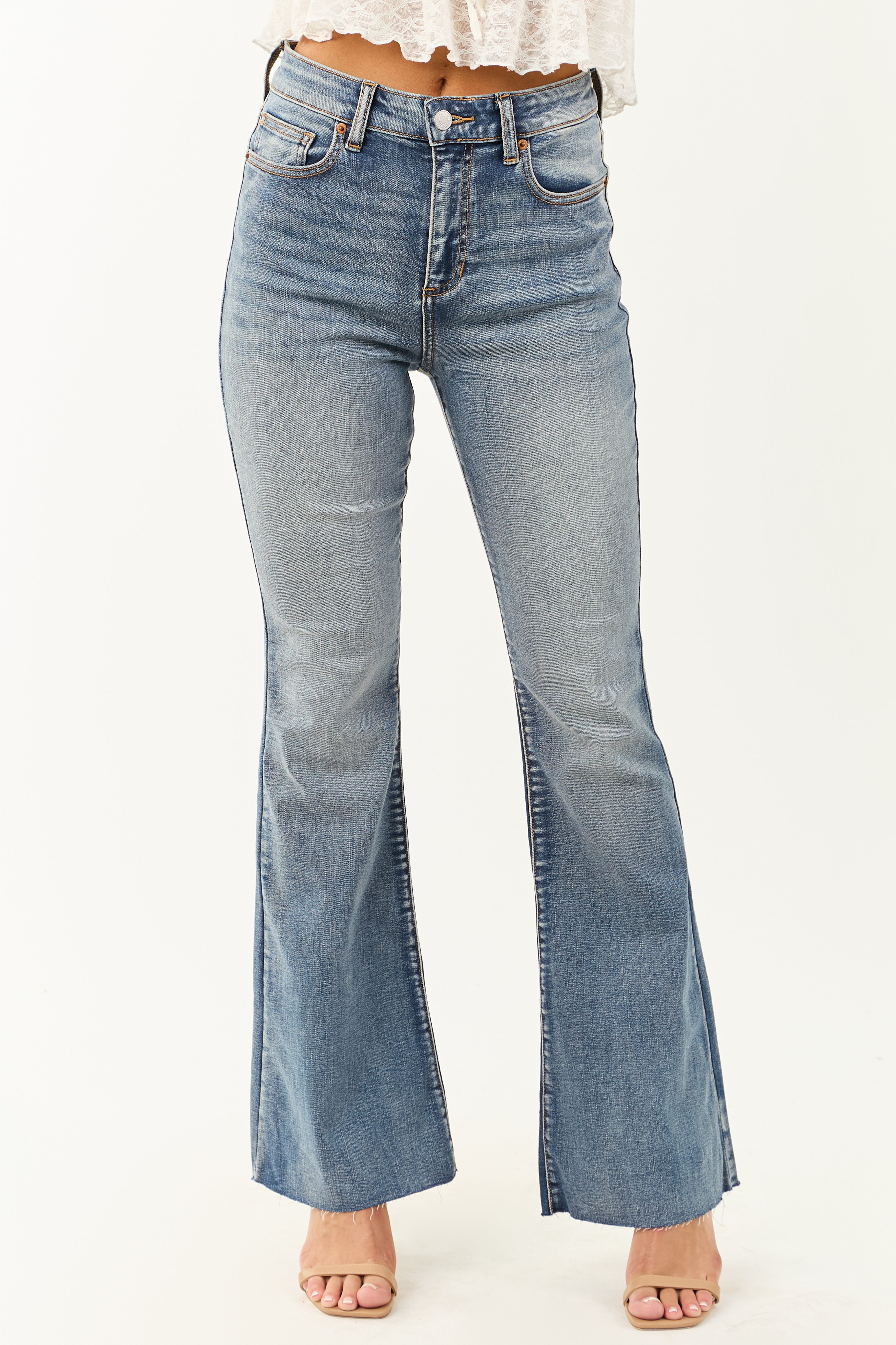 These Medium Wash High Rise Stretchy Flare Jeans feature a high rise design for a flattering fit. Made from stretchy denim with a medium vintage wash, these jeans offer comfort and style. The zipper fly with button closure, 5 pockets, and belt loops add functionality. Designed with a raw hem, these jeans are both trendy and versatile. Available in various waist sizes and inseam lengths. Make a fashion statement with these must-have jeans!