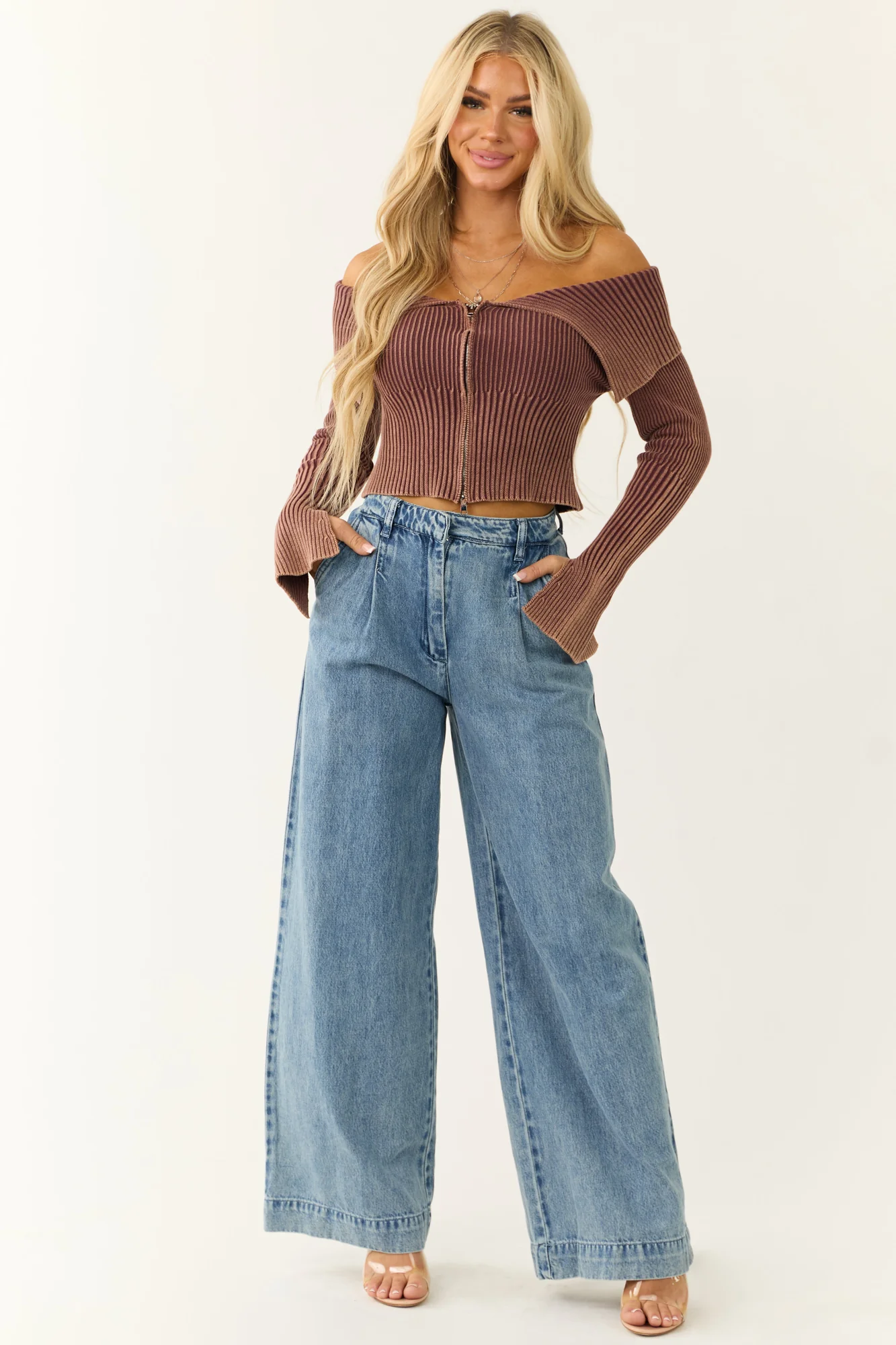 Upgrade your wardrobe with our Signature8 Medium Wash Wide Leg High Rise Jeans for women. These non-distressed jeans feature a flattering wide leg design and high-rise waist. Expertly crafted from 60% Cotton and 40% Tencel blend for durable comfort. With a zipper fly, hook and button closure, belt loops, faux back pockets, and 2 side pockets, these jeans blend style with functionality seamlessly. The pleated seam details on the waist add a chic touch. Available in sizes S, M, and L. The inseam varies from 32 inches to 33 inches. Hand wash cold, line dry, and avoid ironing or dry cleaning for best care. Model is wearing size Small. Embrace comfort and style with our womens denim pants.