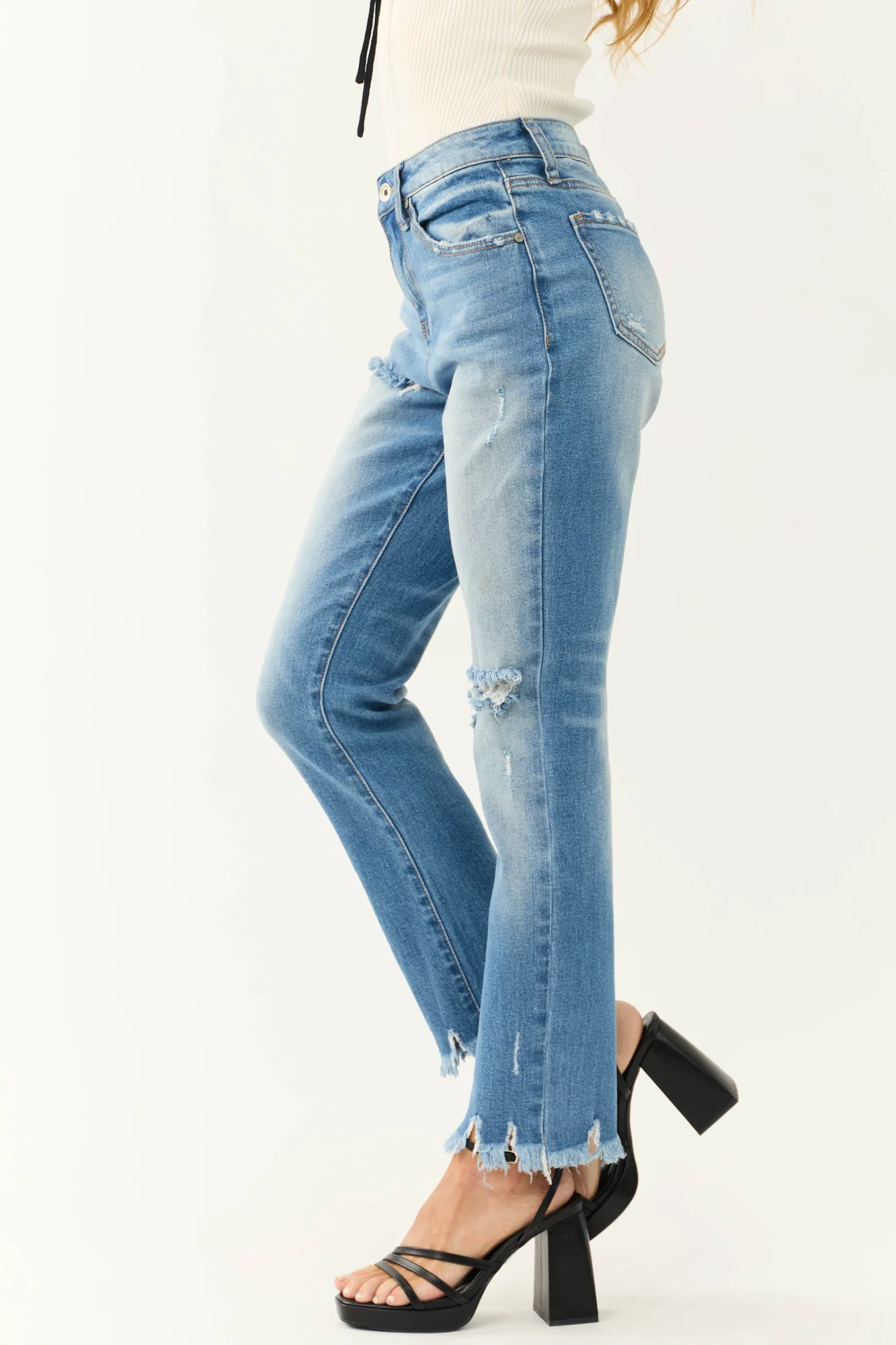 Upgrade your wardrobe with these Medium Wash Relaxed Skinny Jeans . Featuring a high rise fit, ankle length design, and medium distressing with frayed hems, these jeans are both stylish and comfortable. The stretchy denim allows for extra room in the waist, while the 5 functional pockets add practicality. Made of 98.5% Cotton and 1.5% Spandex, these jeans are perfect for casual daytime wear. Care instructions: Wash inside out in cold water, hang dry only. Model is wearing a size 1. Model’s measurements: Height 55″, Bust 31″, Waist 24″.