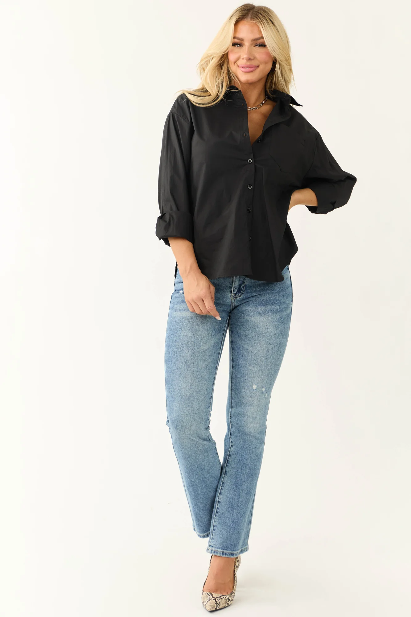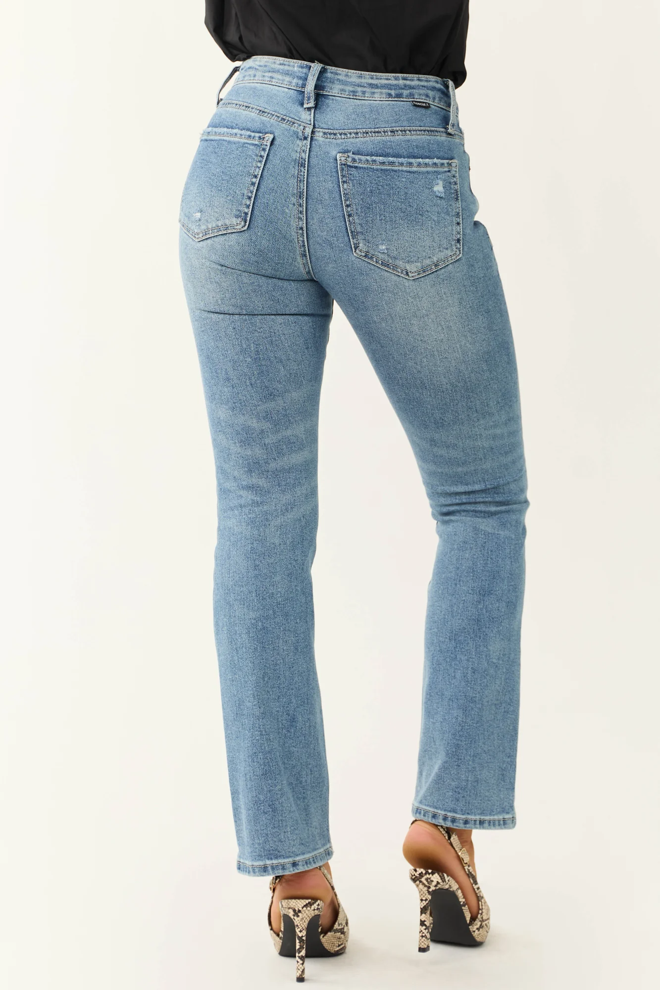 Elevate your denim collection with these medium wash skinny bootcut jeans for women . Crafted from semi-stretchy denim, these jeans feature five functional pockets, belt loops, and a zipper fly with button closure. The slight distressing adds a touch of character to the design. With a flattering mid-rise fit, these jeans have a front rise of 9.5 inches and a back rise of 13 inches, ensuring both style and comfort. Made from 94% Cotton, 5% Polyester, and 1% Spandex, these imported jeans are a wardrobe essential. For best care, wash inside out in cold water with like colors, hang dry only, and avoid ironing. Available in sizes 1 through 15. Model is wearing size 1. Models Measurements: Height 57″, Bust 34″, Waist 26″.