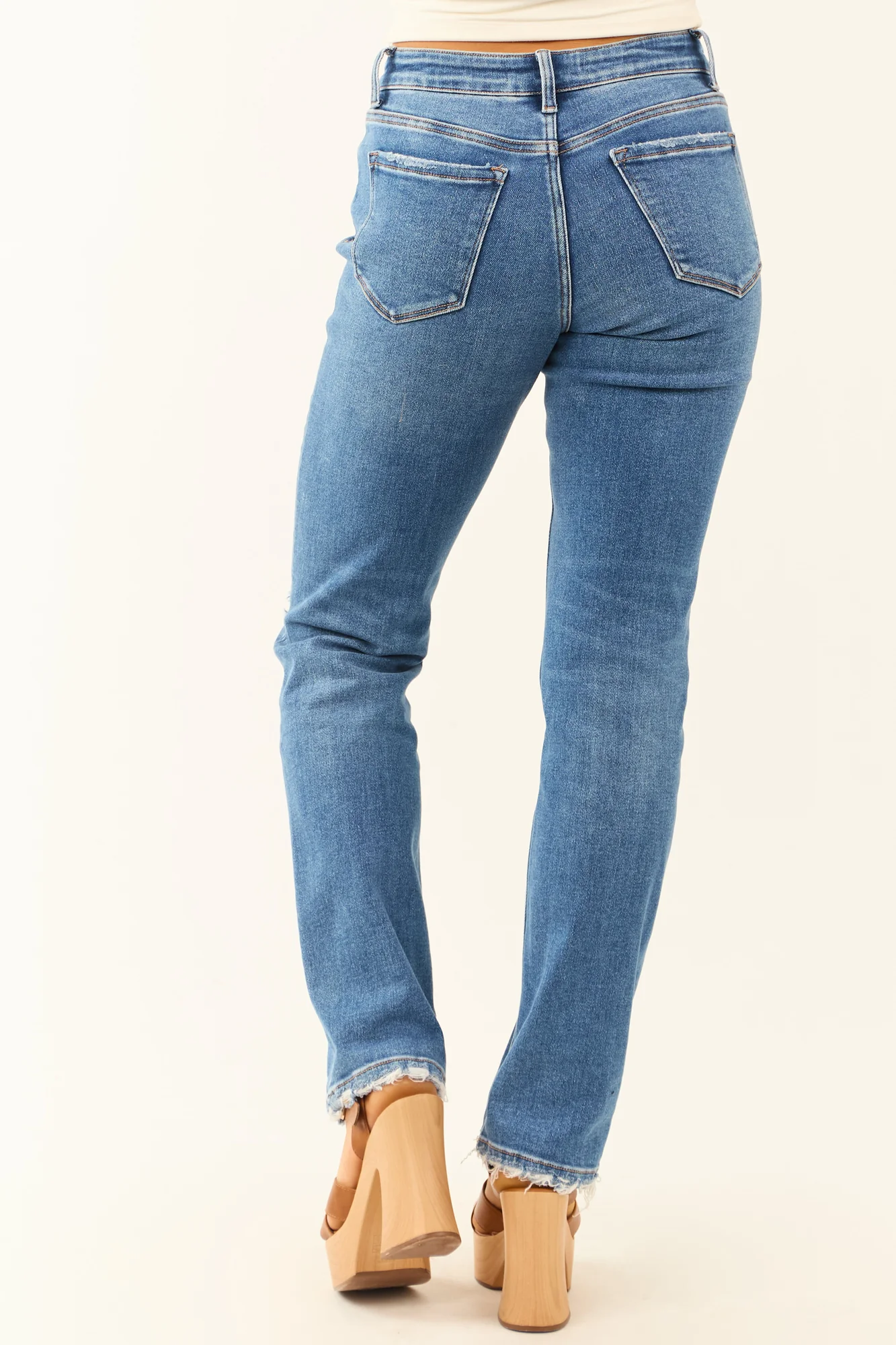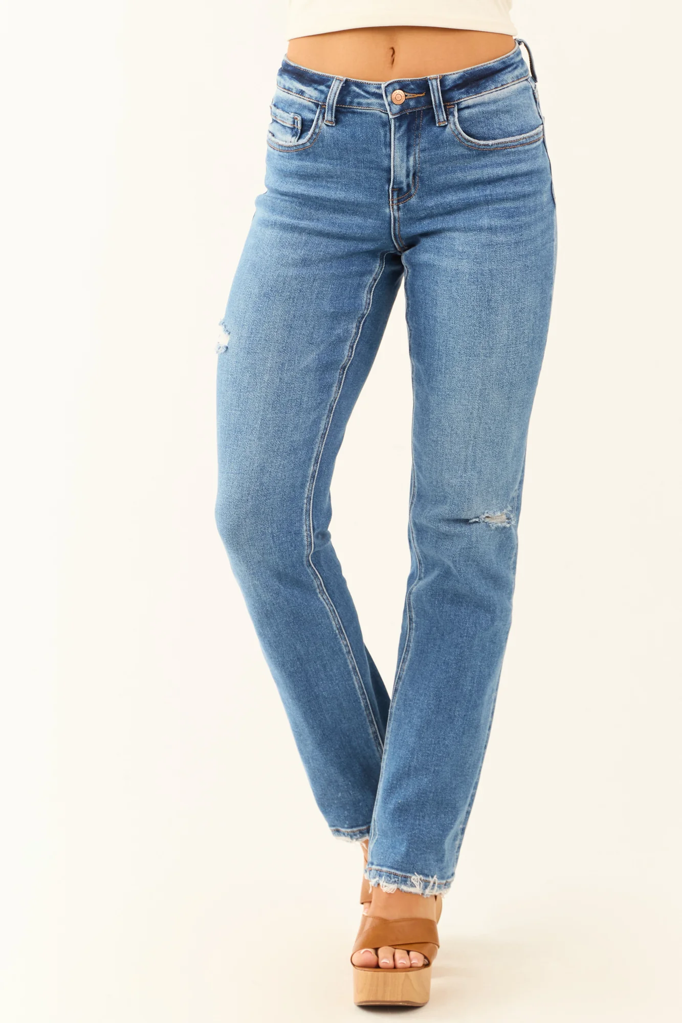 Upgrade your wardrobe with our Medium Wash Slim Straight Tall-Length Stretchy Denim Jeans. Crafted with 93% Cotton, 5% Polyester, and 2% Spandex, these jeans offer a comfortable mid-rise fit with a slightly loose waistband and a more fitted hip area. Featuring distressed hem and pocket details, whiskering, and 5 functional pockets, these jeans are both stylish and functional. Available in waist sizes ranging from 24 to 32, with a 32-inch inseam. Size down for the perfect fit. Imported.