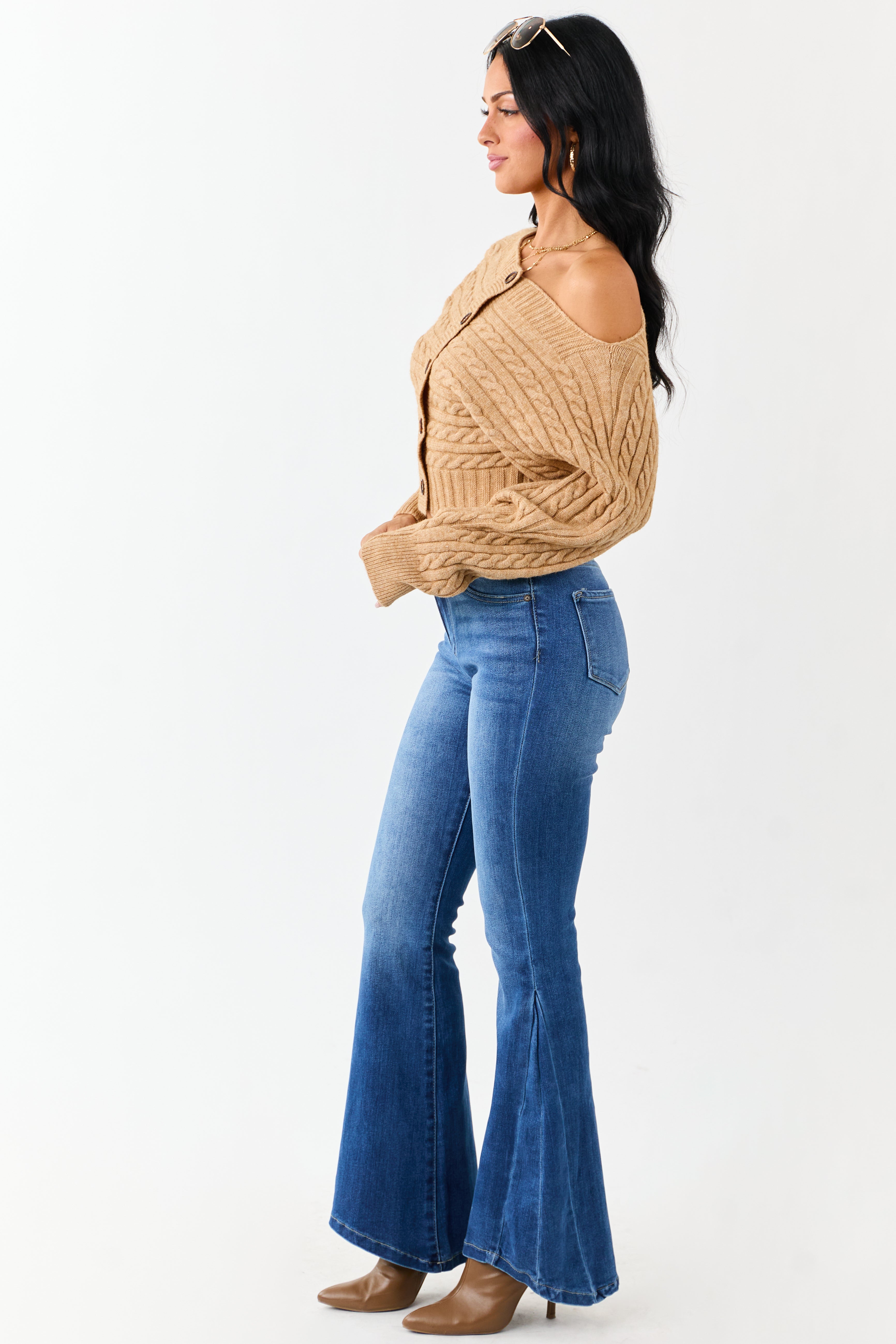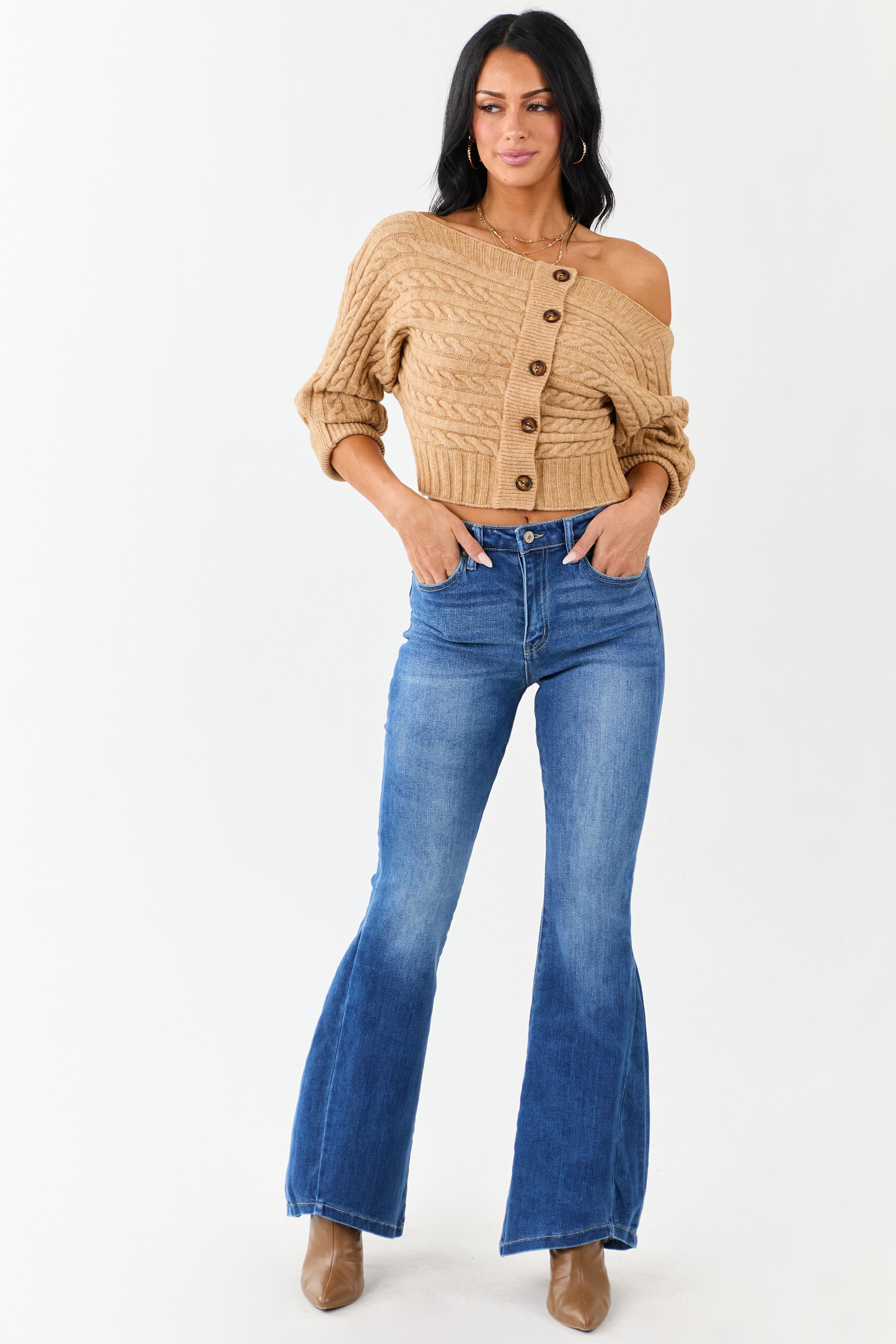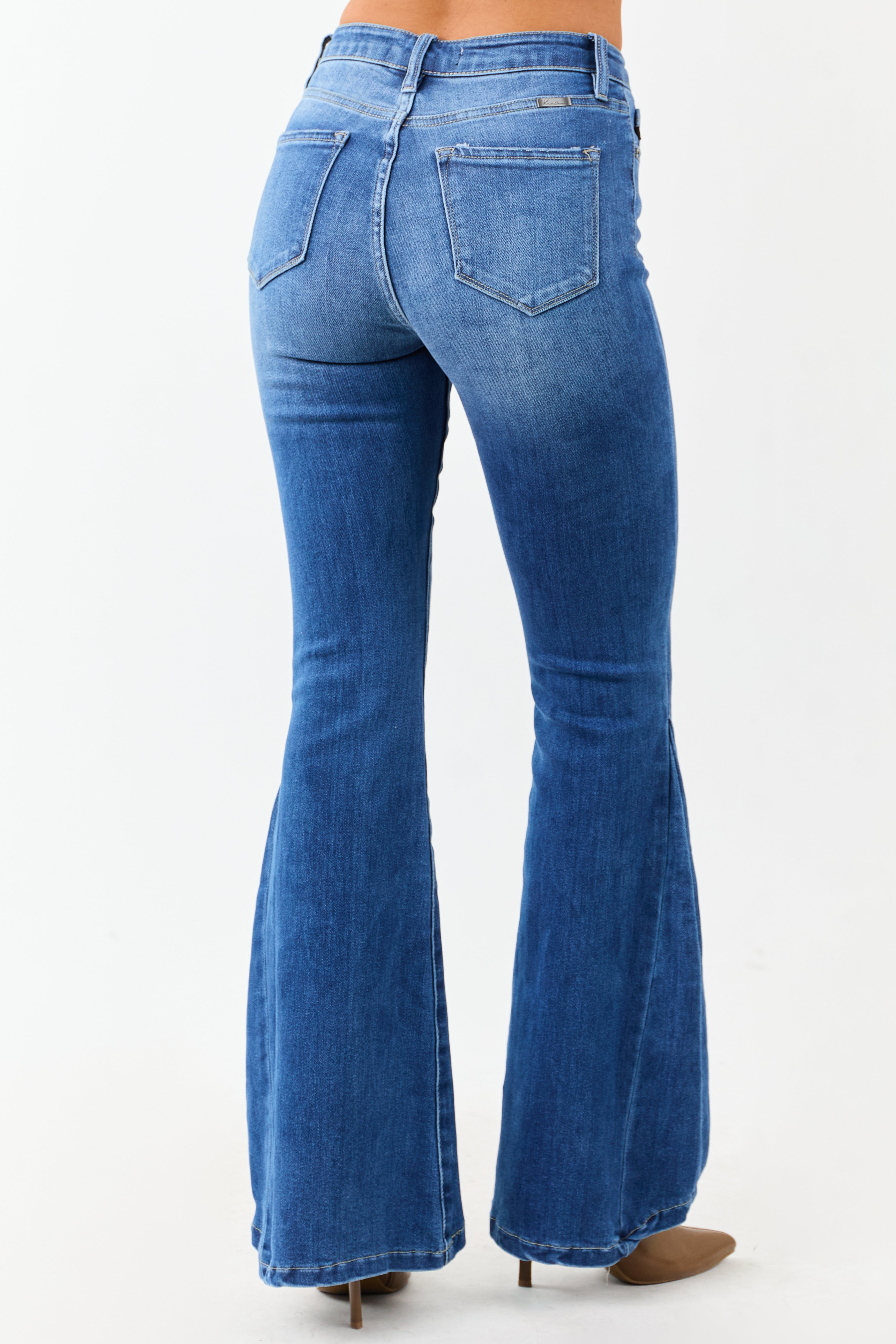 Elevate your denim look with our Medium Wash Tall Flare Leg Jeans for women. Designed to flatter, these high-rise jeans feature a sharp angled hemline and semi-stretchy denim for a comfortable fit. With a front rise of 10.5″ and back rise of 13.5″, these jeans are a must-have. The tall length inseam of 32″ complements your stride perfectly. Enjoy the convenience of a zipper fly with button closure, 5 functional pockets, whiskering details, and belt loops. Crafted from 94% Cotton, 4% T-400, and 2% Spandex for durability and flexibility. Make a statement effortlessly in these stylish jeans.