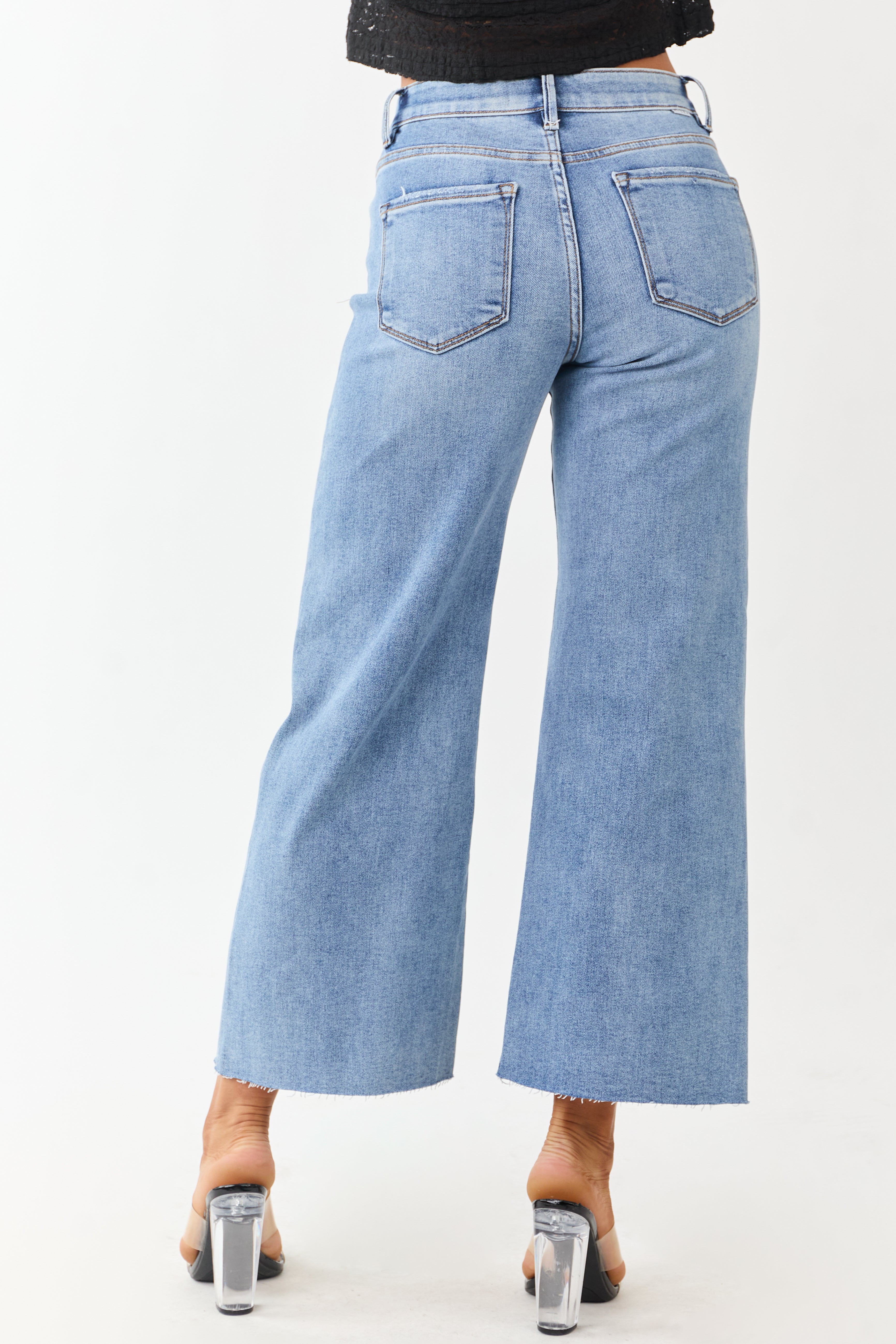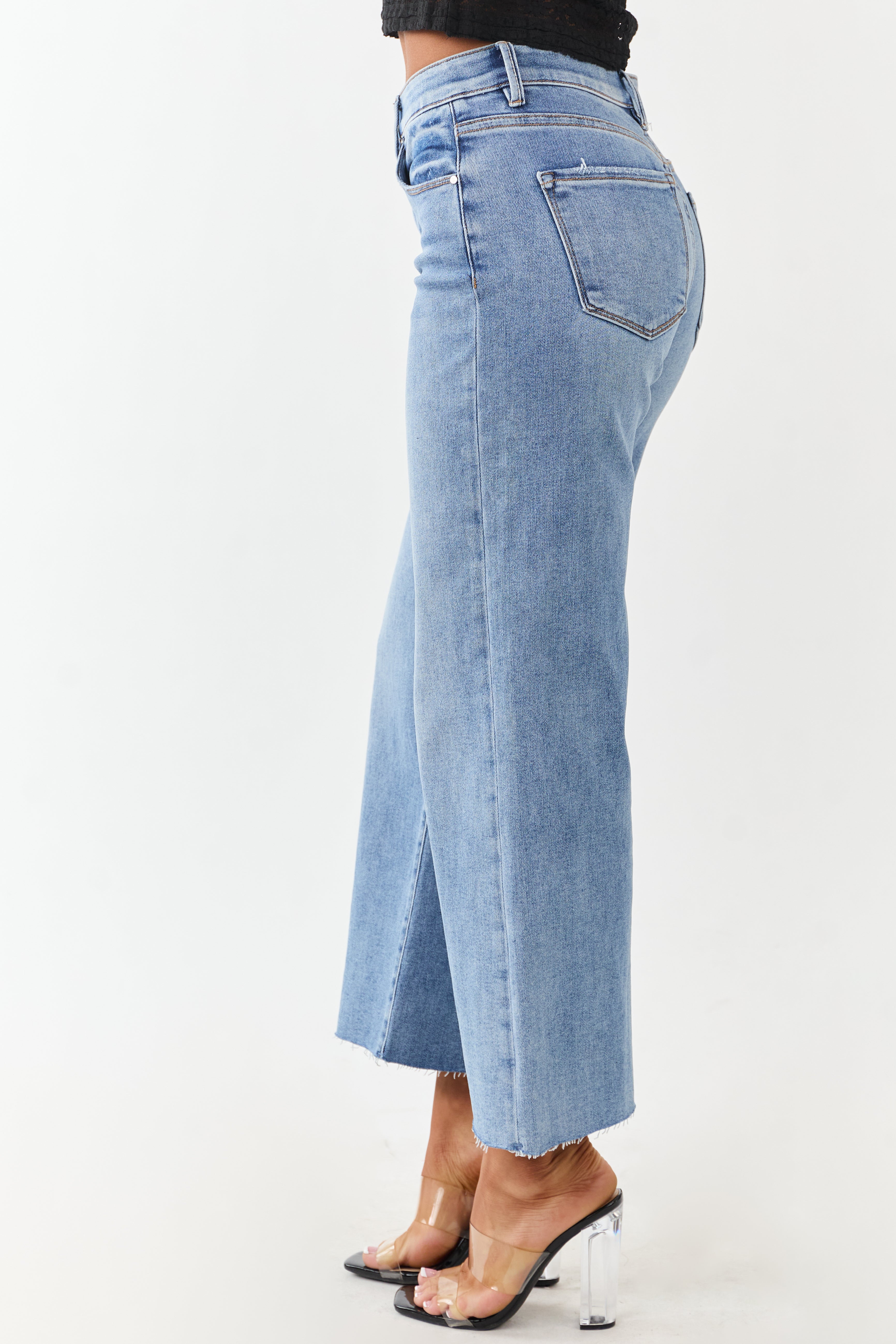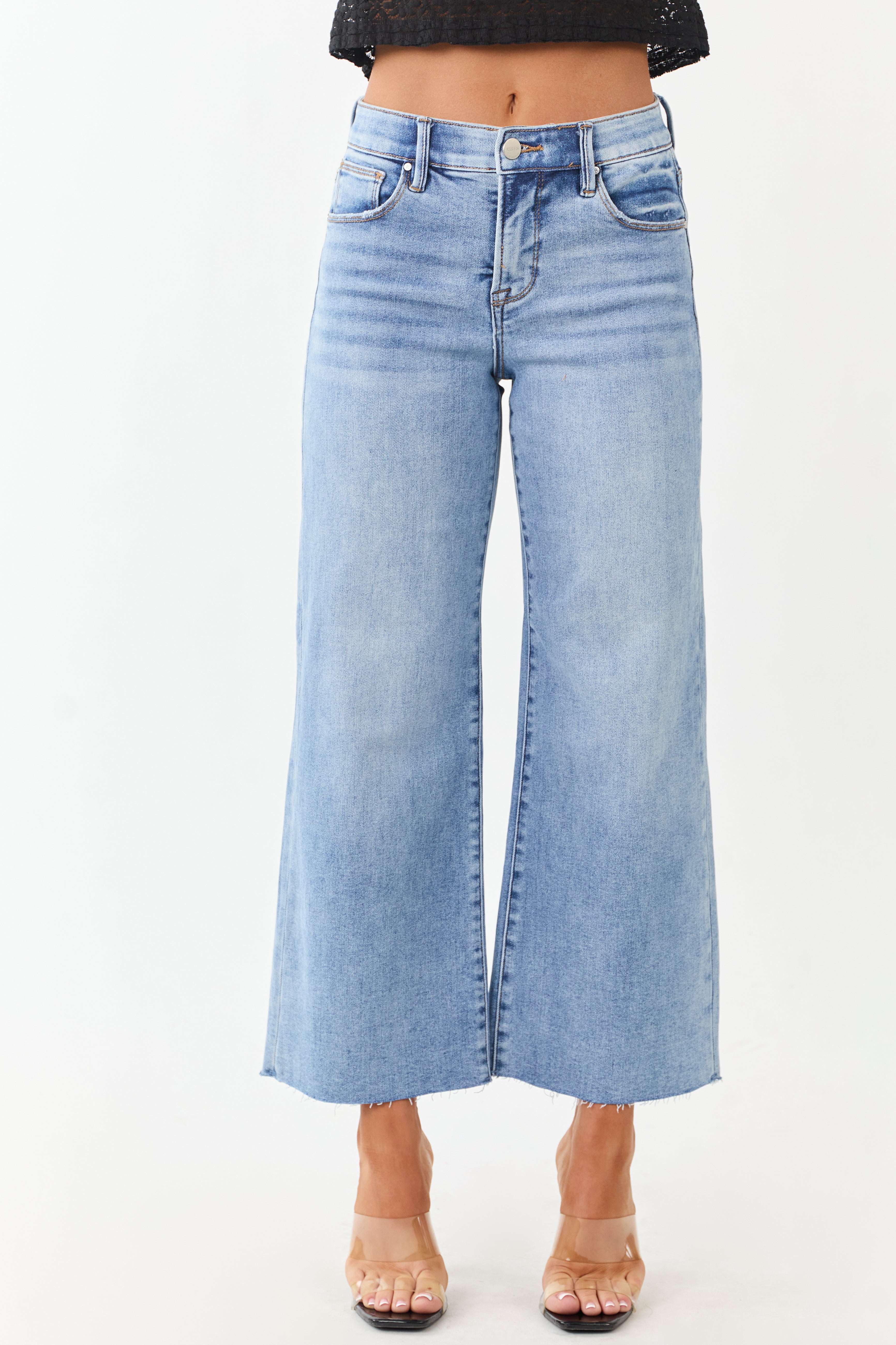 Indulge in the comfort and style of our medium wash tummy control wide leg crop jeans designed to fit true to size. Crafted from stretchy denim with a hidden inner leopard print waistband, these jeans feature a high rise, raw cut off hem, and five pockets for your convenience. The zipper fly with button closure and belt loops add a touch of practicality to this fashionable piece. Made of 80% Cotton, 18% Polyester, and 2% Spandex, these imported jeans offer both quality and trendiness. Model is 57″ tall, wearing a size 3 with a bust of 35″ and a waist of 26″.