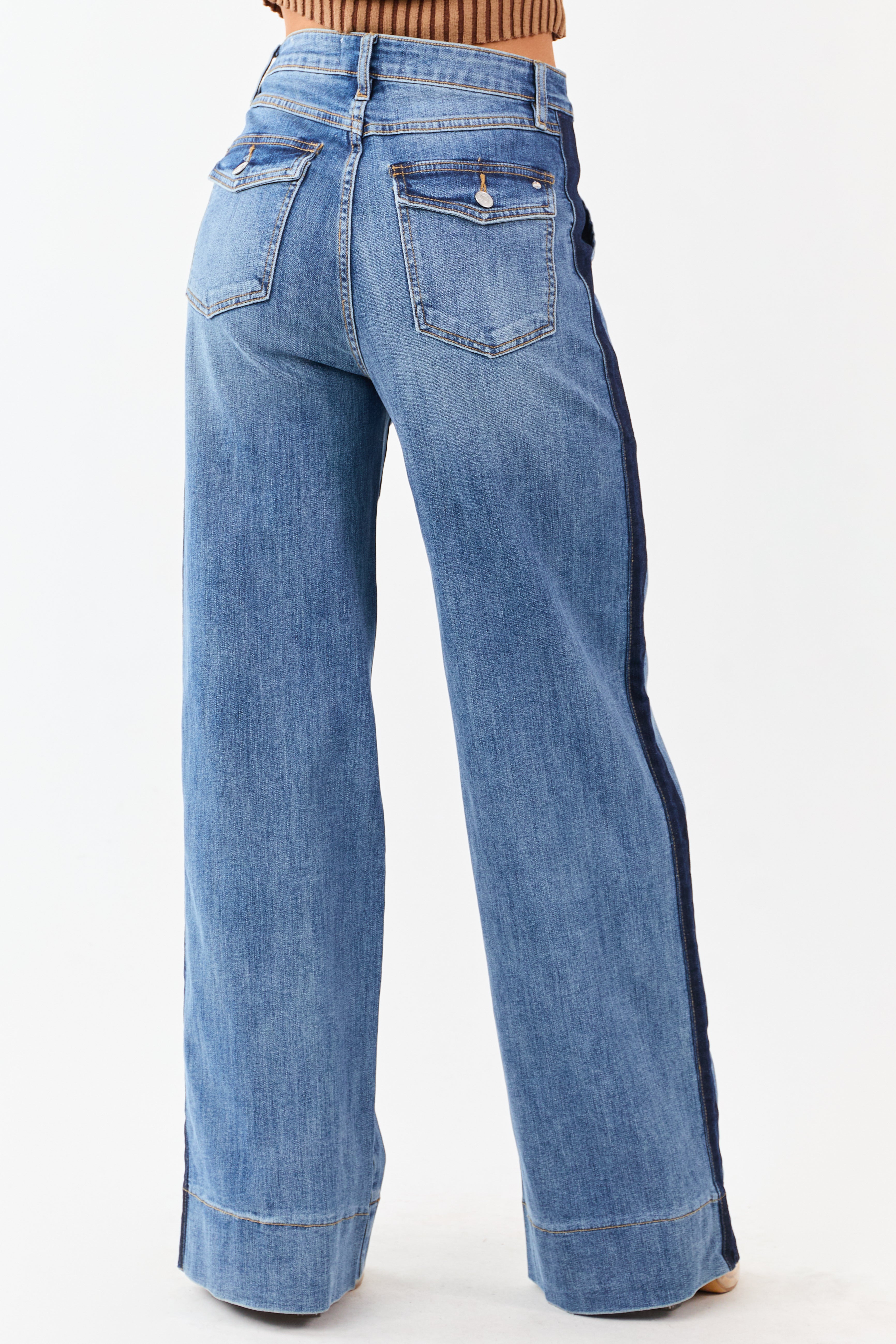 Elevate your style with our Medium Wash Tux Style Wide Leg Denim Jeans. Crafted from stretchy denim, these jeans feature a dark wash side line for an elongating effect. True to size with a high-rise waist for extra comfort. Perfect for versatile styling for all occasions. Stand out with confidence in these premium jeans.