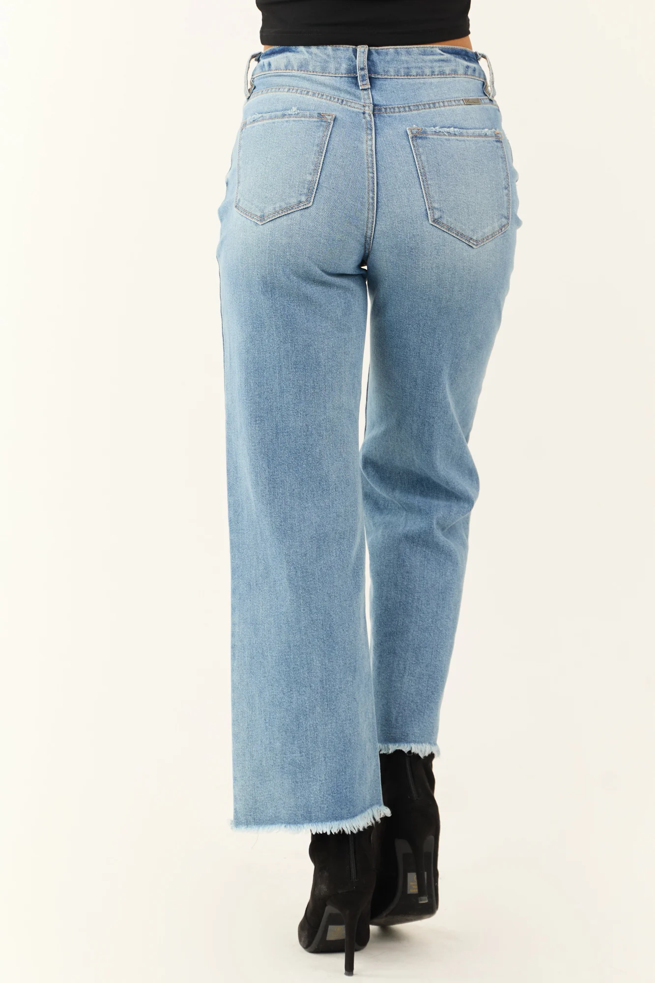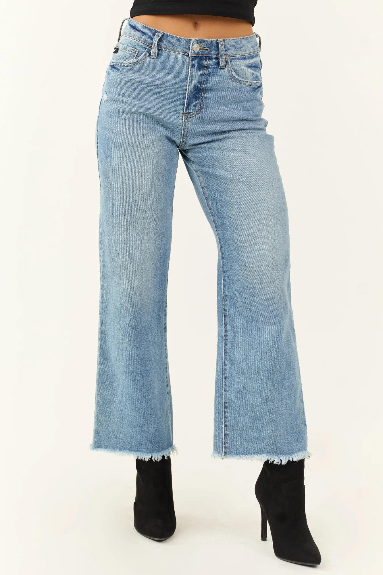 Discover the perfect mix of style and comfort with our Medium Wash Wide Leg Frayed Denim Jeans in sizes 1 through 15. Made from quality non-stretchy denim, these high rise jeans feature a zipper fly, button closure, five pockets, and belt loops. The ankle-length design with frayed hems adds a trendy touch. Crafted with a blend of 67% Cotton, 30% Polyester, 2.5% Rayon, and 0.5% Spandex, these jeans offer a flattering fit and durability. Machine washable. Model is 55″ tall, wearing size 1.