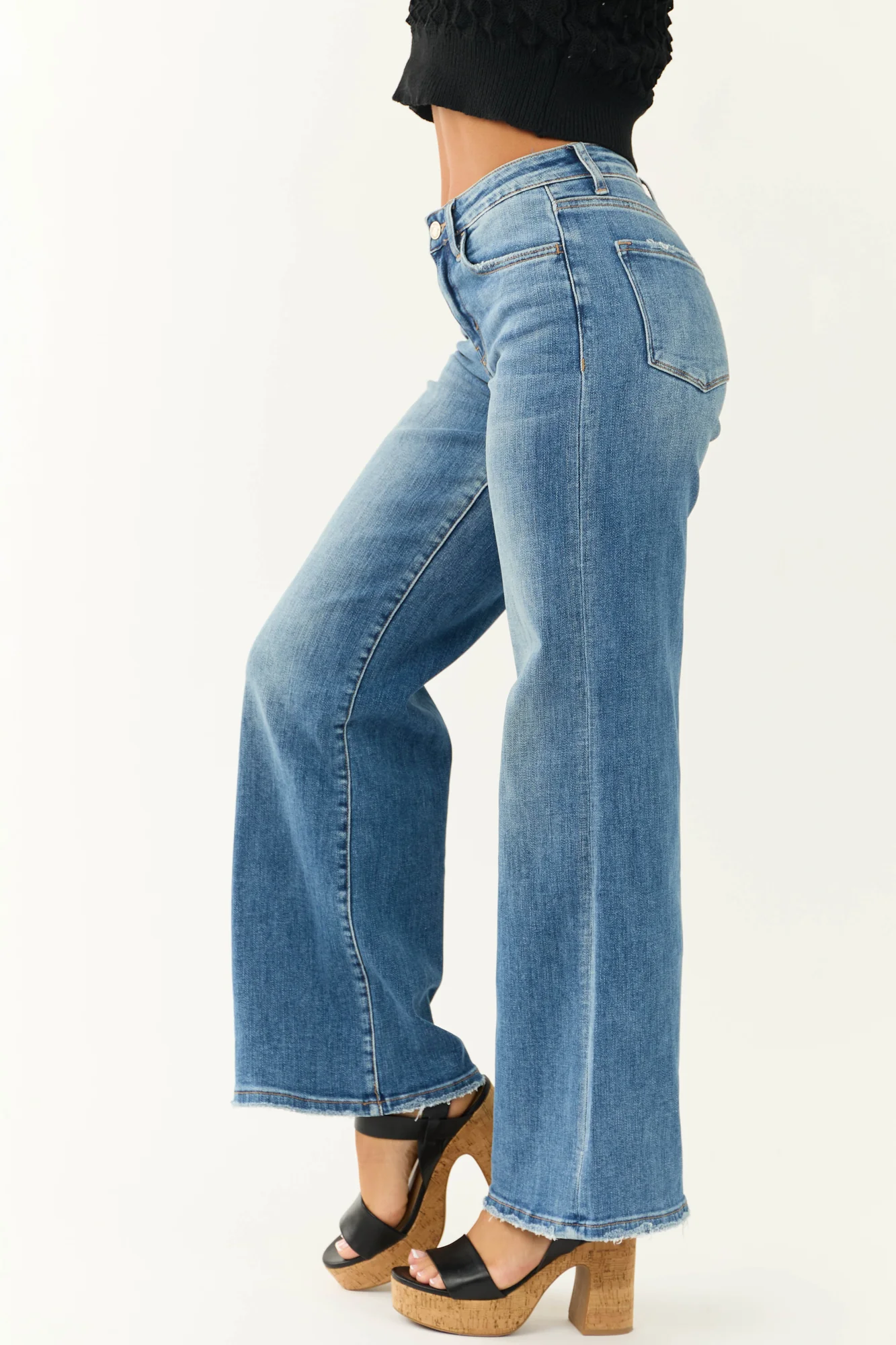 Achieve style and comfort with our Medium Wash Wide Leg High Rise Denim Jeans. Featuring a waistband that fits slightly loose, stretchy denim for flexibility, zipper fly with button closure, 5 pockets, belt loops, and light distressing on hem and pocket lining. Available in waist sizes 24 to 32 and inseam length of 32 inches. Front rise varies from 9.5″ to 12″, back rise from 12.5″ to 15″. Made of 98% Cotton and 2% Spandex for a perfect fit. Machine wash cold, tumble dry low, warm iron if needed. Model is wearing size 24.