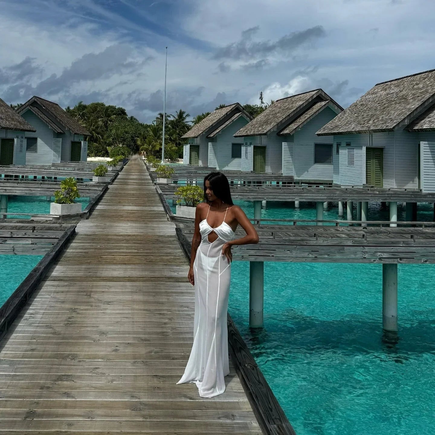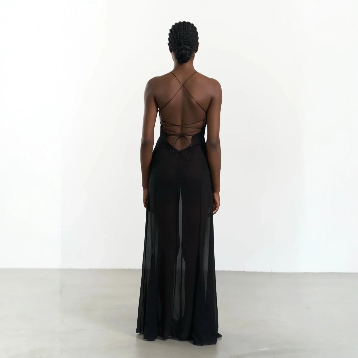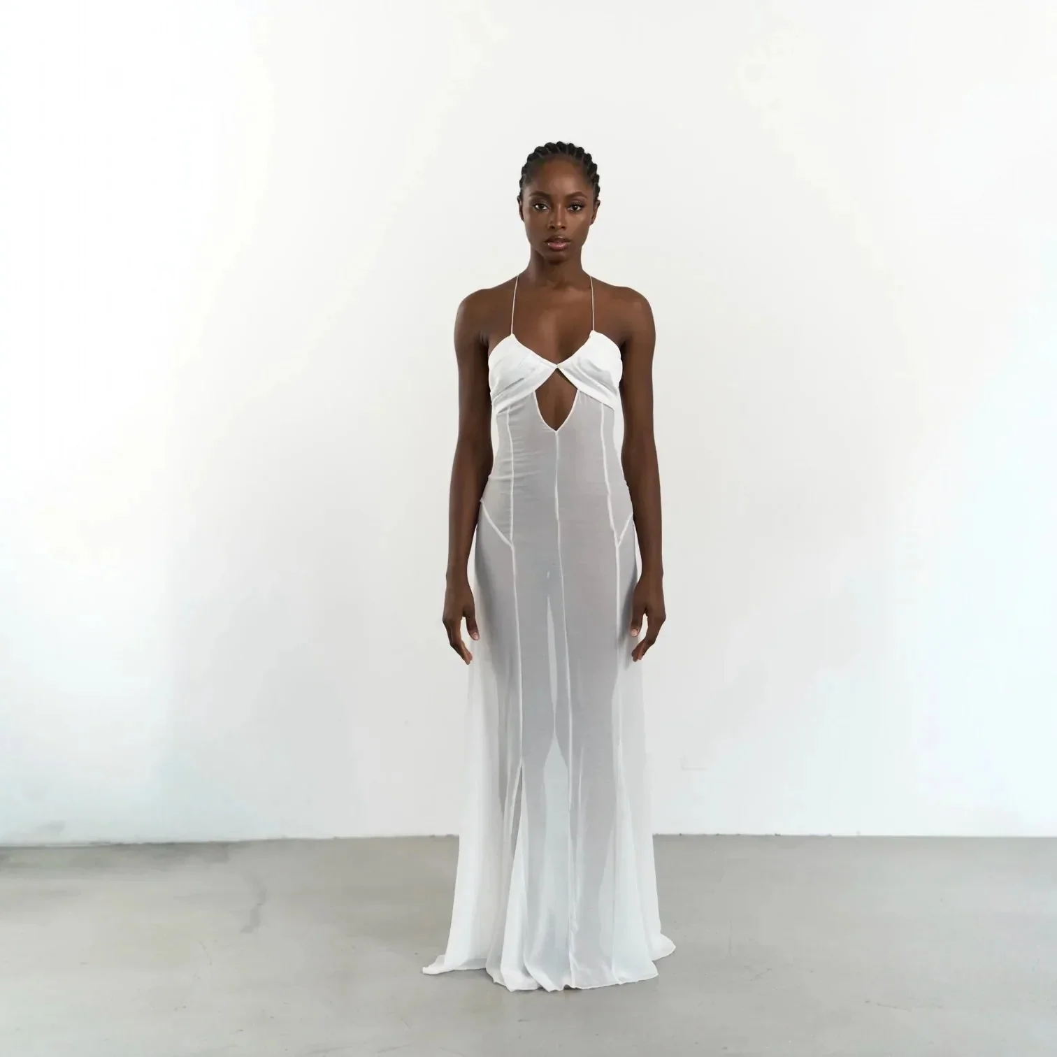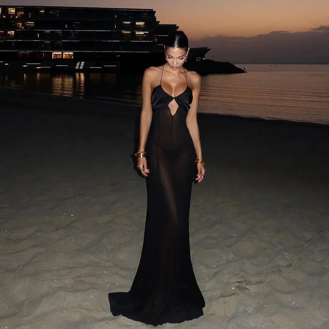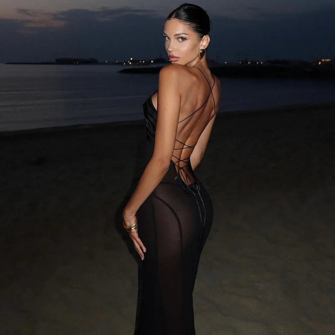 Elevate your evening look with our stunning Mesh Criss-Cross Lace-Up Maxi Dress. Made from luxurious sheer mesh, this floor-length dress showcases a sculpted bust with a daring center cutout and adjustable halter straps. The open back features a chic criss-cross lace-up design, exuding elegance and charm. Perfect for special occasions, this dress offers a form-fitting silhouette that is sure to turn heads. Whether worn alone for a bold statement or layered for a unique style, this dress is a versatile wardrobe essential. Discover endless style inspiration on our Instagram @mermaid_way. Enjoy a perfect fit with our complimentary size exchange offer.