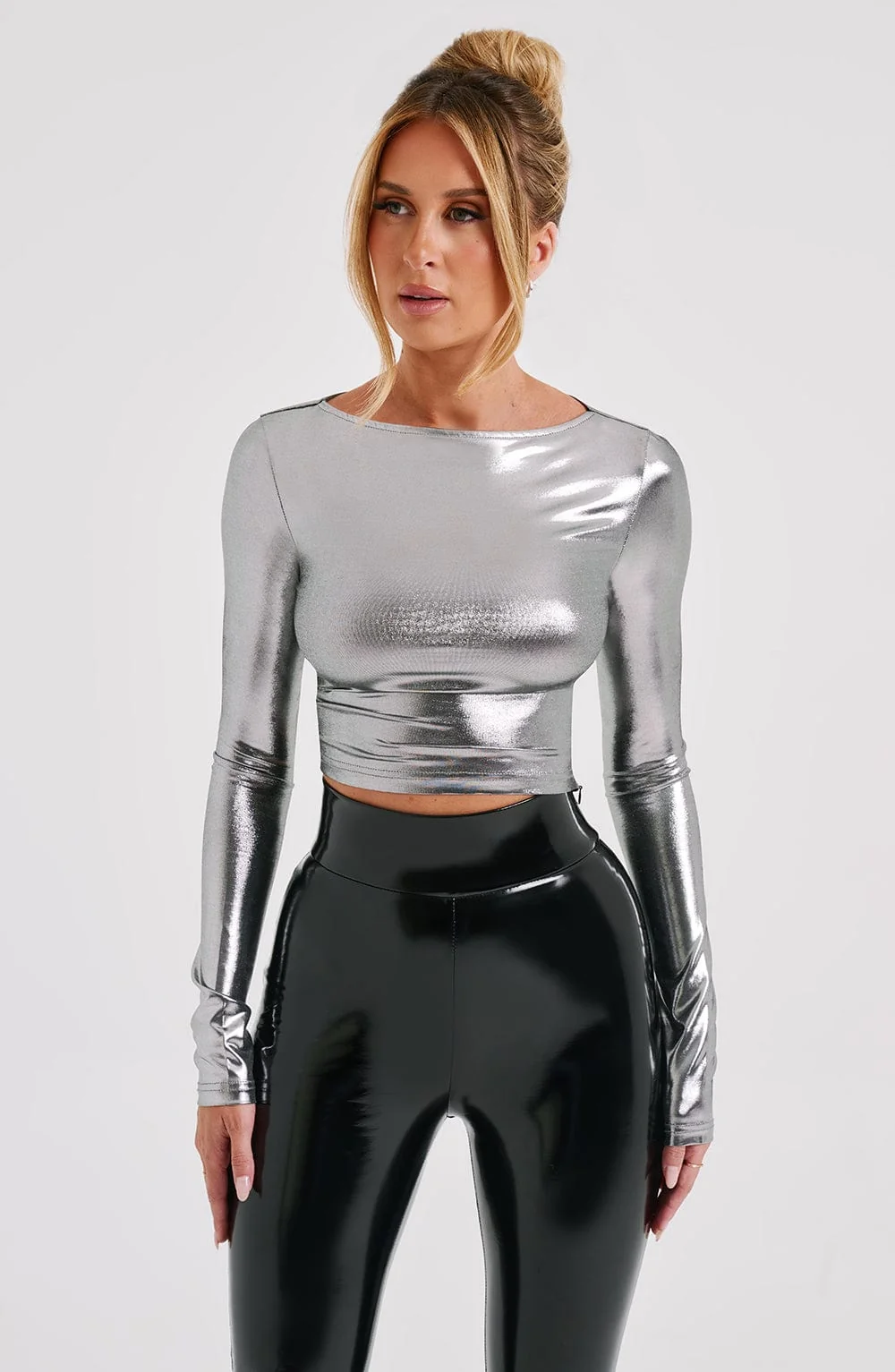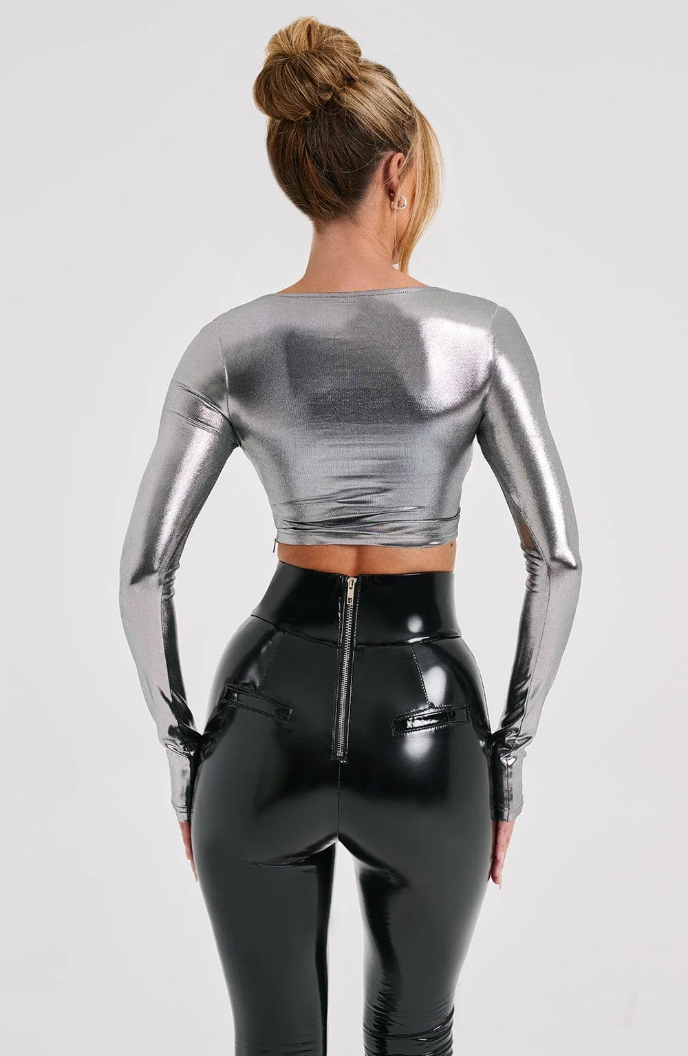 Metallic Gunmetal Kyranni Cropped Top – Luxe Jersey, Long Sleeve
