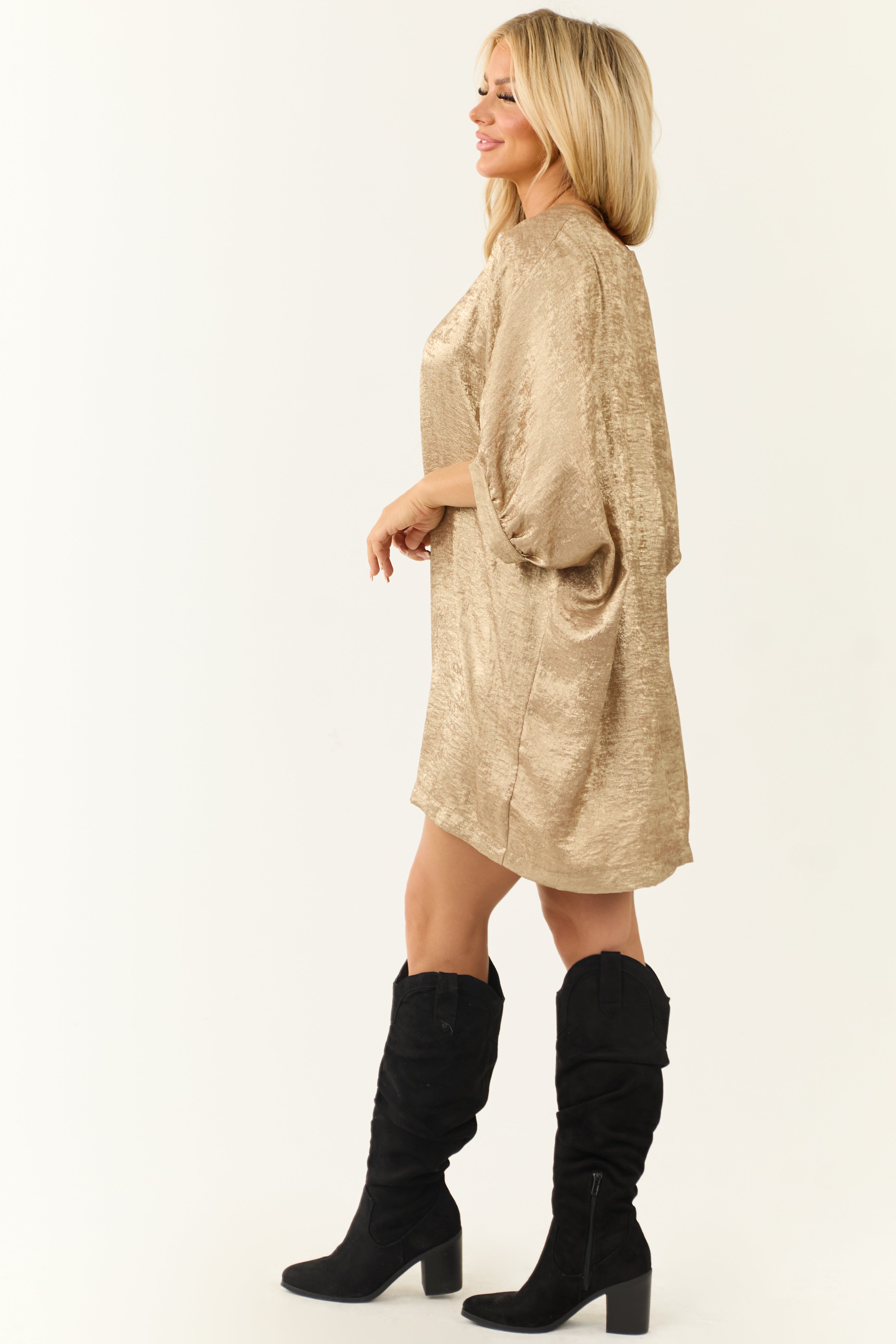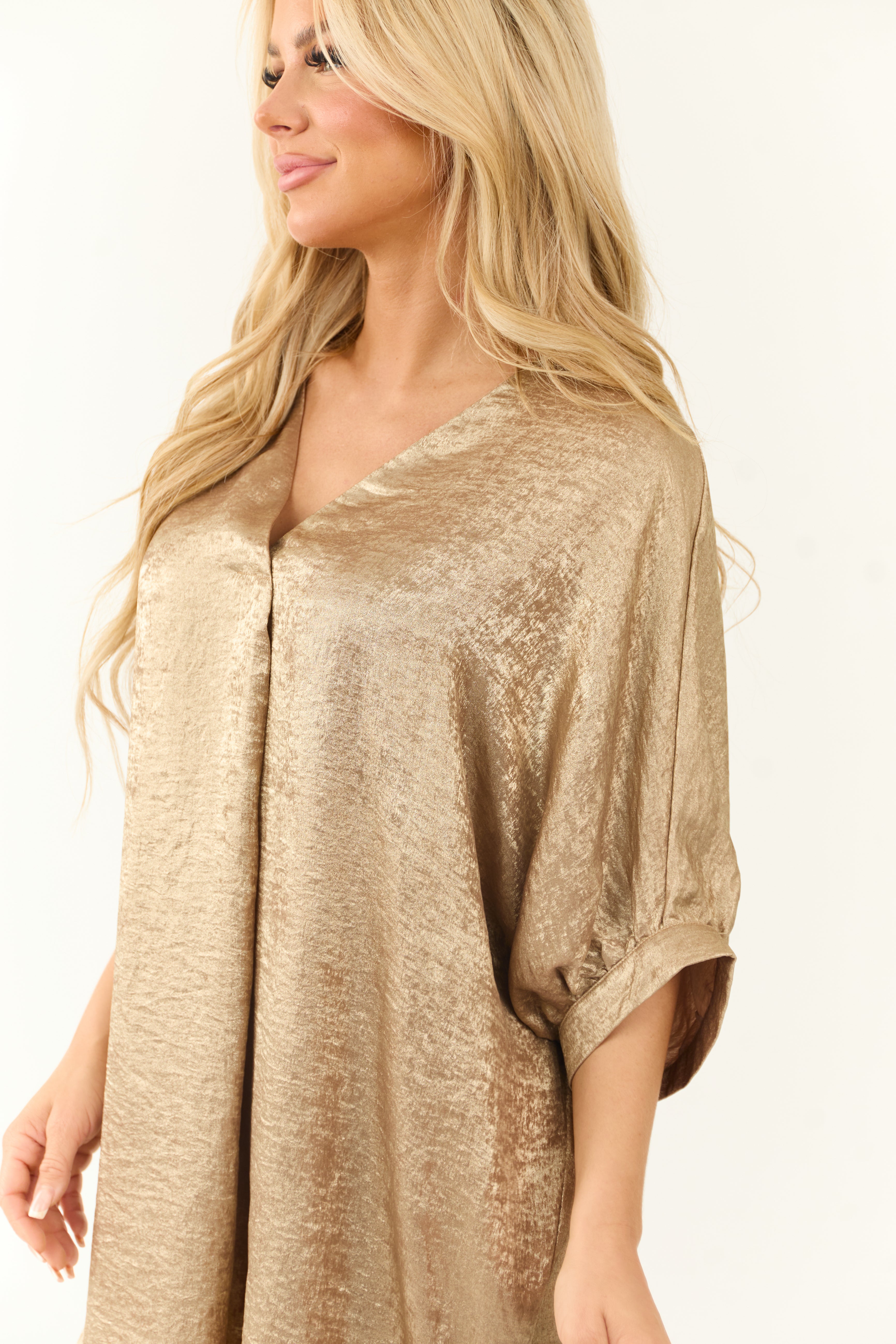 Make a fashion statement with our glamorous Metallic V Neck Half Sleeve Mini Dress in Gold. Crafted from non-stretchy woven metallic foil material, this dress features chic Kimono half sleeves, banded cuffs, and a flattering unlined design. Shine bright at any occasion with this imported 100% Polyester dress. Dry clean only recommended to maintain the stunning color. Model is wearing size Small. Perfect for your next night out!