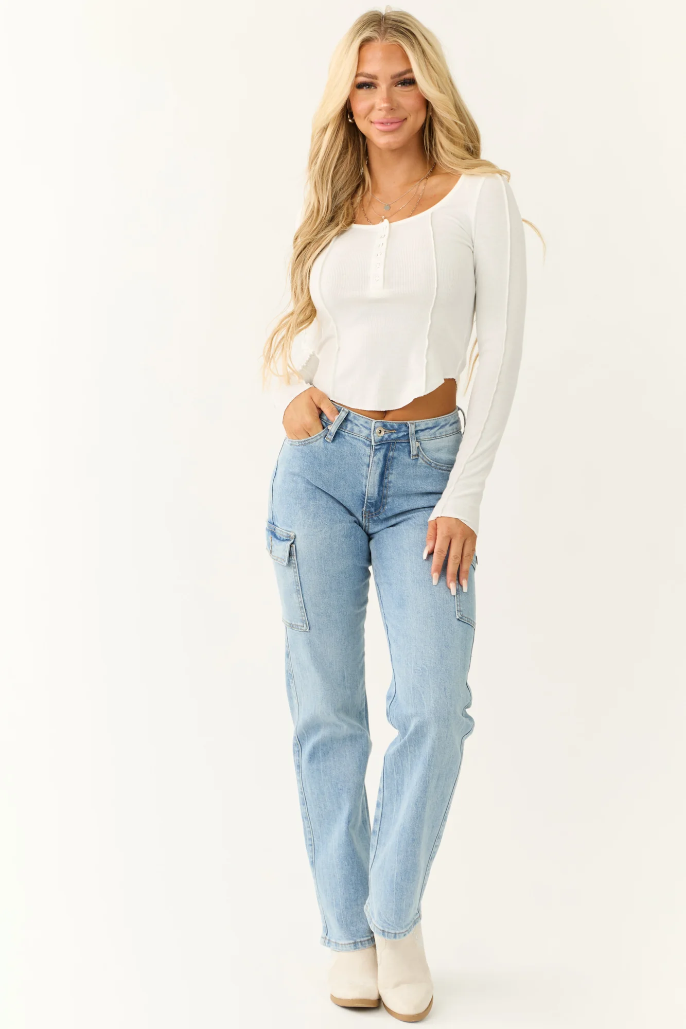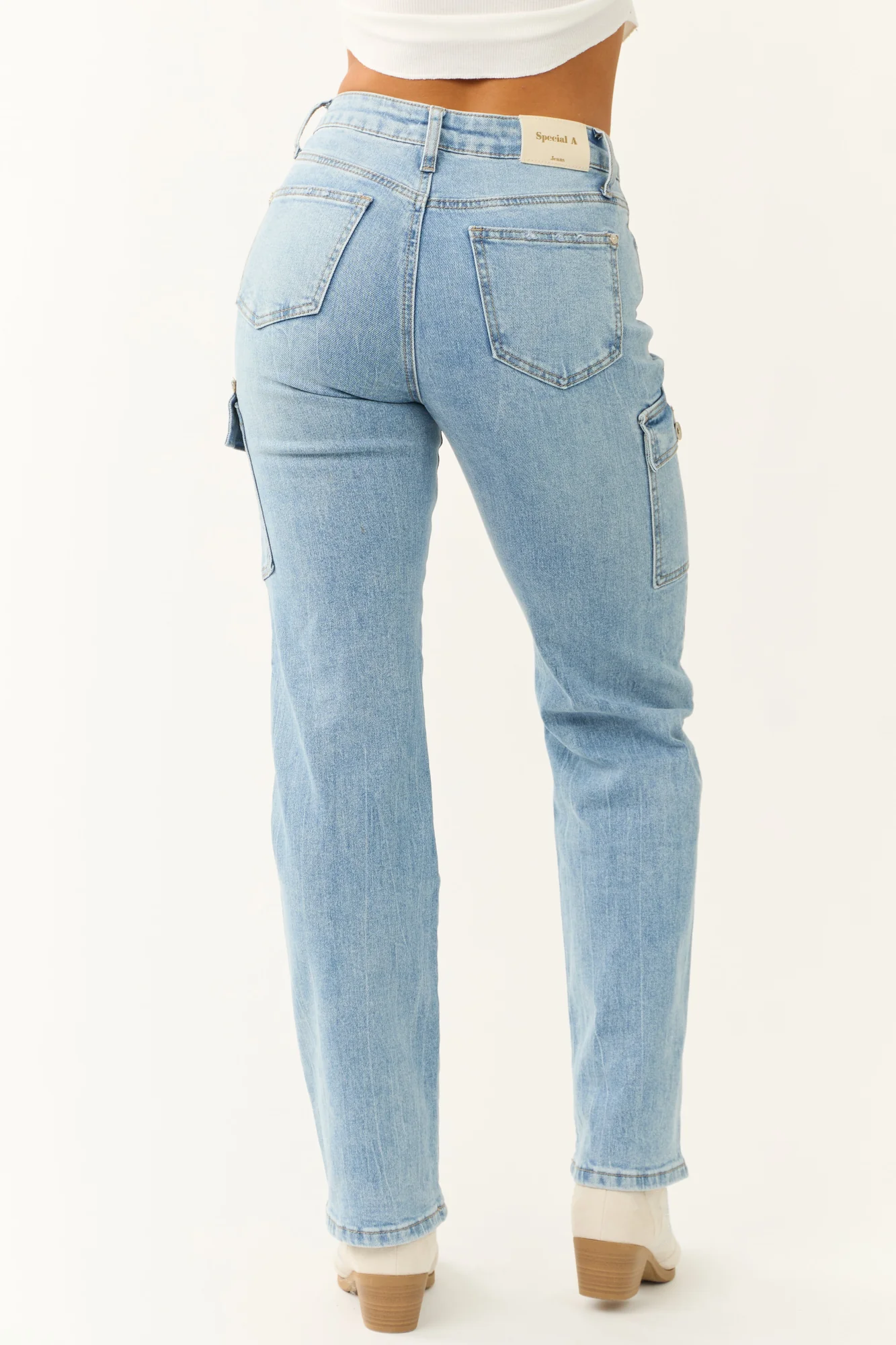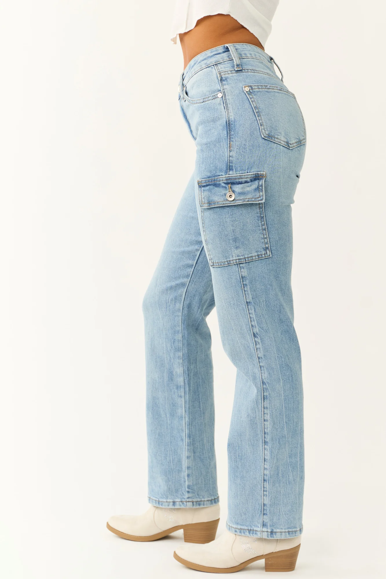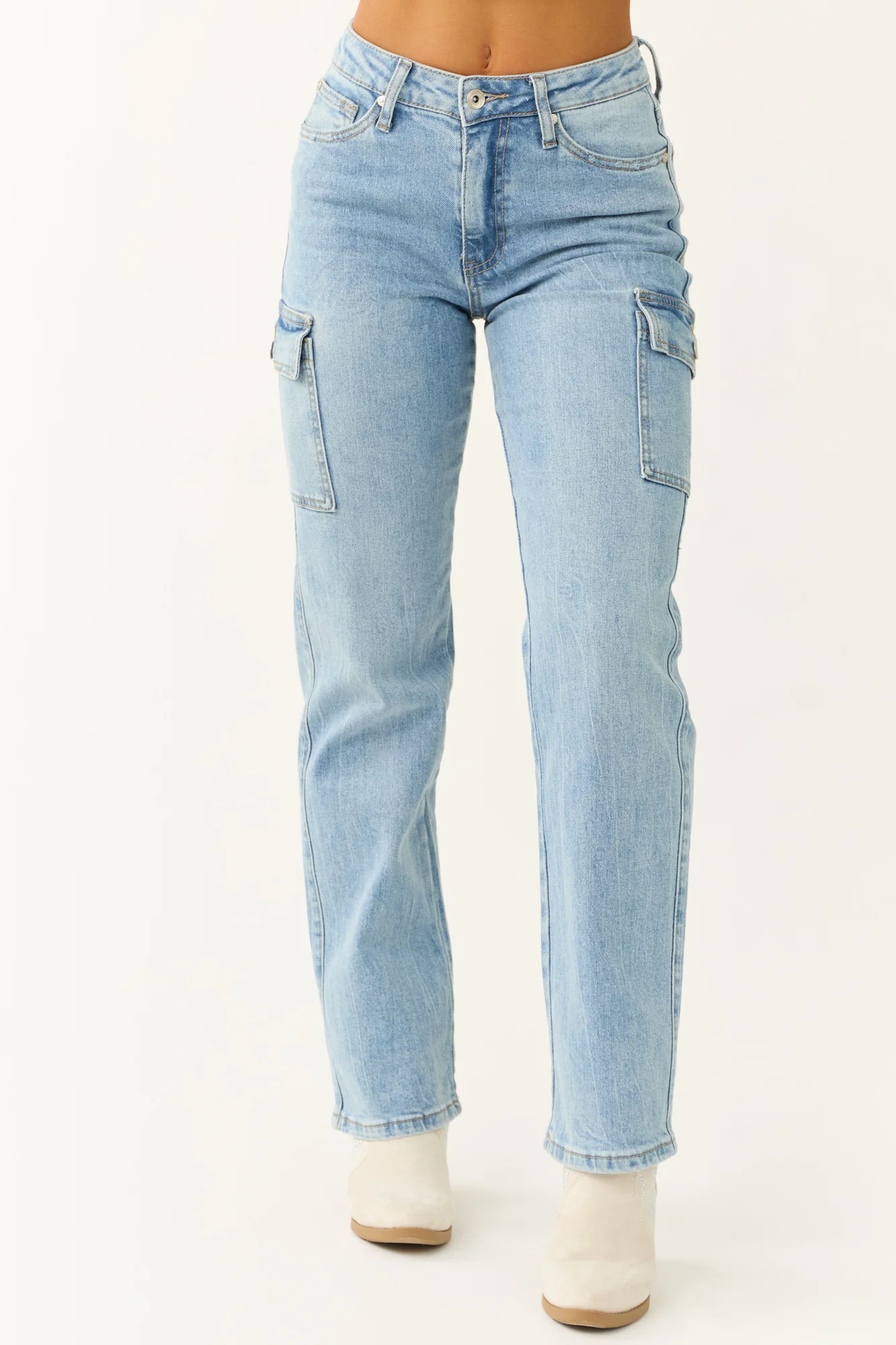 Experience ultimate comfort and style with our Mid-Rise Blue Cargo Jeans for women. These jeans feature a high rise, wide leg design, and stretchy denim for a perfect fit. The 7 functional pockets and cargo pockets add a trendy touch, making these jeans perfect for casual and daytime occasions. Crafted from 94% Cotton, 5% Polyester, and 1% Spandex for durability and comfort. Available in sizes ranging from 1 to 15. Model is wearing size 1 – Height 57″, Bust 34″, Waist 26″. Get yours now!