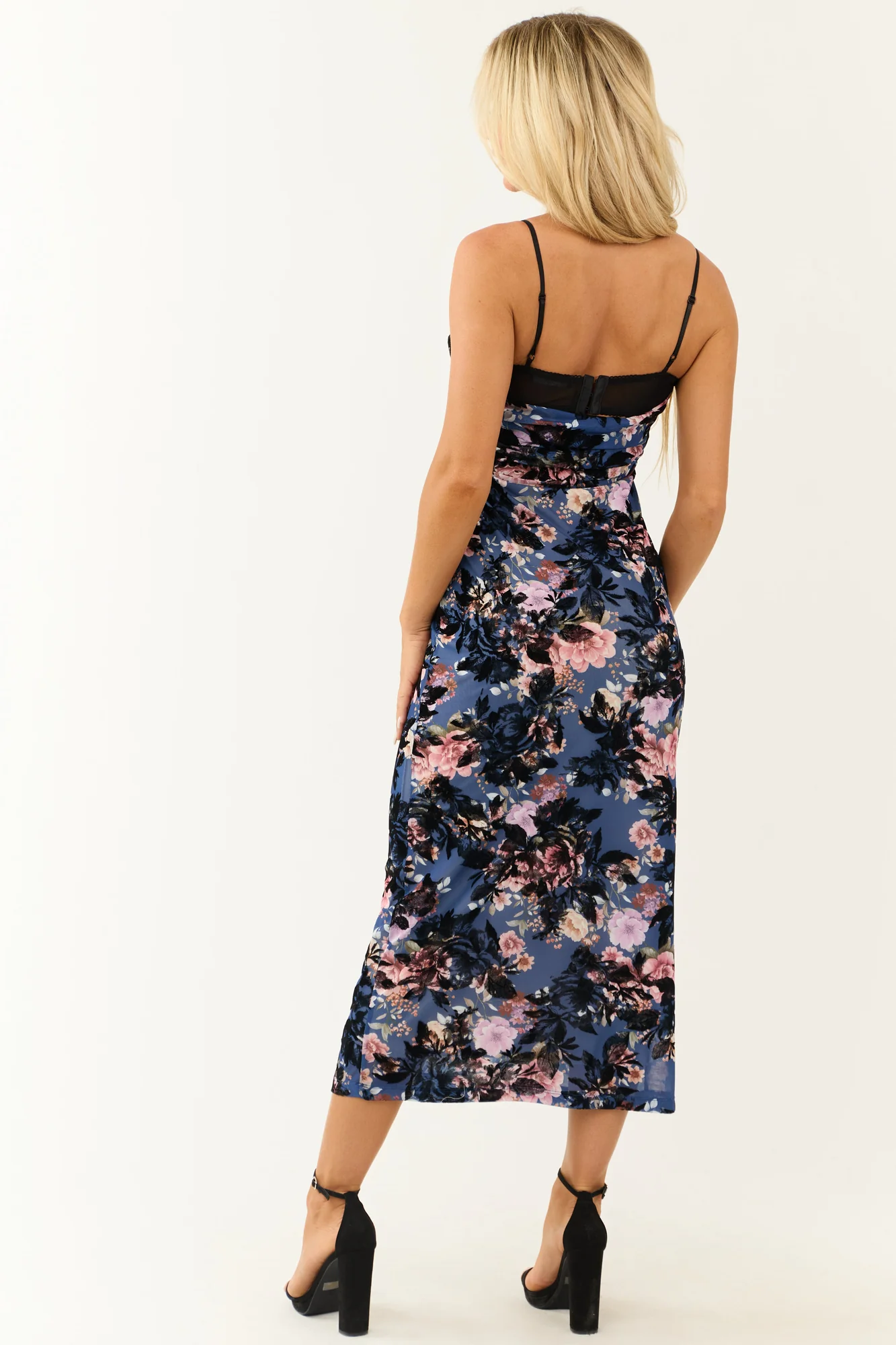 Elevate your evening with our Midnight Floral Mesh Velvet Midi Dress in sizes S, M, and L. Featuring a bodycon fit with stretchy mesh and velvet floral burnout design in Ivory, Peach, Lilac, Watermelon, Sunset, and Desert. This elegant dress offers a cowl neckline, adjustable spaghetti straps, and ruched sides for a flattering silhouette. Perfect for date nights and special occasions. Hand wash cold. Model size: 57, Bust 34, Waist 26.