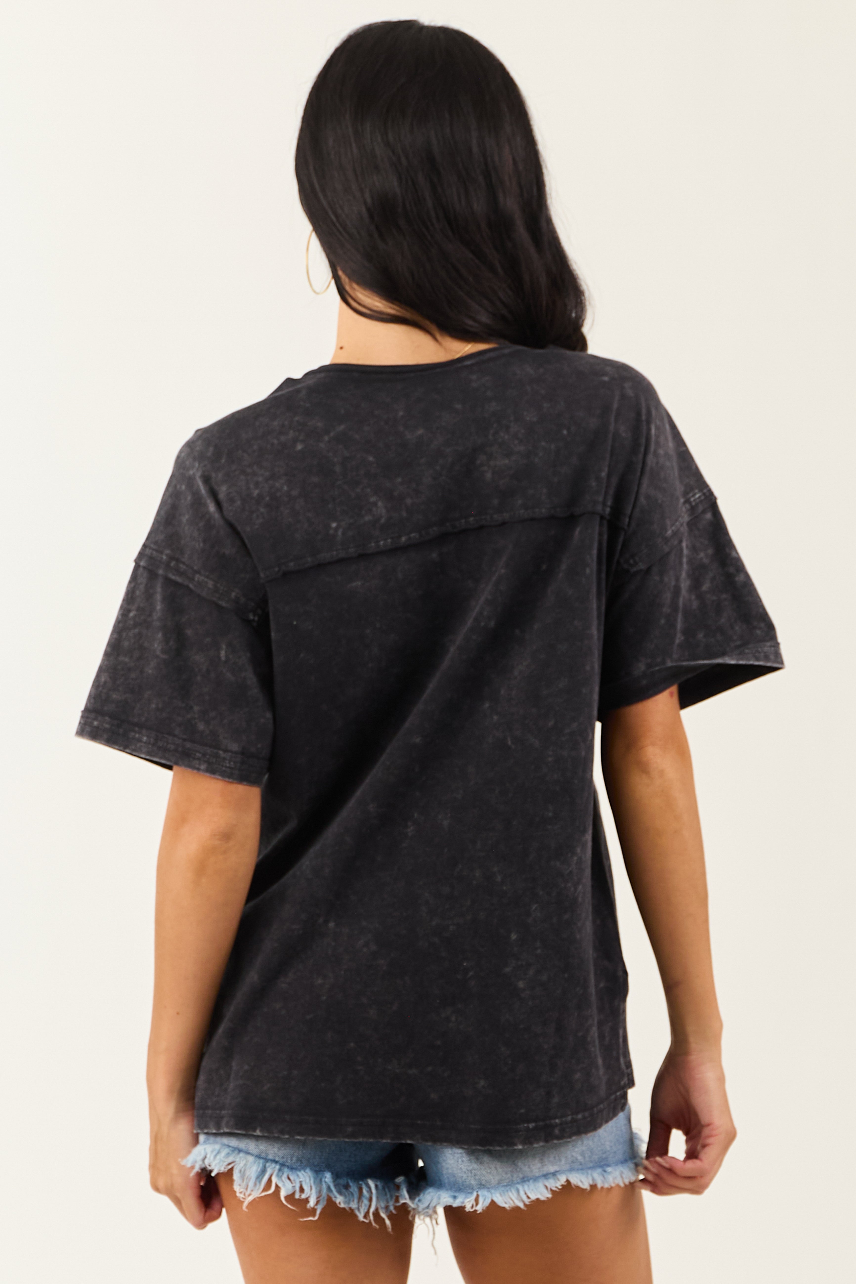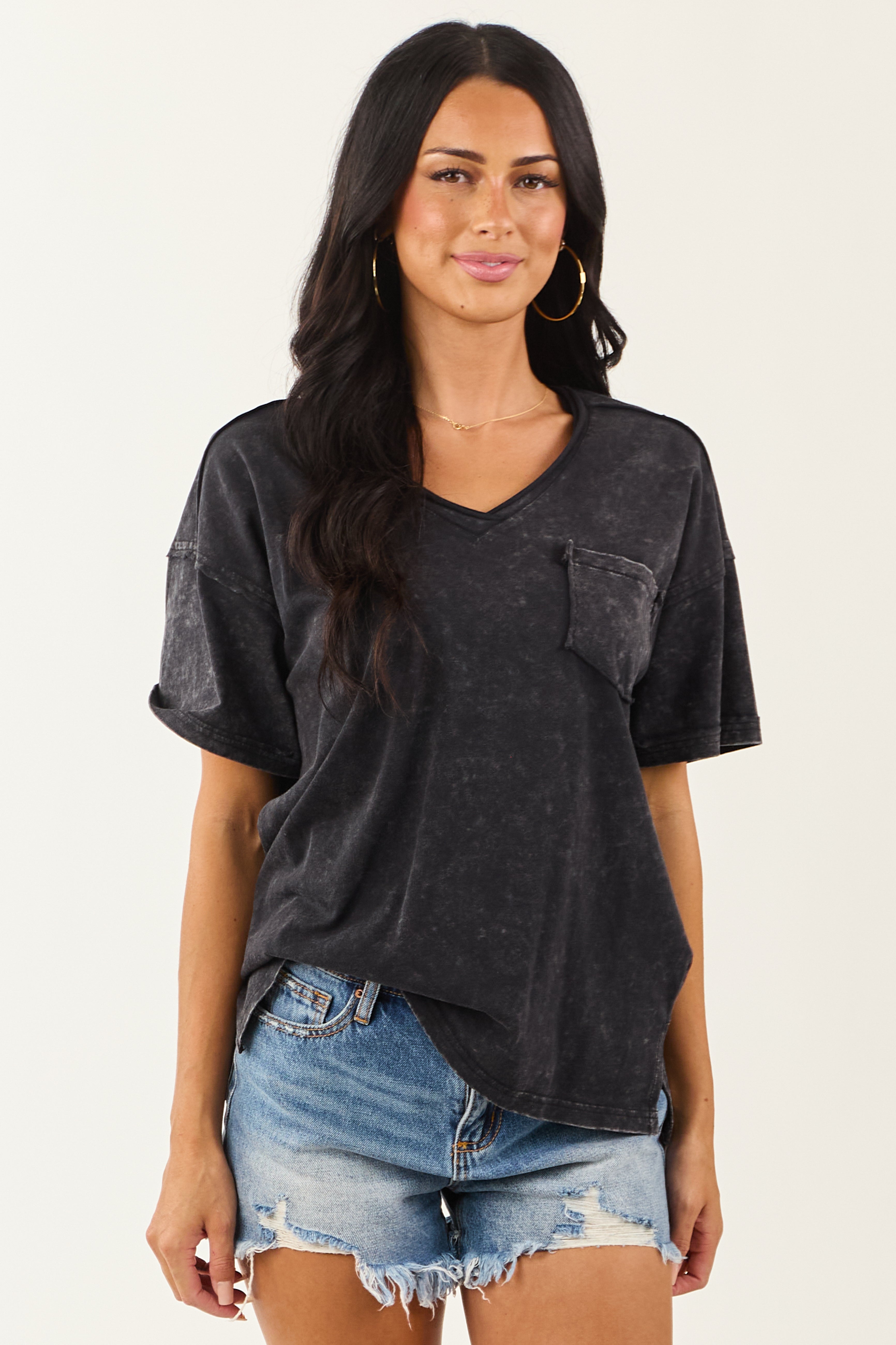 This soft mineral washed tee in black offers an oversized fit and breathable cotton feel. It features a stretchy cotton fabric, front pocket, drop shoulder, and side slits for added style and comfort. Made of 100% imported cotton, this top comes in sizes S, M, and L with bust measurements ranging from 40″ to 44″ and length options from 26″ to 27″. The sleeve length varies from 11″ to 12″. Model is wearing a size Small. Model’s Profile: Size 1, Height 59″, Bust 34″, Waist 26″.