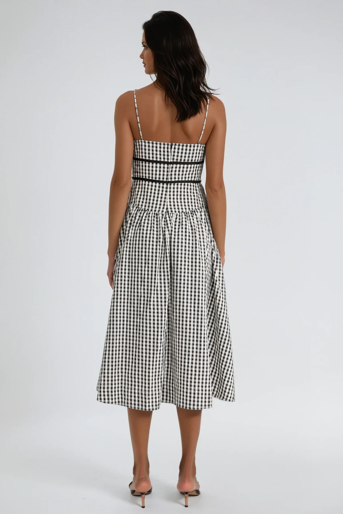 The Minimalist Grid Pattern Spaghetti Strap Midi Dress offers a versatile and modern design suitable for casual outings and refined occasions. Crafted for comfort and style, this midi-length dress enhances the wearers figure while allowing ease of movement. The tailored silhouette reflects expert contemporary fashion, making it a wardrobe staple for various events. It features a non-stretch design and is easy to clean with a gentle machine wash. Please note that the color may vary due to lighting on images. Pair it with your favorite accessories for a complete look. The product images (without model) represent the closest color match.