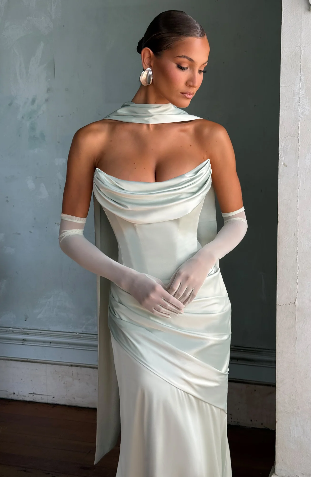 Elevate your wardrobe with these mint elbow-length gloves crafted from sheer stretch mesh for a flawless fit. Perfectly pair with the Sybil Scarf and the Kensington Maxi Dress in Mint for a stunning ensemble. These gloves are designed for style and comfort, ideal for special occasions such as evening celebrations or weddings. The mint color adds a touch of sophistication to your outfit. Complete your look with the Kensington Maxi Dress and Sybil Scarf. Please note that this item is non-returnable.