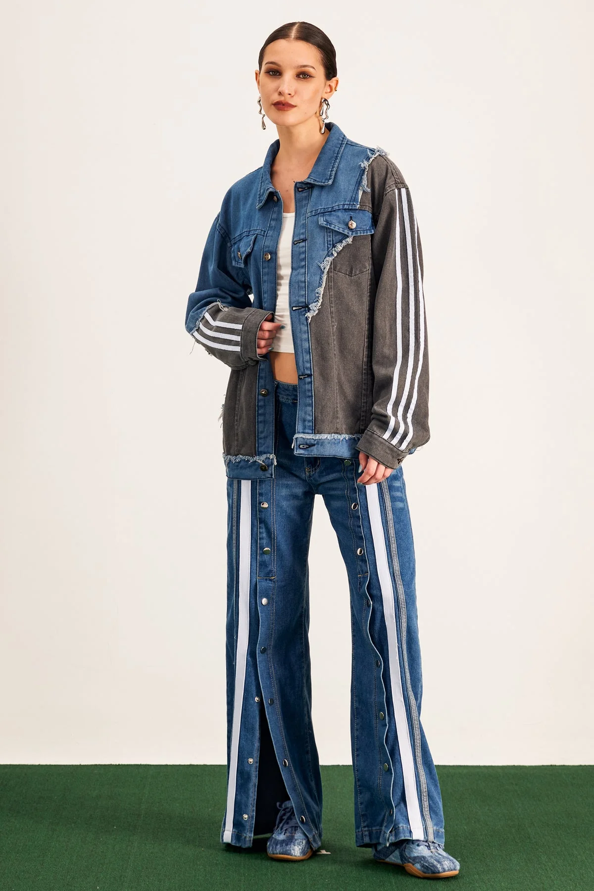 Elevate your style with this modern and edgy Denim Jacket featuring an Asymmetric design and Deconstructed Stripe pattern. Crafted from a blend of premium quality 50% Polyester and 50% Cotton materials, this jacket offers both durability and style. Whether youre at work or out for a casual day, this versatile jacket is a must-have in your wardrobe. The non-stretch material requires gentle machine wash. Please note: Color variations may occur due to different lighting conditions in images.