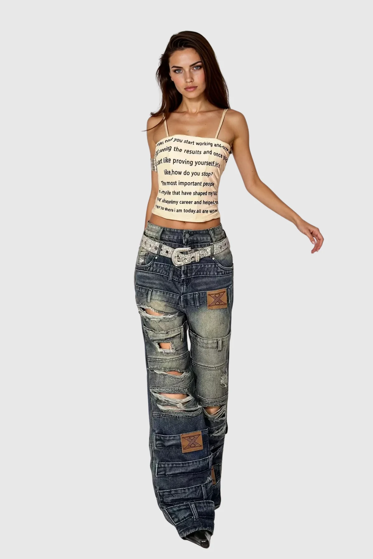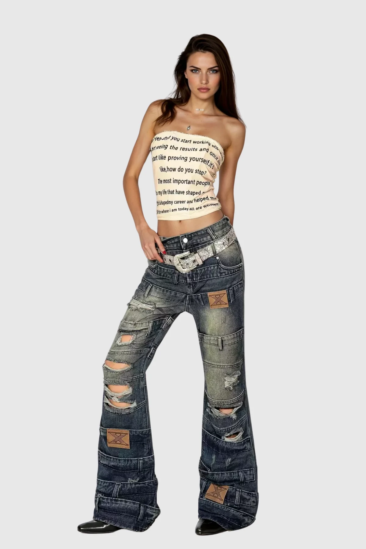 Embrace a modern twist on classic bootcut jeans with our Modern Deconstructed Bootcut Jeans. Featuring meticulous deconstruction details and strategic rips for a rugged yet refined aesthetic. The versatile bootcut silhouette ensures balanced proportions, flattering various shoe styles. Crafted from durable fabric for long-lasting wear, these jeans fuse style and functionality seamlessly. Ideal for fashion-forward individuals seeking standout denim pieces. Experience expert design and impeccable style. Non-stretch material. Care: Gentle machine wash. Note: Color may vary in images due to lighting.