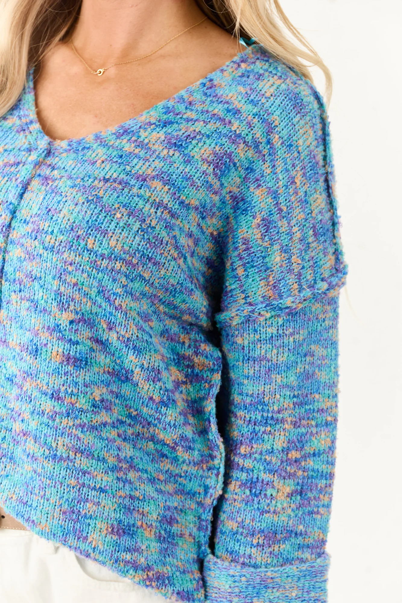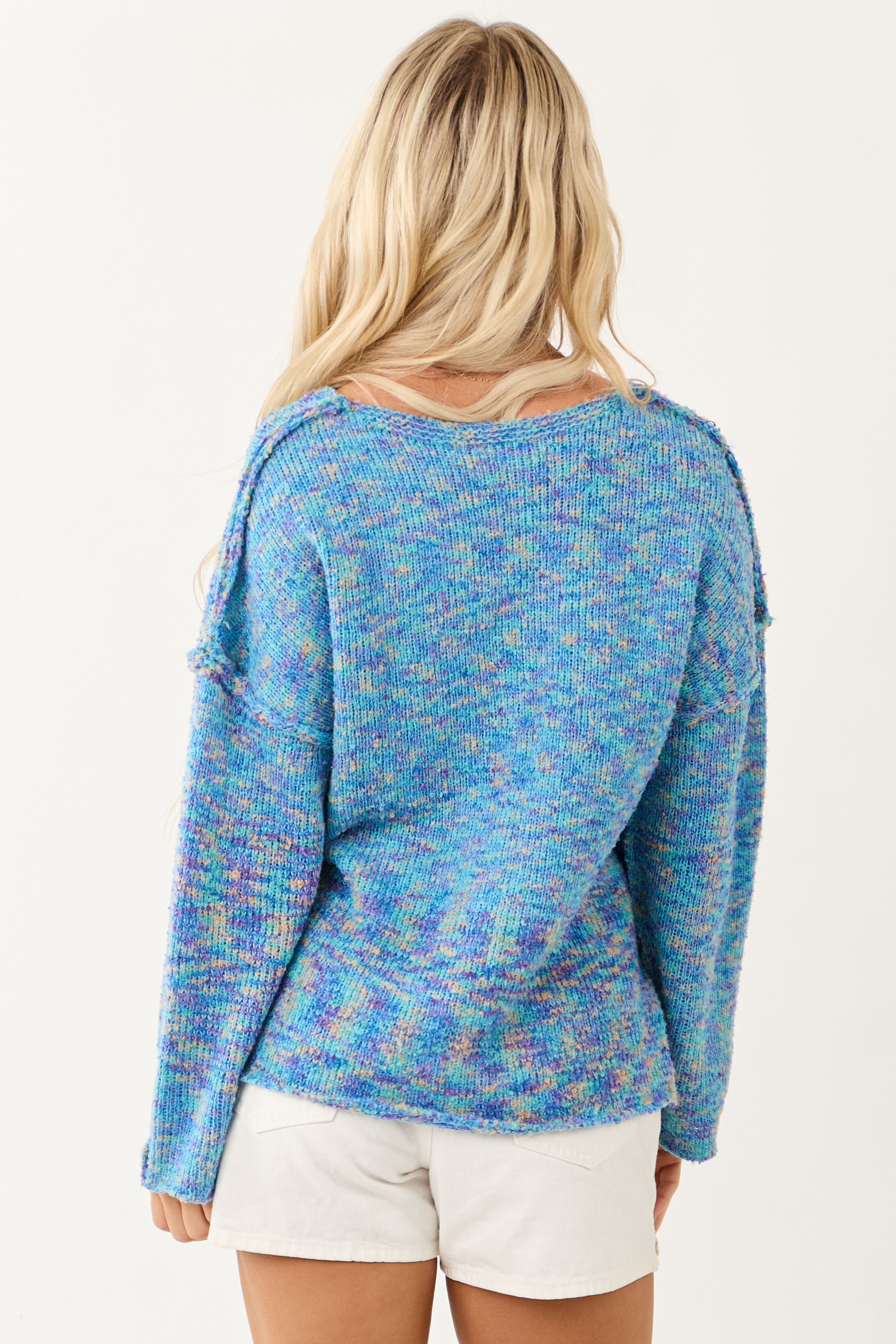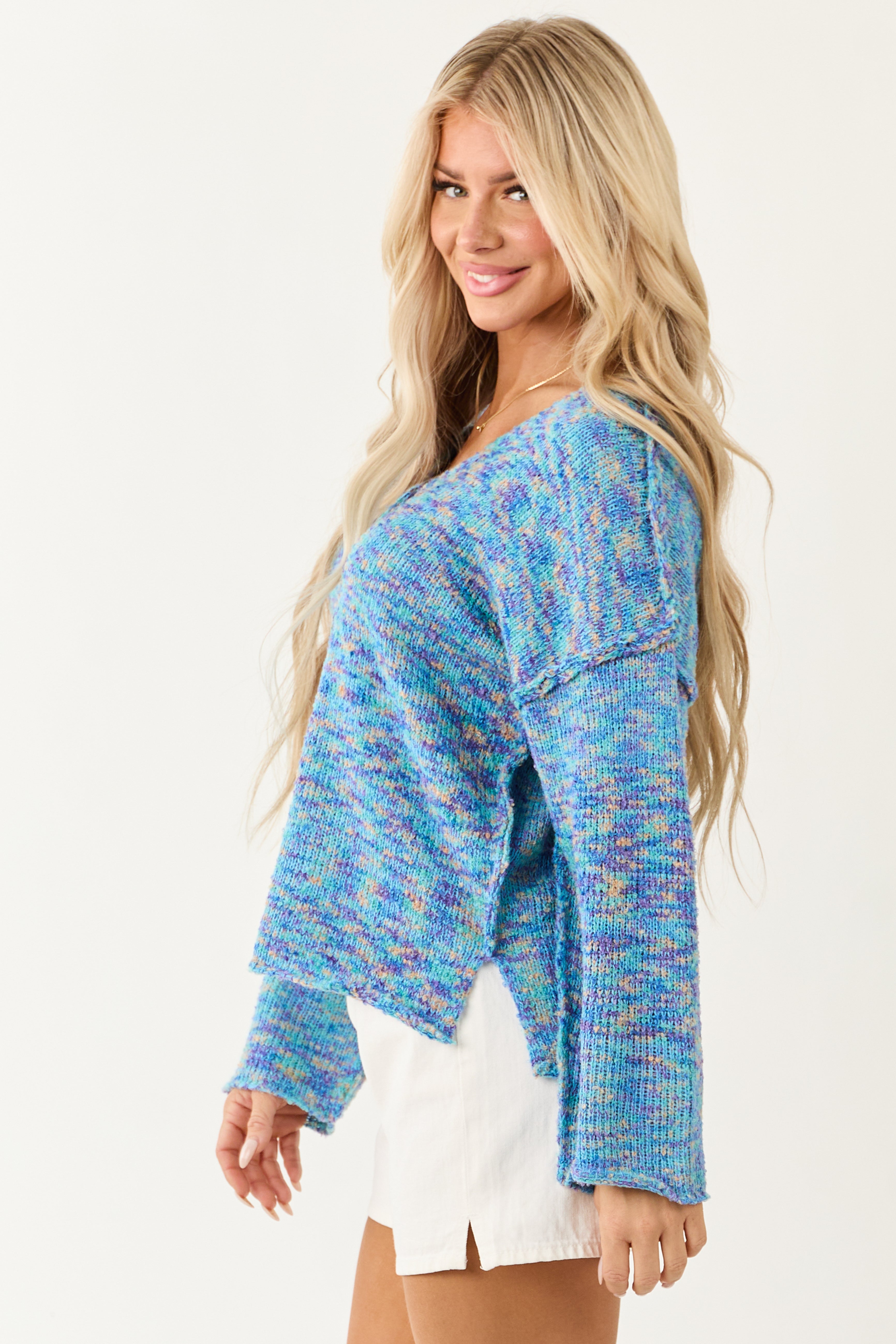 Experience cozy comfort with a touch of style in our stretchy knit sweater. This trendy top features multicolor shades of Azure, Melon, and Iris, bell sleeves, exposed seams, and side slits for a chic look. Made of 45% Acrylic, 45% Polyester, and 10% Spandex blend. Perfect for any occasion, from casual outings to a cozy night in. Available in sizes S, M, and L.