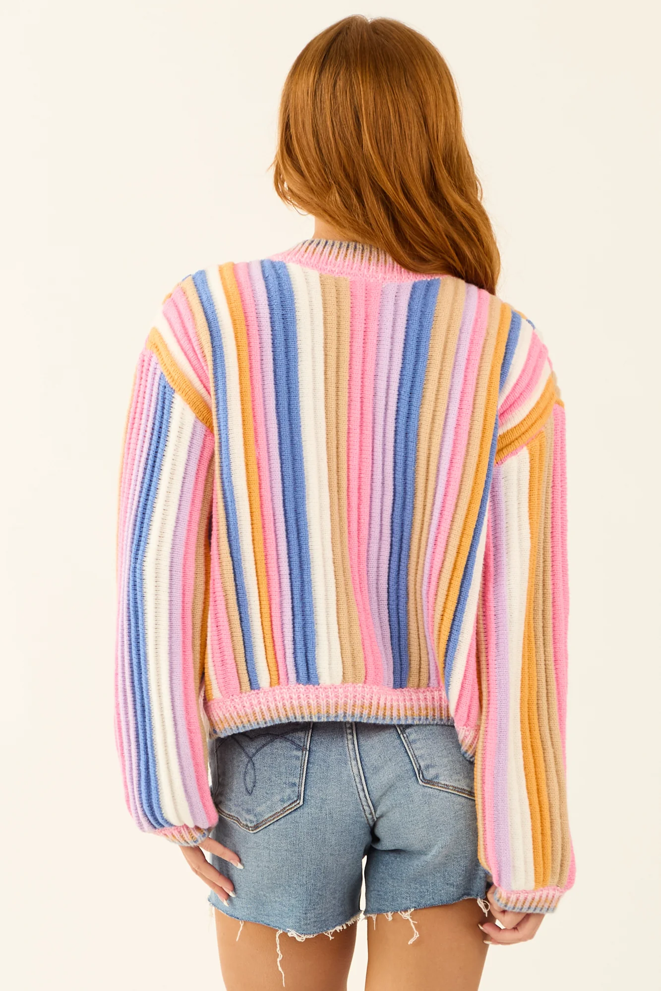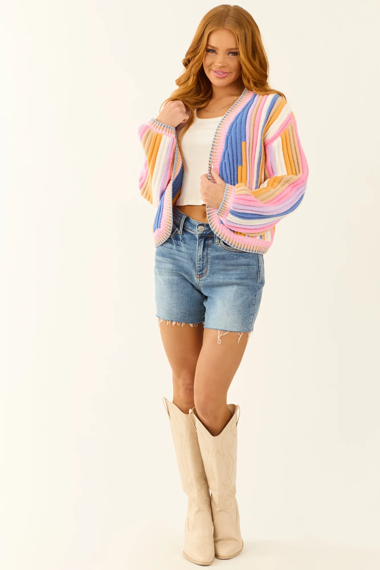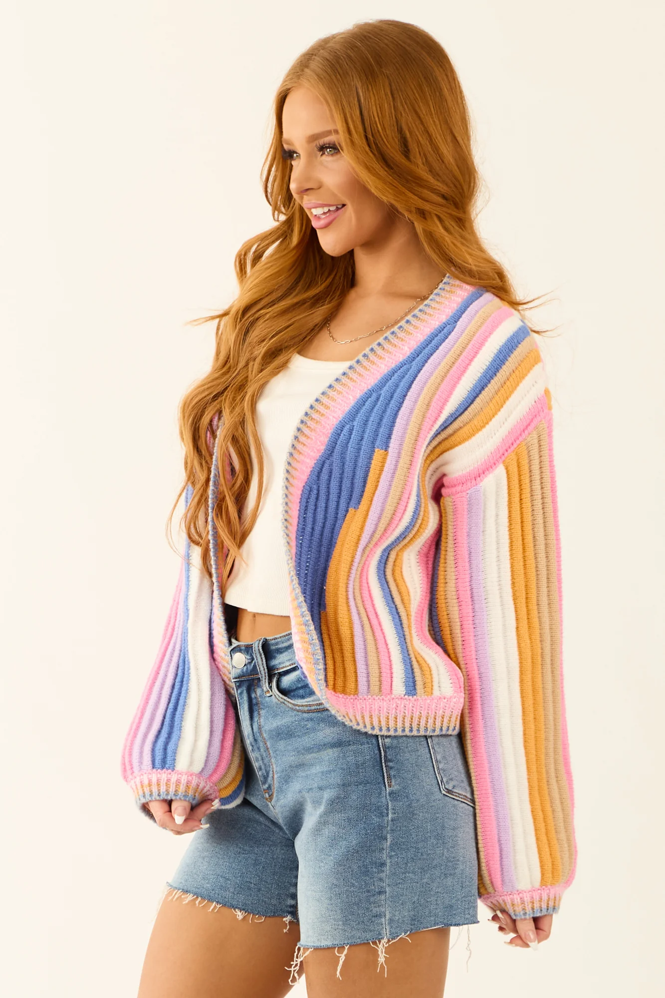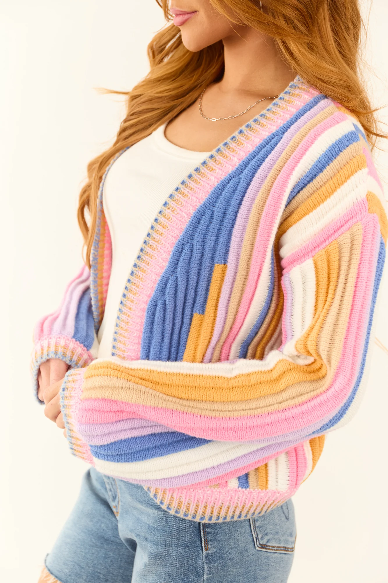 Stay cozy and stylish in this multicolor texture knit open front cardigan . Crafted from stretchy ribbed knit, this cardigan features a variety of shades including sapphire, lavender, bubblegum, oatmeal, marigold, and off-white. The banded trim and long sleeves add a touch of elegance to this piece. Made of 100% polyester, this unlined cardigan is perfect for layering. Please note that each piece is unique due to the cutting and sewing process. Available in sizes S, M, L, and XL. Care instructions: Hand wash cold, do not bleach, line dry, iron low. Model is wearing a size Small.
