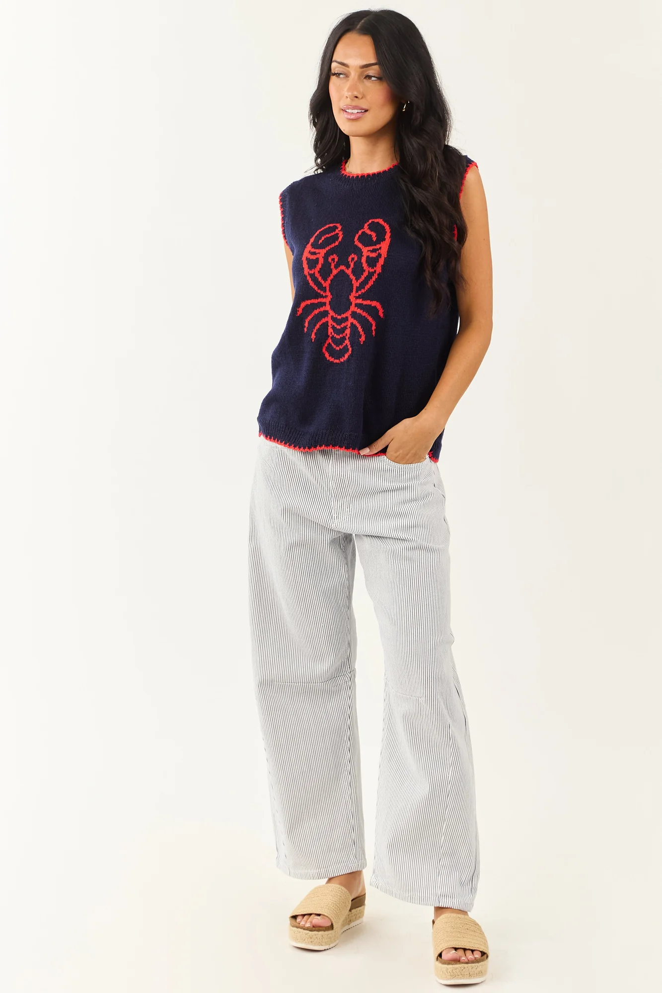 This nautically playful knit tank in Navy is perfect for beach trips or adding a quirky twist to casual outfits. The oversized fit and stretchy knit offer comfort and style. Featuring a charming lobster graphic and trim in the vibrant shade of Lipstick, this tank is accented with scallop trim. Made of 100% acrylic, it is imported and ideal for a relaxed summer look. Embrace the seaside vibes with this unique piece. Model is wearing a size Small. Models Profile: Size 1, Height 59″, Bust 34″, Waist 26″