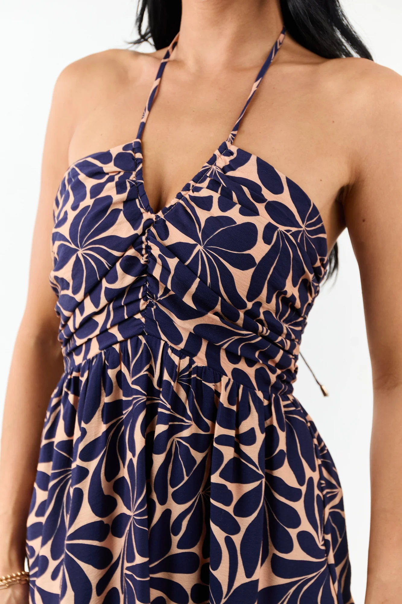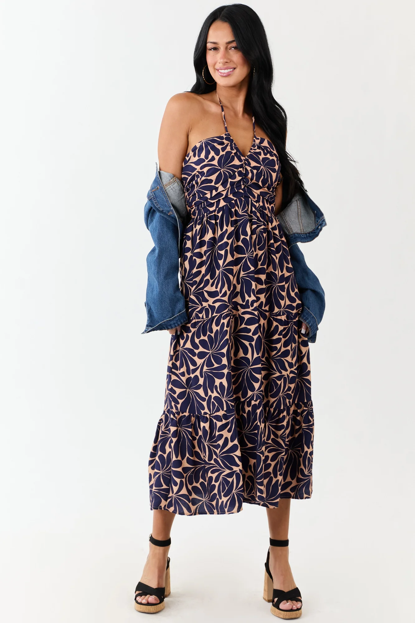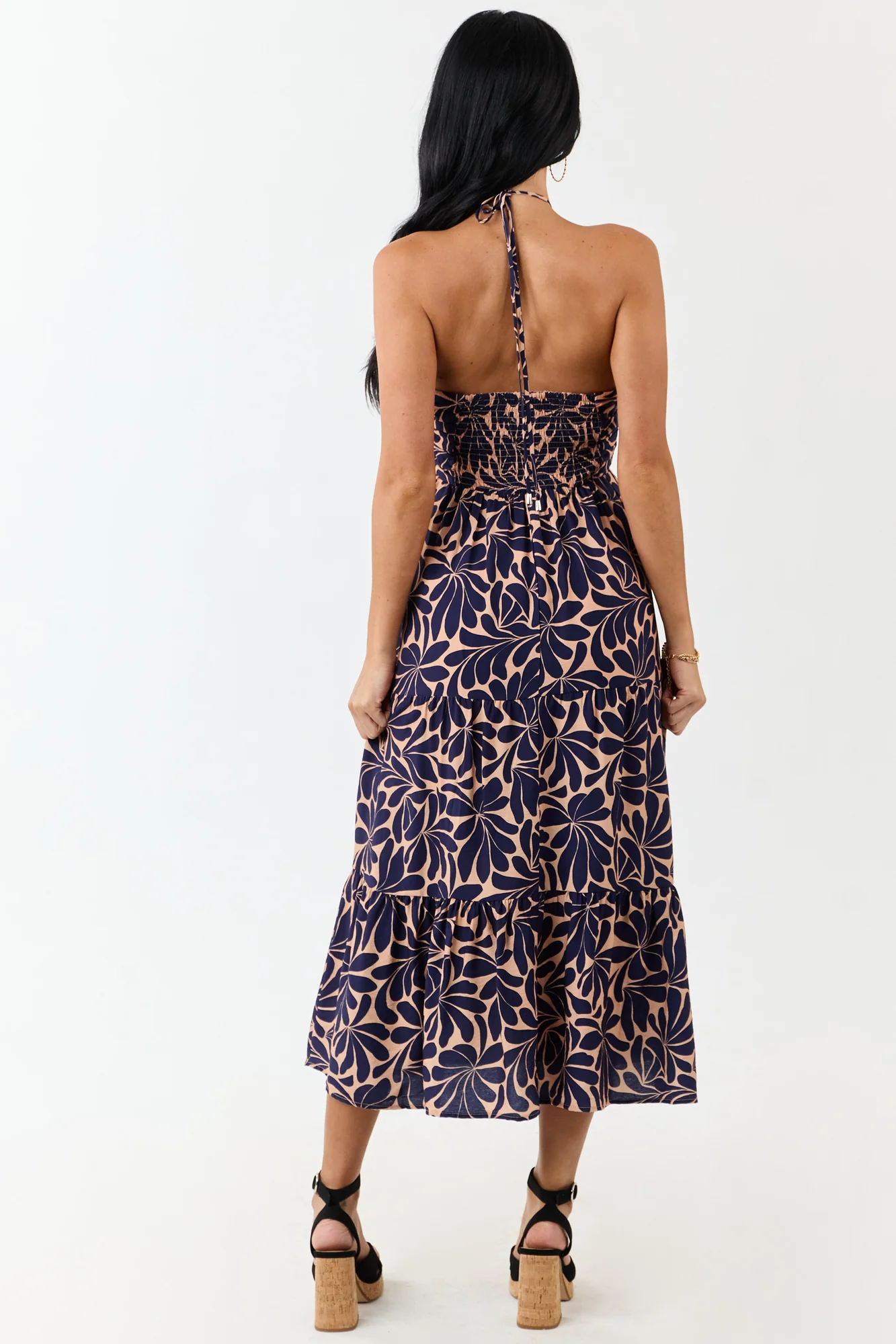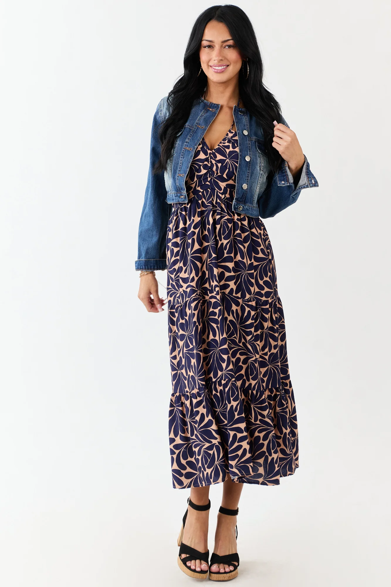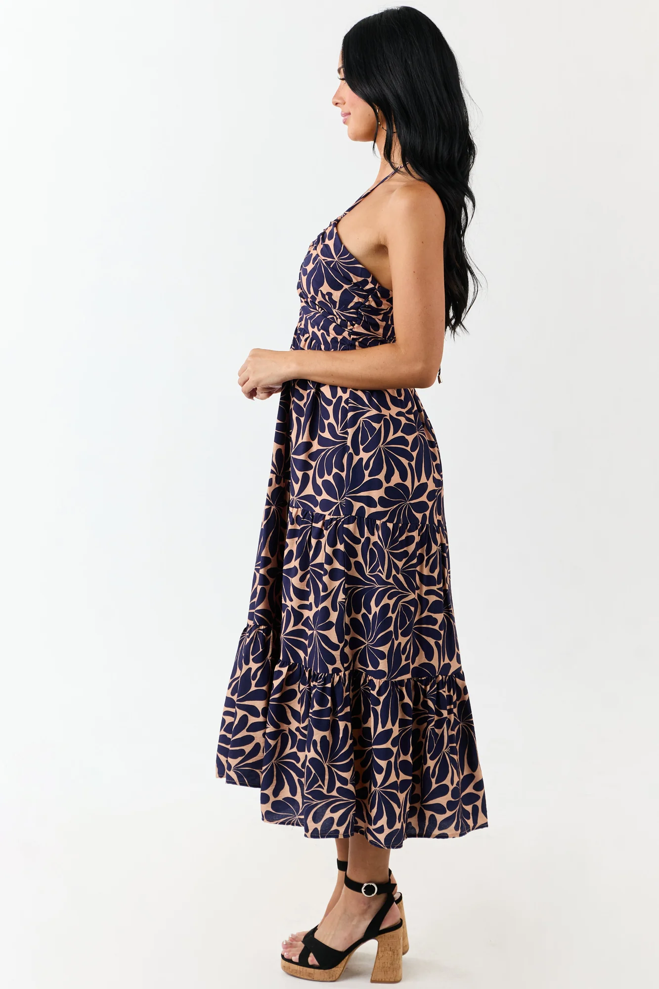 This stunning Navy Abstract Print Maxi Dress features a midi length, ruched bust, smocked back for comfort, and a flowy tiered hem. The dress is true to size, forgiving at the waist, and designed with adjustable tie spaghetti straps, made of 85% Rayon and 15% Nylon with a 100% Polyester lining. Get a flattering fit with the garment specs for size small: Bust 34″, Waist 28″, Length 46″. Elevate your style with this elegant dress perfect for any occasion.