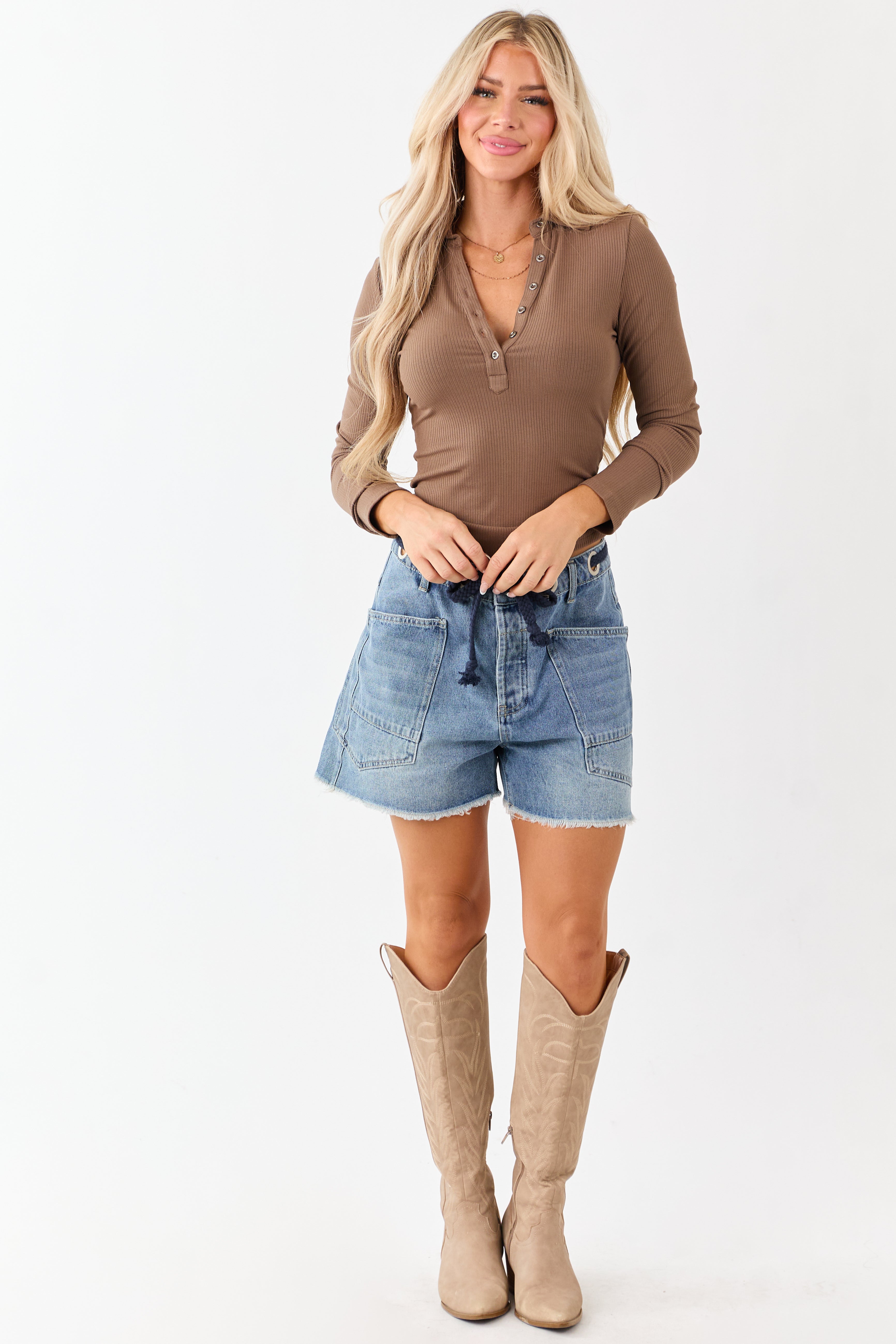 Indulge in ultimate comfort and style with these denim shorts featuring a chic braided tie waist, hidden button fly, and functional pockets. Made of non-stretchy denim, these high-rise shorts are both fashionable and practical. Inseam length is 4 inches. Crafted from 82% Cotton, 14% Polyester, and 4% Rayon for a premium feel. Complete your casual look effortlessly with these shorts. Available sizes: XS, S, M, L, XL.