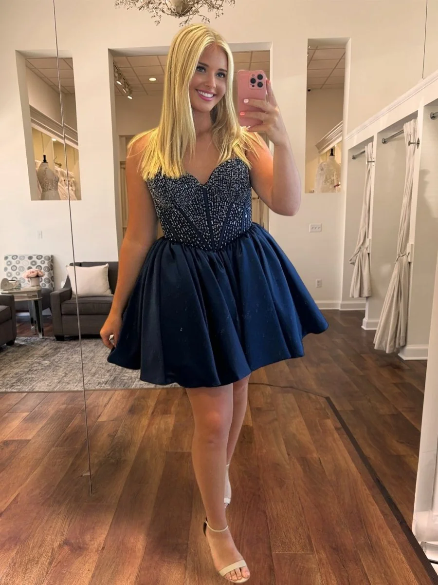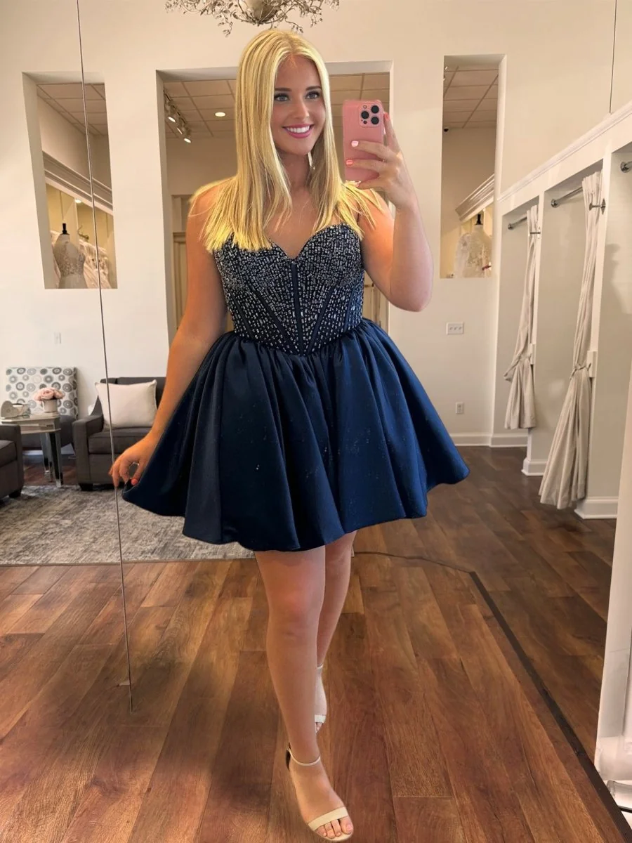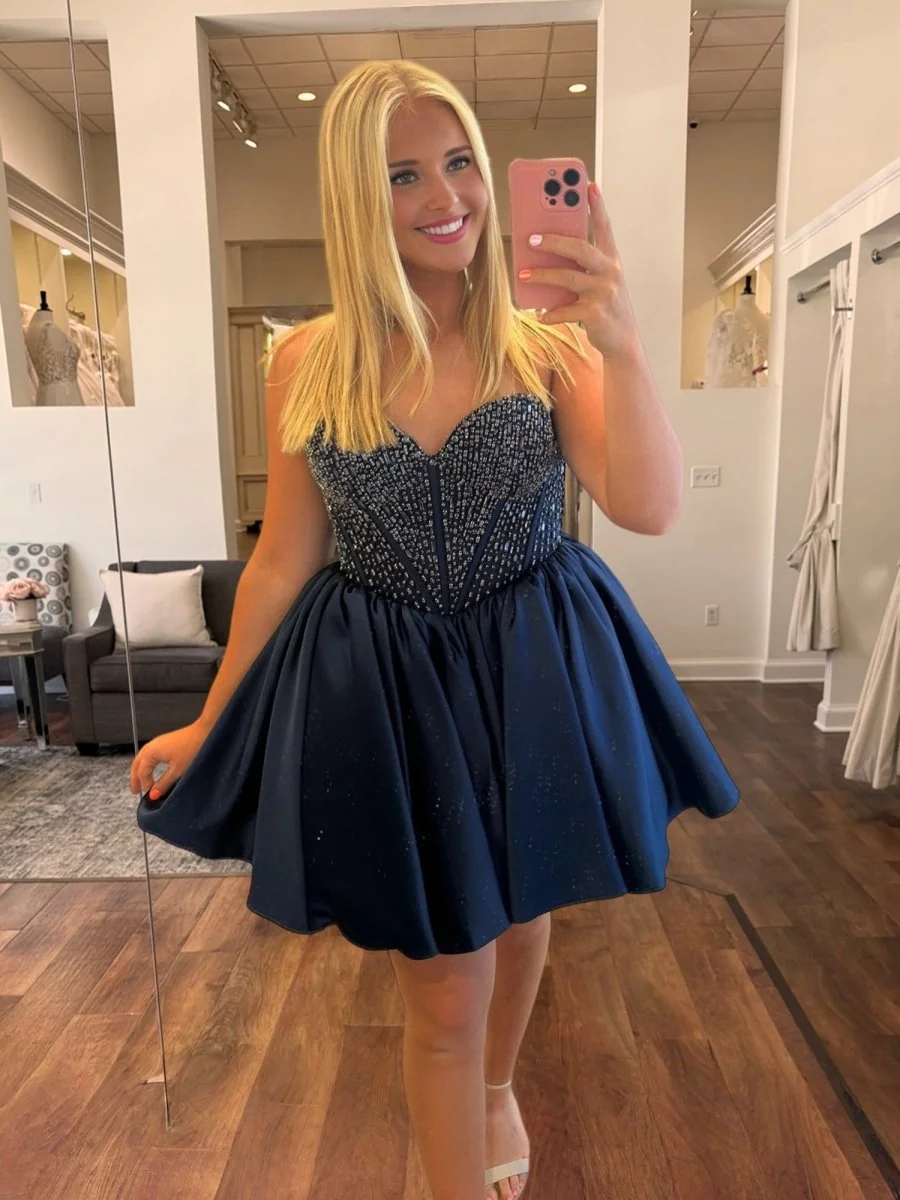 Steal the spotlight with the Hira homecoming dress in elegant navy blue satin. This strapless A-line mini embellished with sparkling beading is perfect for a glamorous and adjustable fit. The structured bodice and lace-up back add charm to this versatile dress suitable for homecoming, cocktail parties, and special events. Experience the rich color, flattering silhouette, and youthful allure it offers. Ideal wardrobe essential! Silhouette: A-Line. Color: Navy Blue. Length: Short. Neckline: Strapless. Fabric: Satin. Back: Lace-Up Closure. Sleeve Style: Sleeveless. Embellishment: Beading.