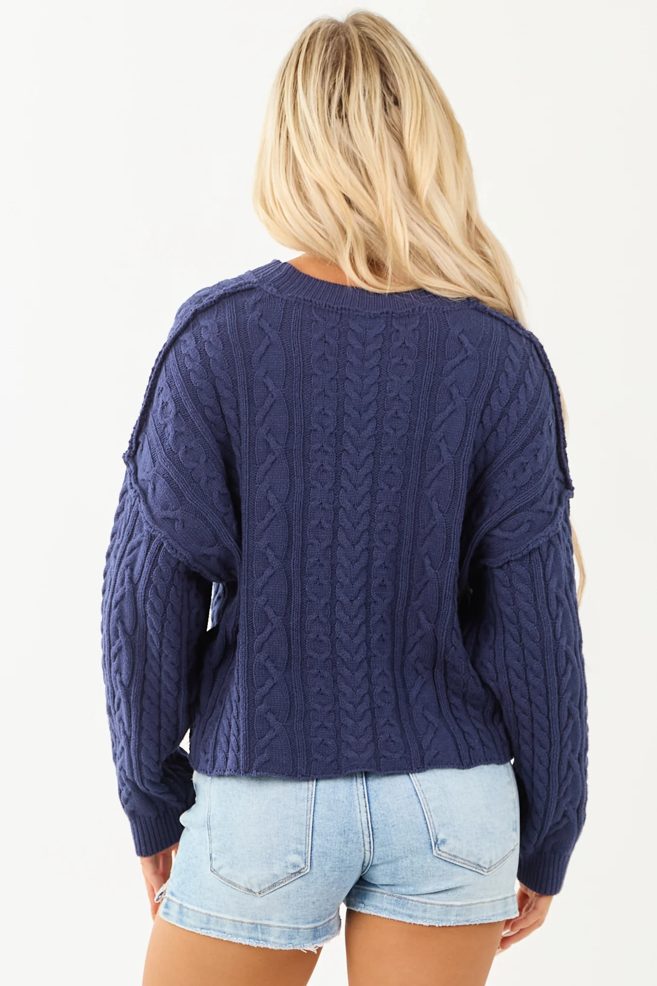 Stay cozy and stylish in this oversized Navy Cable Knit Sweater featuring a subtle American flag detail. Crafted from a blend of 60% Cotton and 40% Acrylic, this sweater offers a comfortable fit with stretchy cable knit, drop shoulders, and ribbed trim. The embroidered stars add a unique touch, making it a perfect blend of comfy casual and cute. Exposed seams add a hint of edginess to the design. Available in XS, S, M, and L sizes, this sweater is ideal for chilly days and casual outings. Add this charming piece to your wardrobe for a trendy look that embraces both comfort and style.