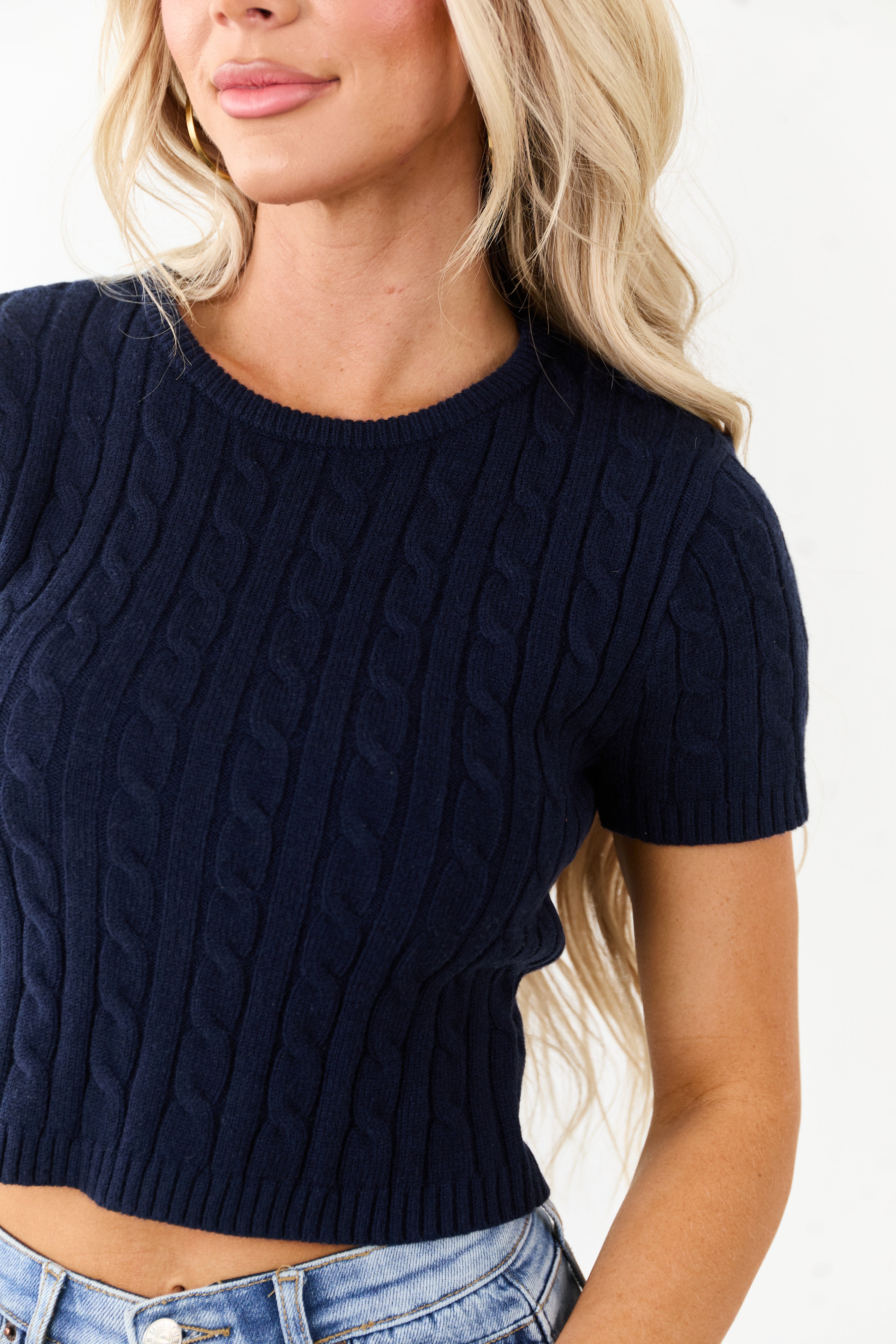 Upgrade your wardrobe with our Navy Cable Knit Short Sleeve Top, a timeless piece crafted with cable knit details in a beautiful navy tone. This semi-cropped top features stretchy soft knit fabric with ribbed trim for a flattering fit. Available in sizes small, medium, and large. This top is made of 28% polyester, 27% acrylic, 25% rayon, and 20% nylon. Imported. Model is wearing a size Small. Model’s Profile: Size 3, Height 57″, Bust 35″, Waist 26″.
