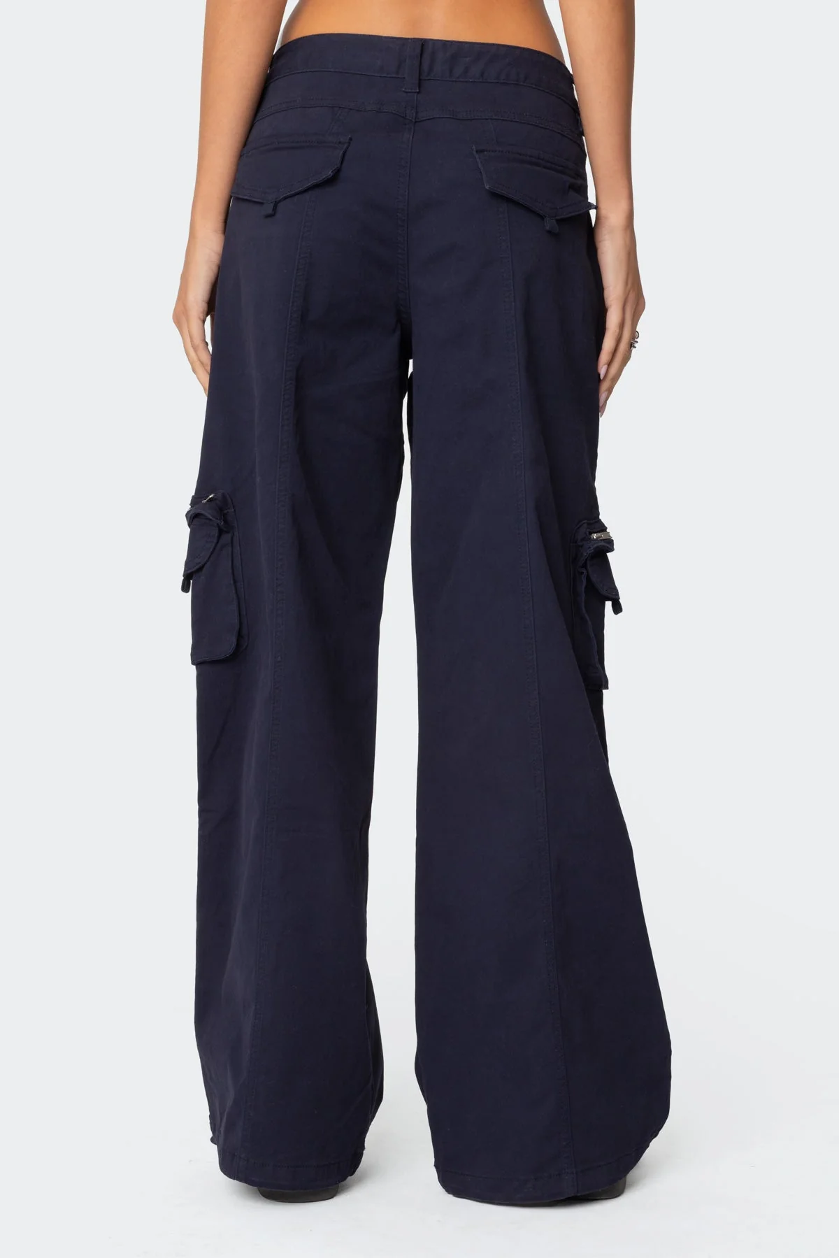Discover ultimate utility and style with our Navy Cargo Pants. Crafted from 100% Cotton, these pants feature utility style pockets, adjustable cuffs, and intricate zipper detailing for a modern look. Whether youre running errands or out for a casual day, these pants will keep you comfortable and stylish all day long. Model wears size S. Model height is 59. Care Instructions: Machine wash cold (max 30°C), do not bleach, tumble dry low, iron low (max 110°C), do not dry clean.