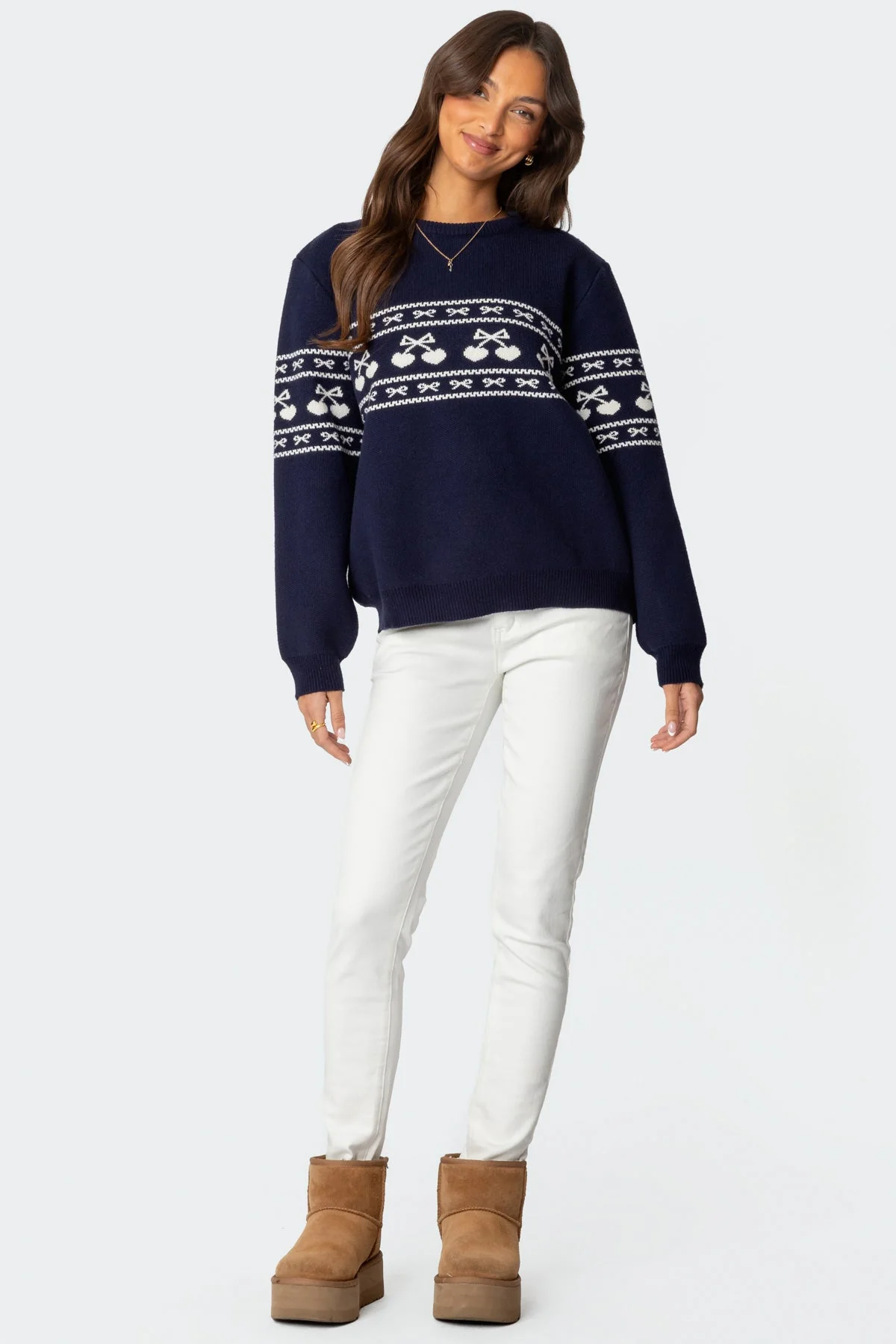 Indulge in festive charm with our Navy Cherry Bow Graphic Knit Sweater made from cozy acrylic material. This adorable sweater features a chic cherry bow graphic, knitted fabric, and long sleeves for a stylish look. Easy to care for, this sweater is machine washable. Elevate your seasonal wardrobe with this winning combination of comfort and style!