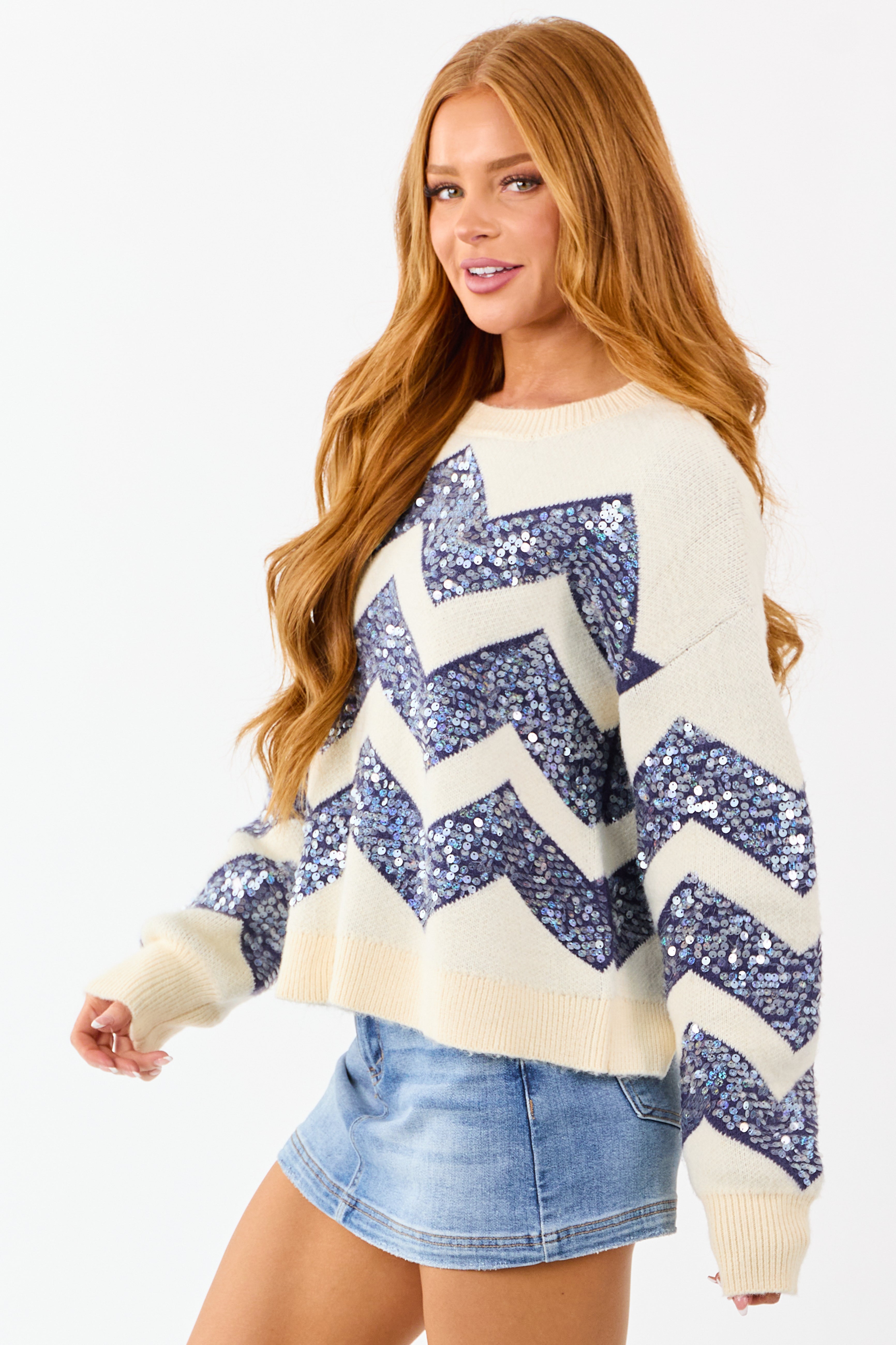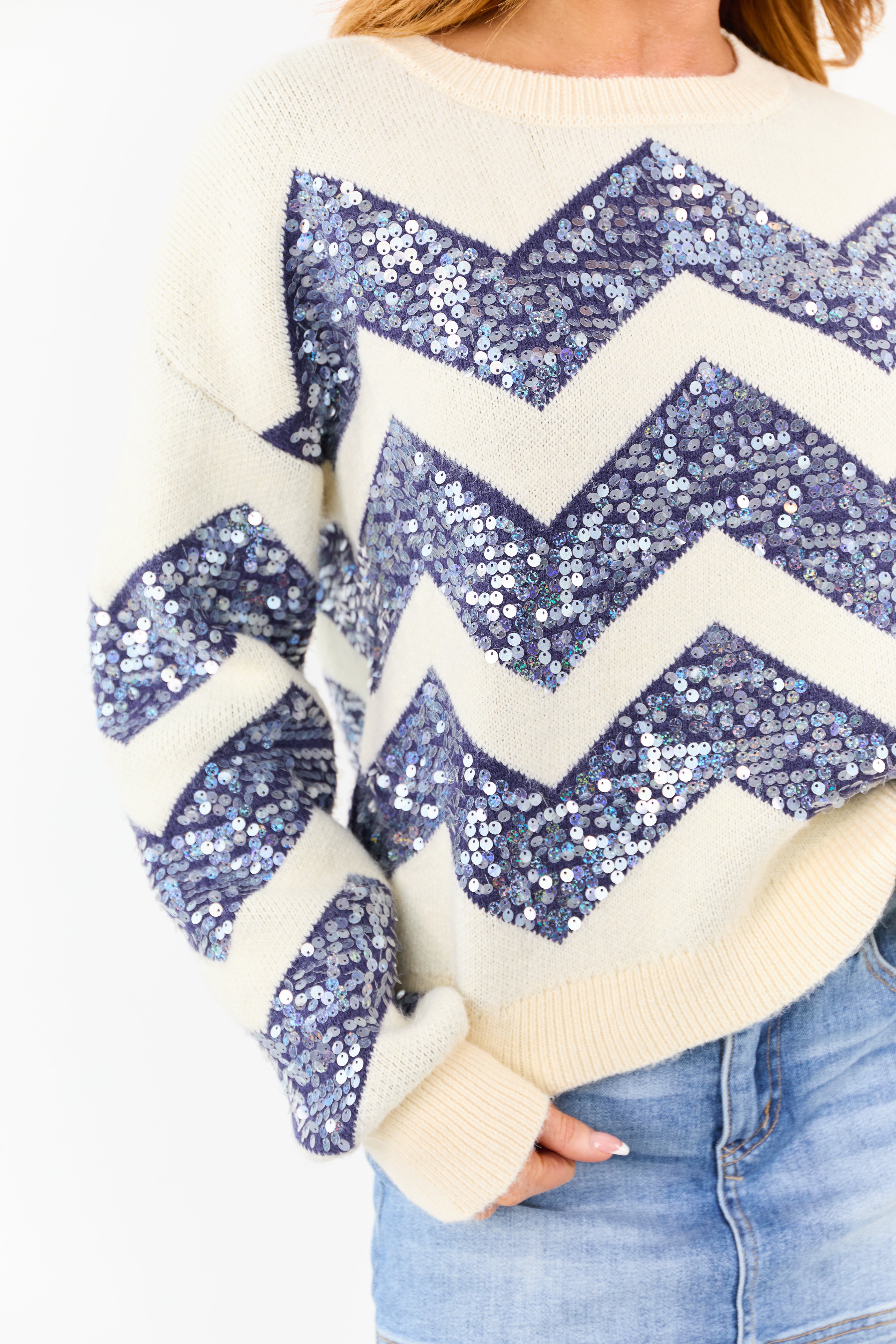 Elevate your style with our Navy Chevron Sequin Knit Sweater. Effortlessly chic and comfortably cozy, this top features shimmering sequins on a stretchy knit fabric. The relaxed fit and drop shoulder design offer a versatile and fashionable piece suitable for any occasion. Constructed with 60% Acrylic and 40% Nylon, this sweater is perfect for adding a touch of glamour to your wardrobe. Please note that due to the nature of the fabric, each piece may have slight variations in the print. Embrace your individuality with this unique and trendy sweater. Model height: 55 wearing size Small.