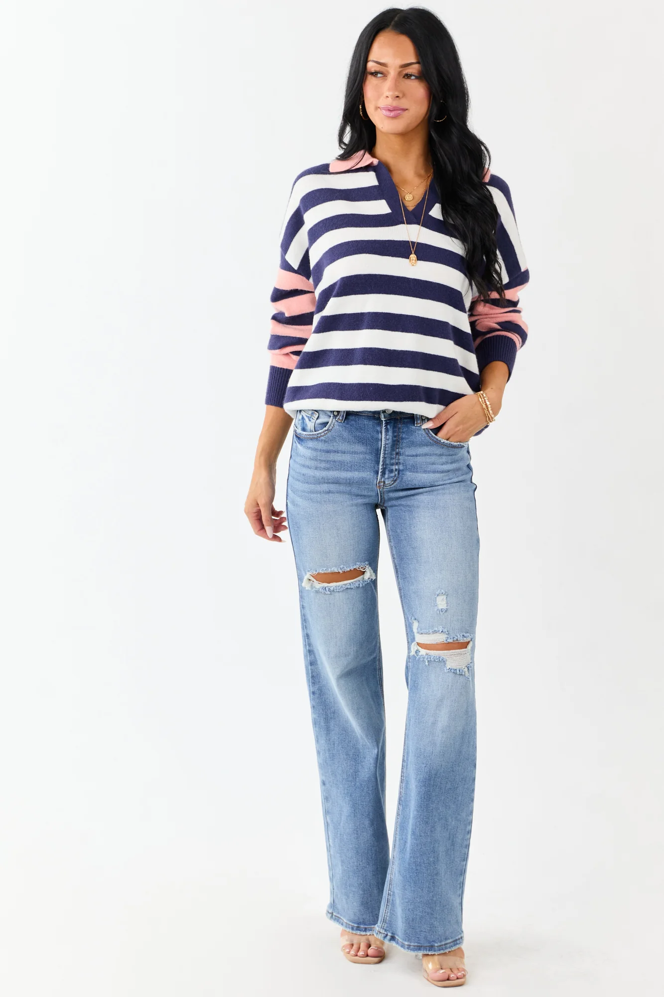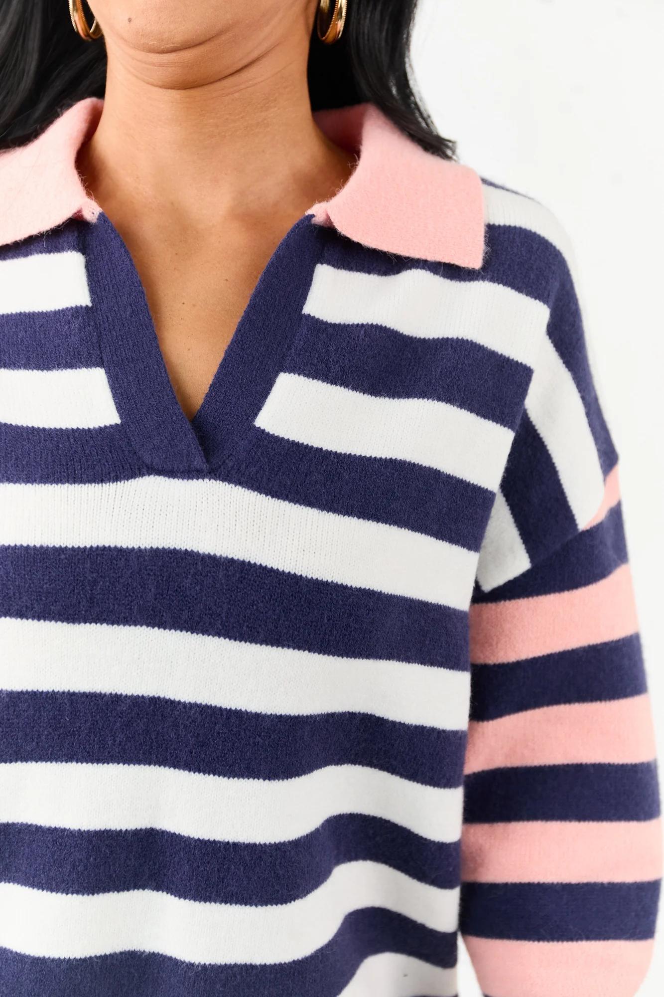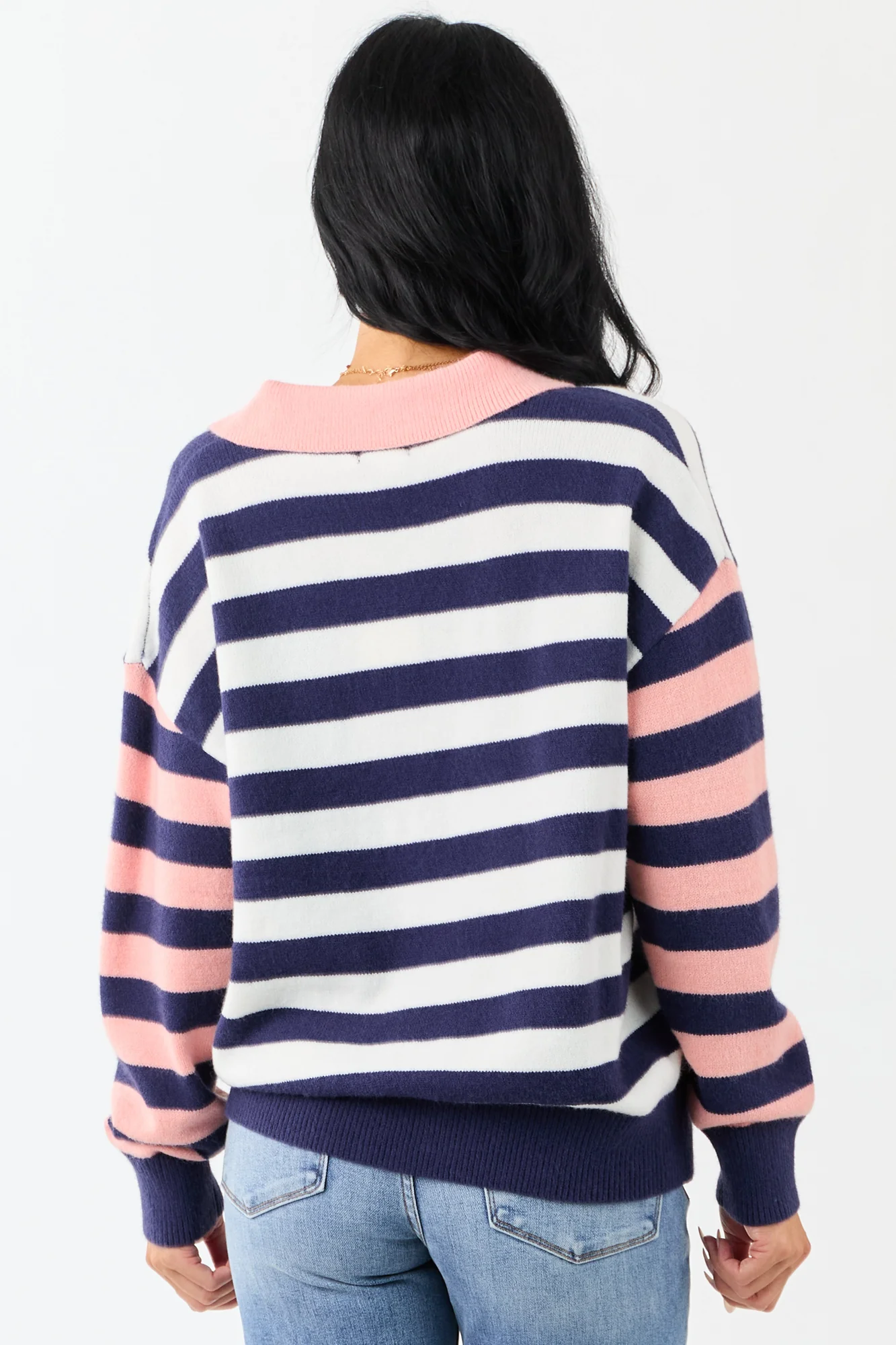 Experience the perfect blend of preppy and cozy with this bold navy, coral, and off-white striped sweater. Its relaxed fit, classic collar, and stretchy ribbed knit ensure both style and comfort. The banded trim adds a touch of sophistication. This sweater is made of 100% polyester, guaranteeing quality and durability. Embrace the unique variations that may occur due to the fabrics print and sewing process, adding a touch of individuality to each piece. Model is wearing a size Small. Sizes available: S, M, L.