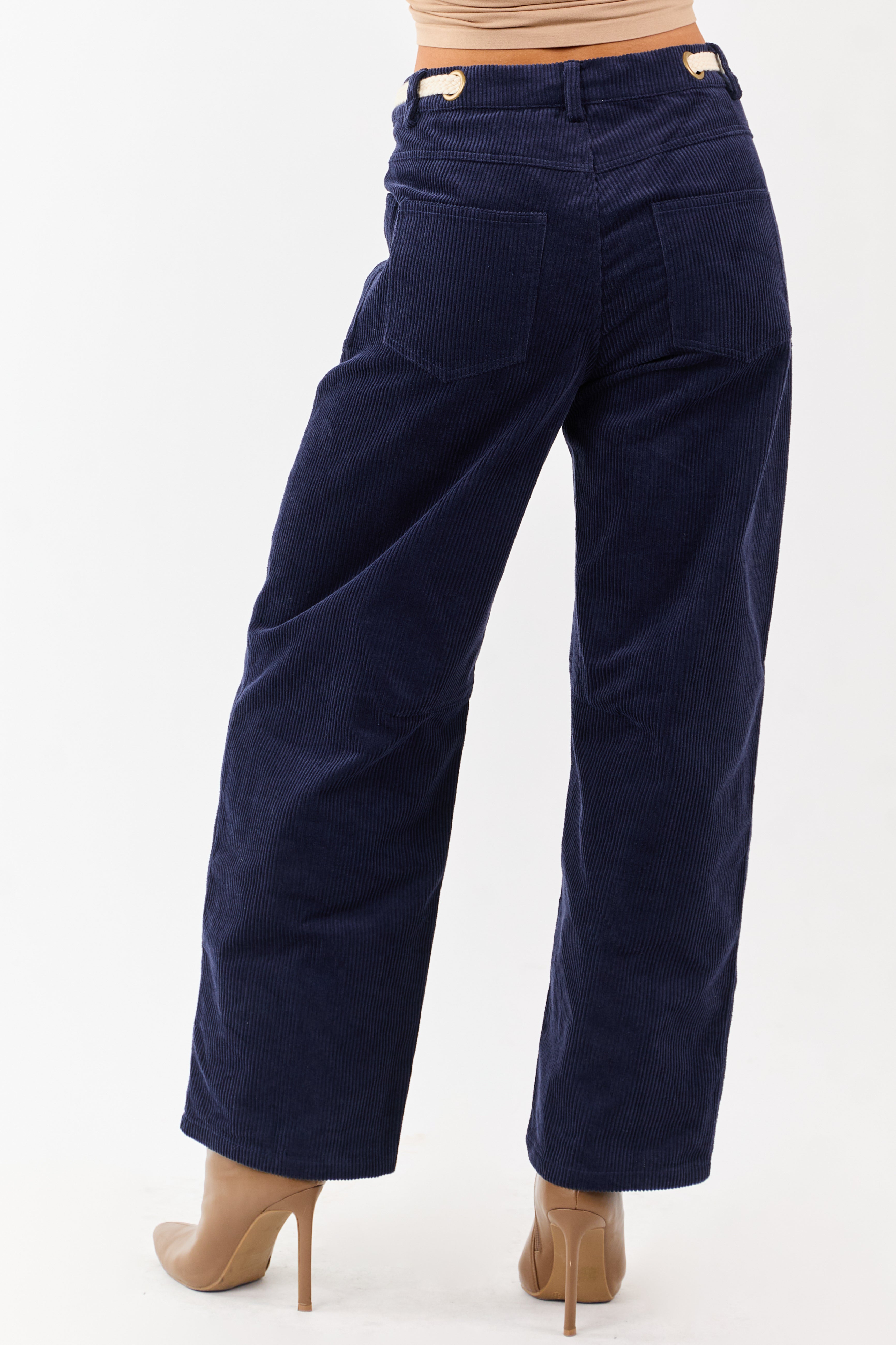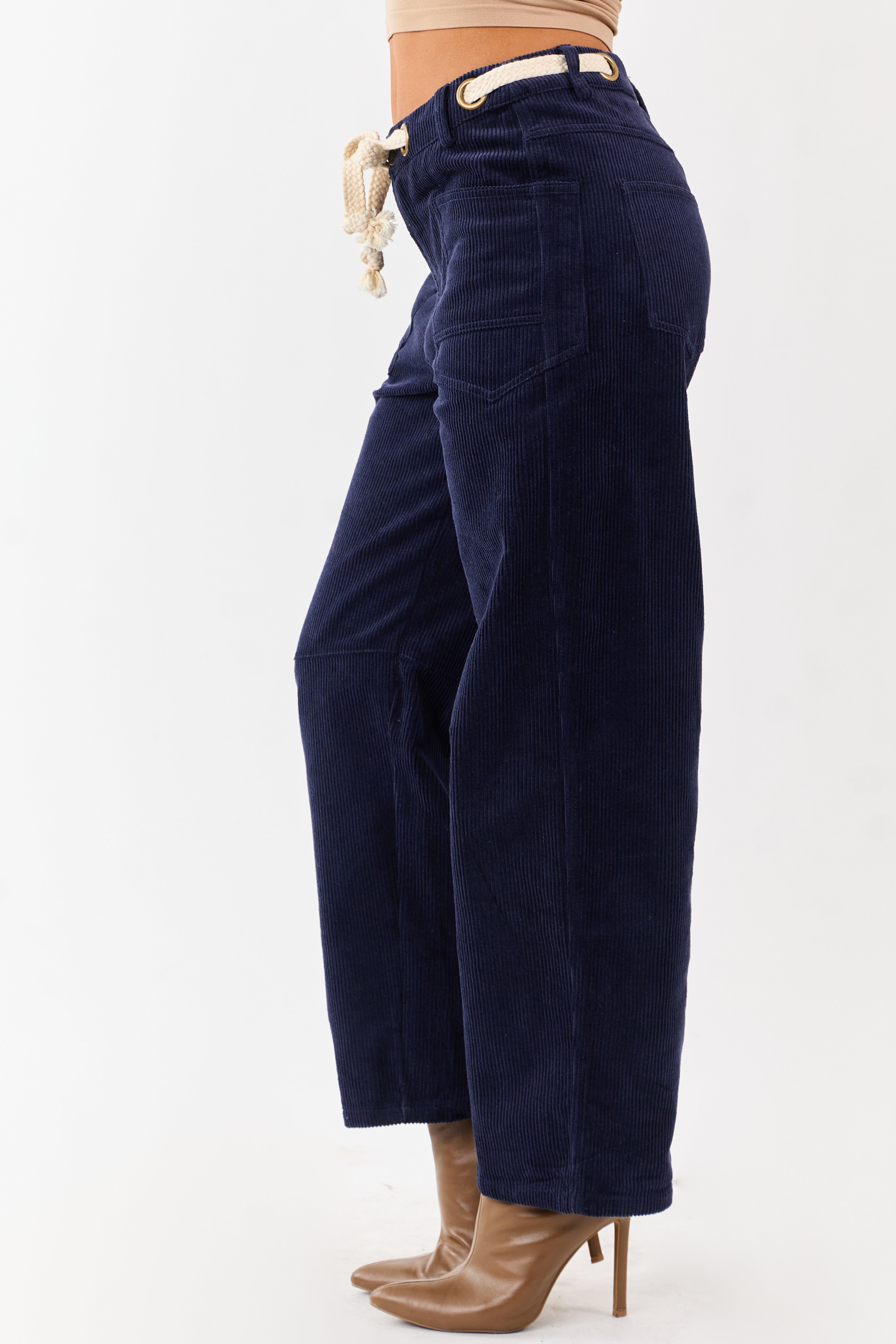 Indulge in comfort with these versatile navy corduroy wide-leg pants. From relaxing at home to casual outings, this garment combines style and adjustability with its braided rope waist tie. Crafted from non-stretchy high-waisted corduroy, these ankle-length pants feature a large grommet waistband and four pockets for added convenience. Stay chic and comfortable in these 100% cotton pants, available in multiple sizes.