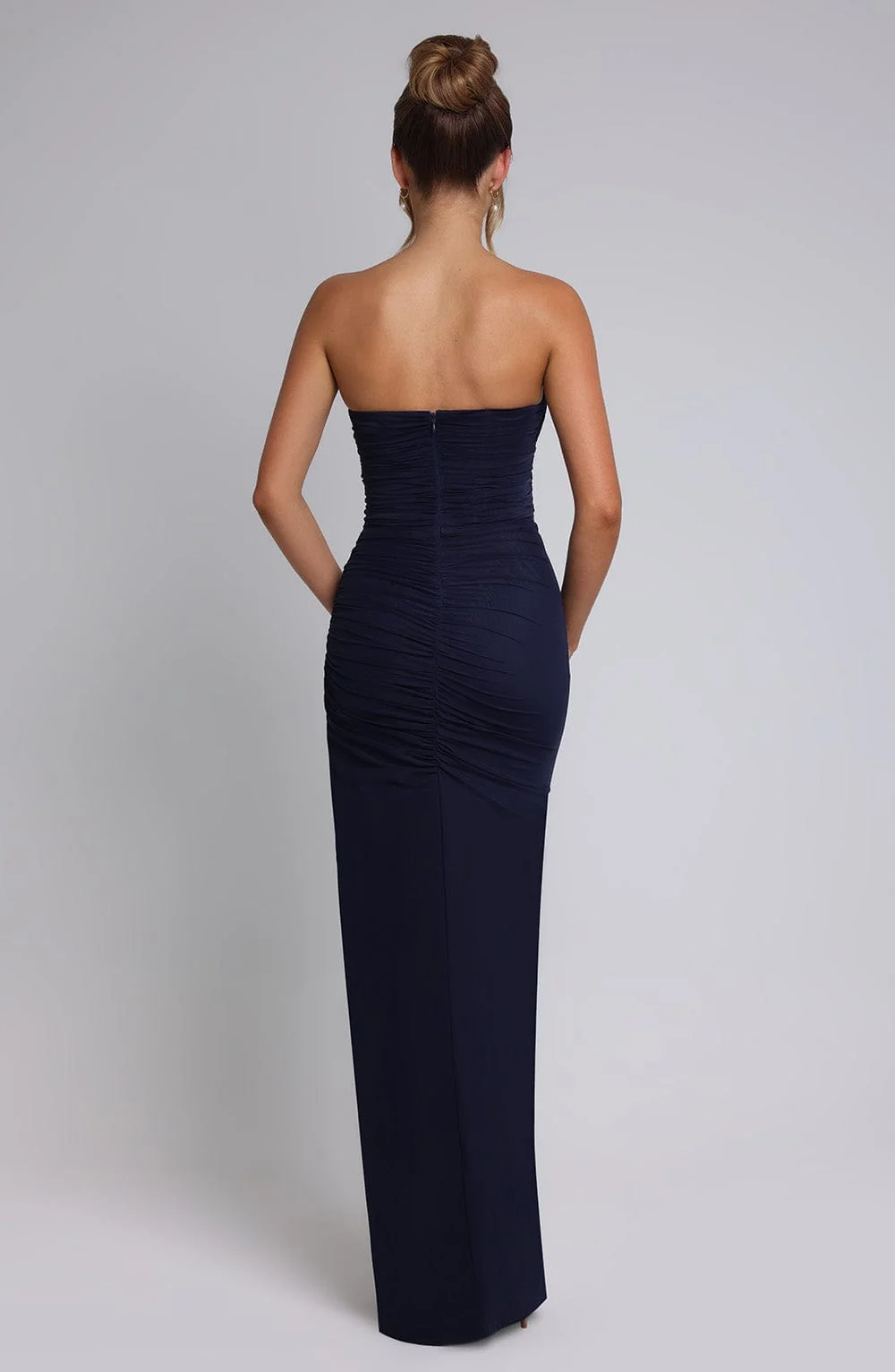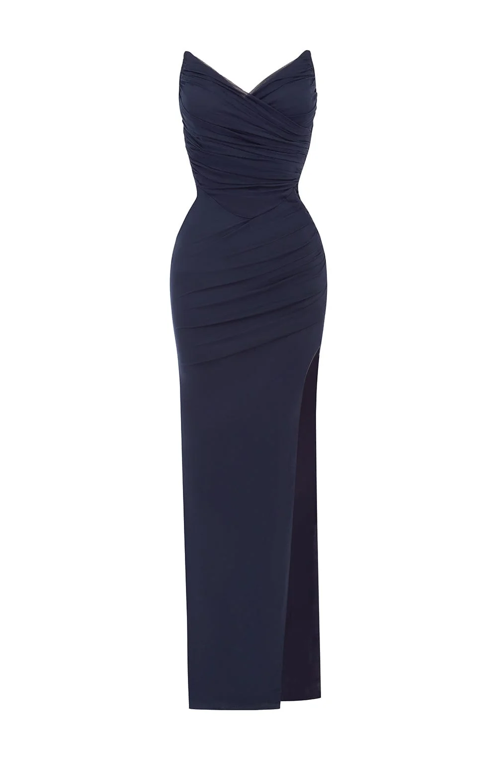 Elevate your entrance with Giovanna, the premium Navy Maxi Dress cut from stretch mesh for dreamy sculpting. Featuring boned corset waist, pointed cups, thigh-high split, and invisible zipper for a sleek silhouette. Ideal for birthdays, weddings, bridesmaids, and evening events. Fully lined with ruched overlay for a glamorous touch. Available in XS to XXL sizes.