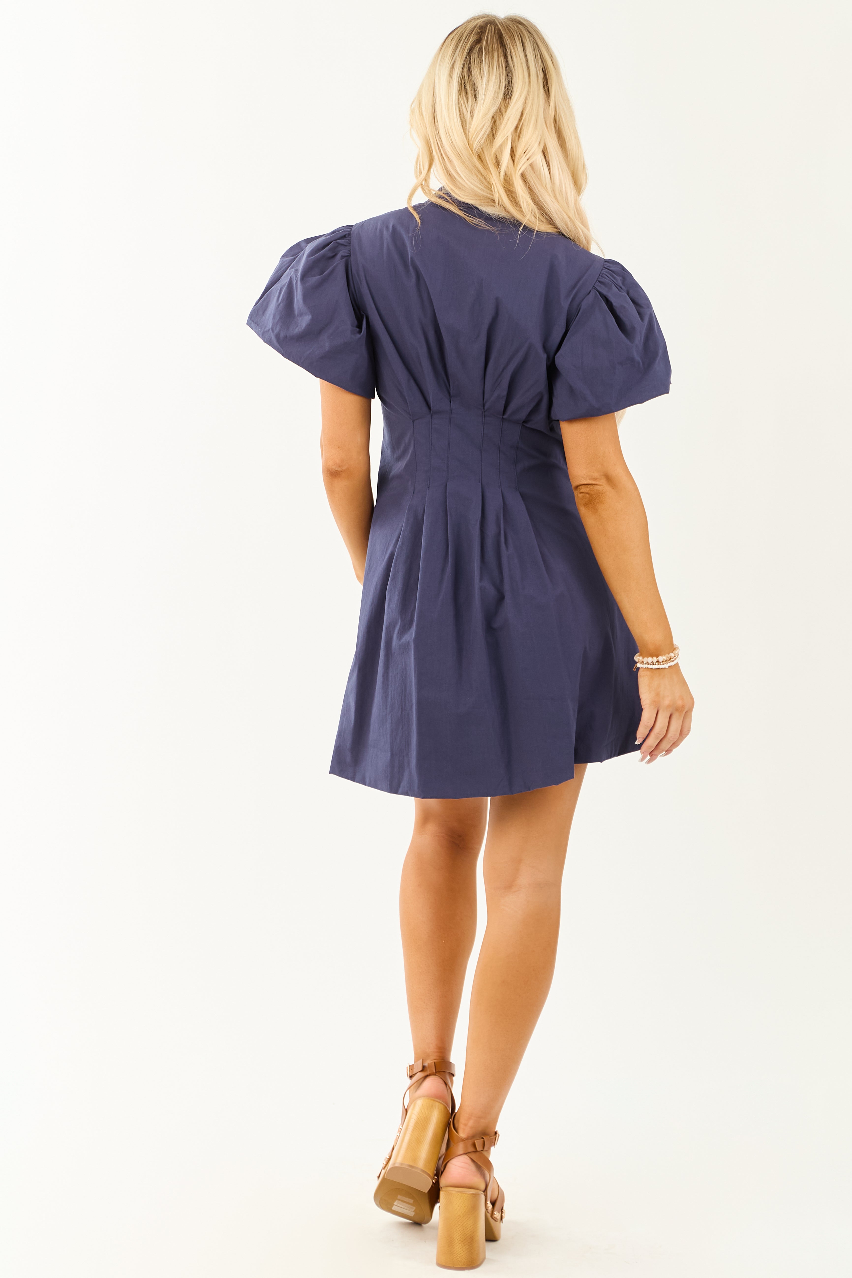 This charming Navy Cotton Mini Shirt Dress features crisp pleats, playful bubble sleeves, and pleated pockets for everyday elegance. Made from non-stretchy lightweight cotton (100% Cotton) with a lining of polyester (100% Polyester), it offers comfort and style. Available in sizes S, M, and L with bust measurements of 34″, 36″, and 38″, waist measurements of 30″, 32″, and 34″, and lengths of 33″, 34″, and 35″. Embrace a chic look with this unique dress today!