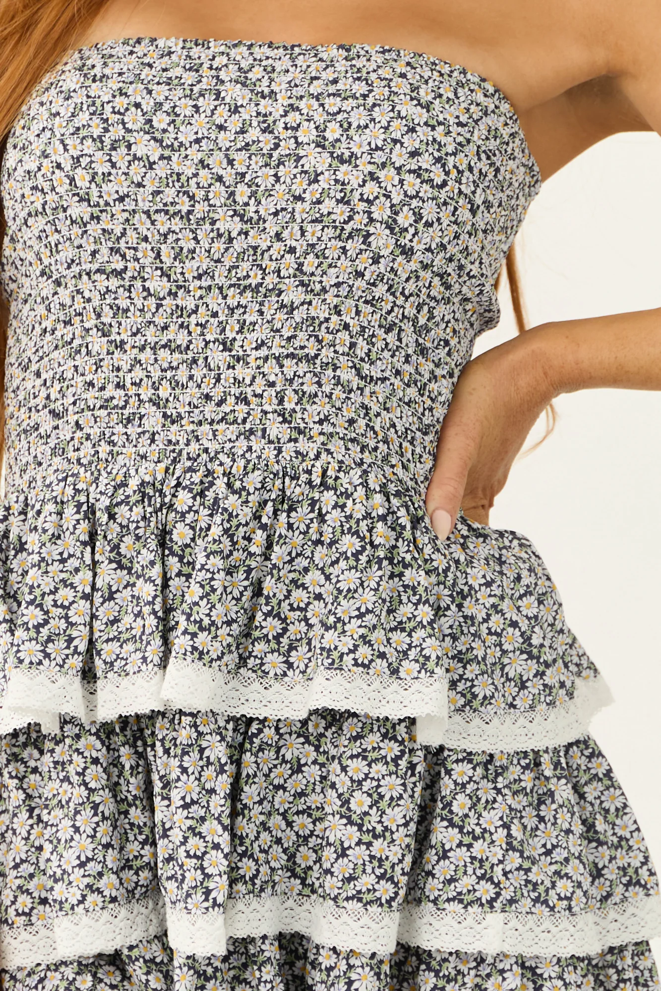 Stay stylish and comfortable in this Navy Floral Print Smocked Romper . This peplum fit romper features a non-stretchy woven fabric in shades of Navy, Iris, Ivory, Amber, and Pistachio. With an off-white lace trim, smocked top, and ruffle layered skirt, this romper offers a fashionable look. It is unlined, made of 50% Tencel and 50% Rayon for a luxurious feel. Hand wash for best care. Please note that due to the unique print and crafting process, each piece may vary slightly in appearance. Model is 55″ and wears a size Small.