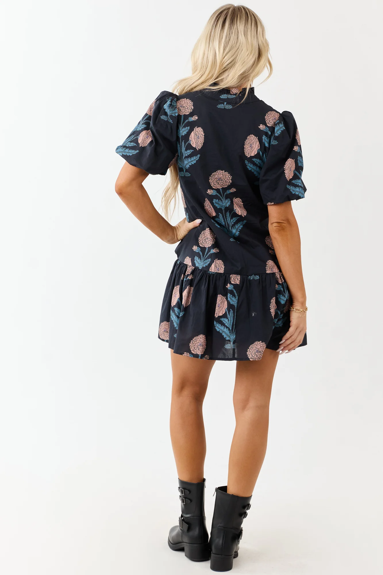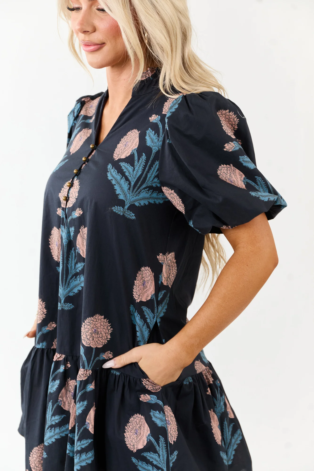 This Navy Floral Puff Sleeve Cotton Mini Dress is a standout piece with romantic puff sleeves, partial button detailing, and a flowy tent silhouette embellished with striking chrysanthemum blossoms. Crafted from 100% Cotton with a 100% Rayon lining, it features a floral design in Navy, Cherry Blossom, Slate Blue, Iris, and Stone colors. Perfect for any occasion, the dress comes with half-button closure, elastic cuffs, and side pockets. Please note that due to the nature of the fabric printing and manufacturing process, each piece may vary slightly in floral placement. Available in sizes XS to XL. Model is wearing a size Small.
