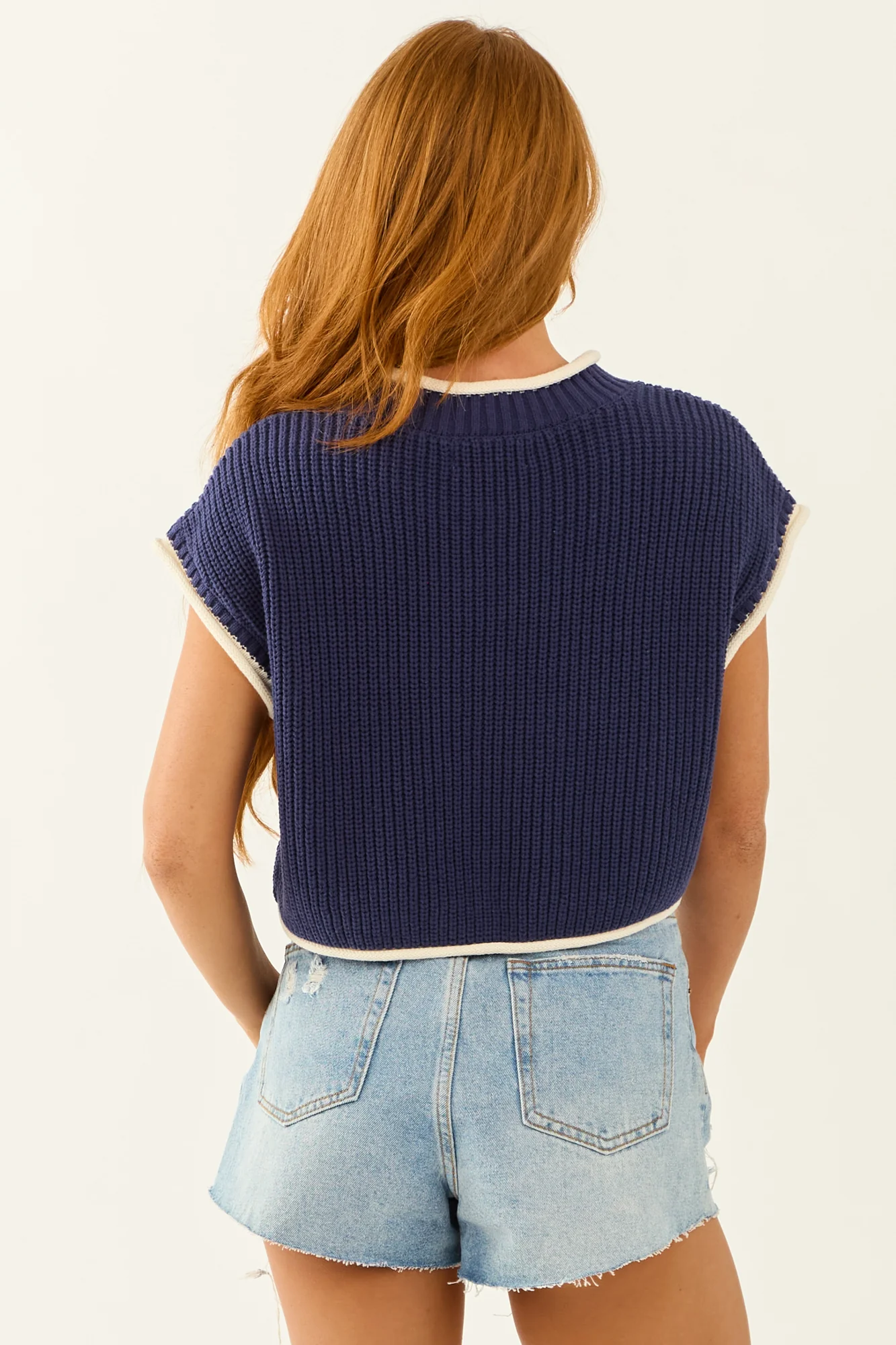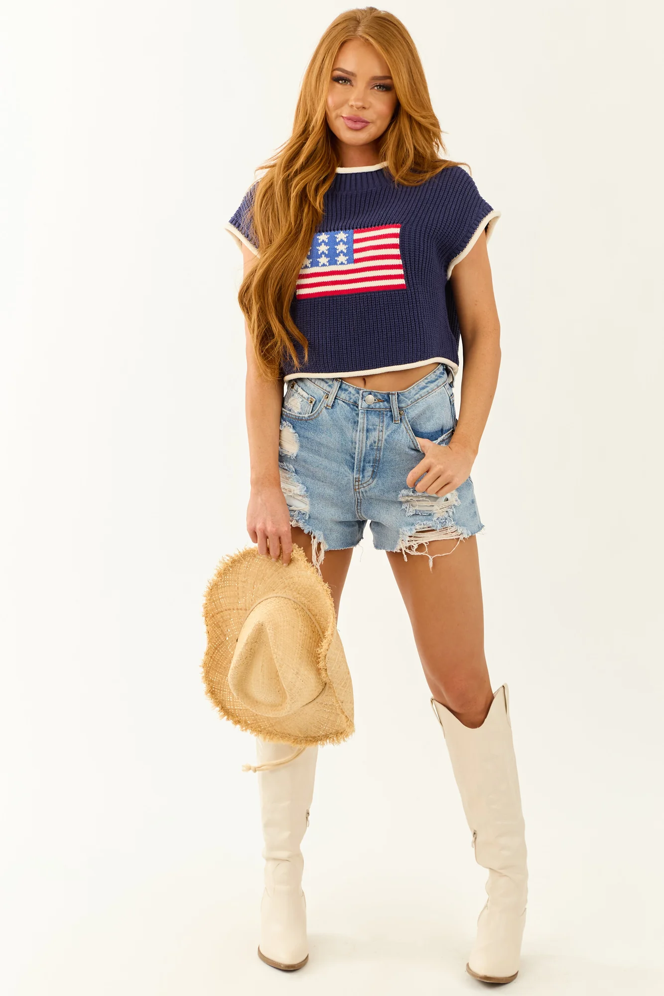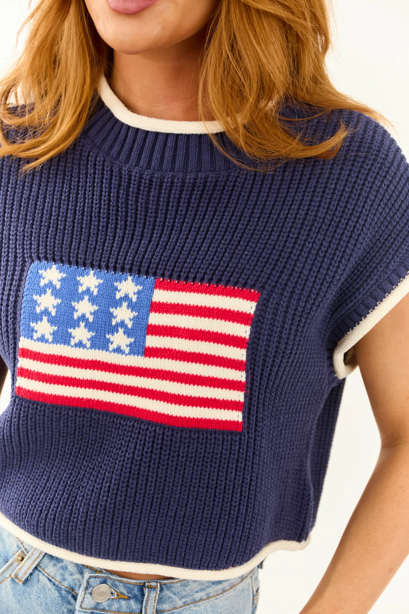 Elevate your summer style with our Patriotic Navy Graphic American Flag Knit Sweater! This boxy top features shades of Cream, Cobalt, and Lipstick, a crew neckline, short cap sleeves, and a cropped length. Perfect for picnics and celebrations, this sweater is both patriotic and stylish. Crafted from 60% Cotton and 40% Acrylic for comfort and durability. Imported. Available in sizes S, M, and L. Wash separately and dry clean professionally for best care.