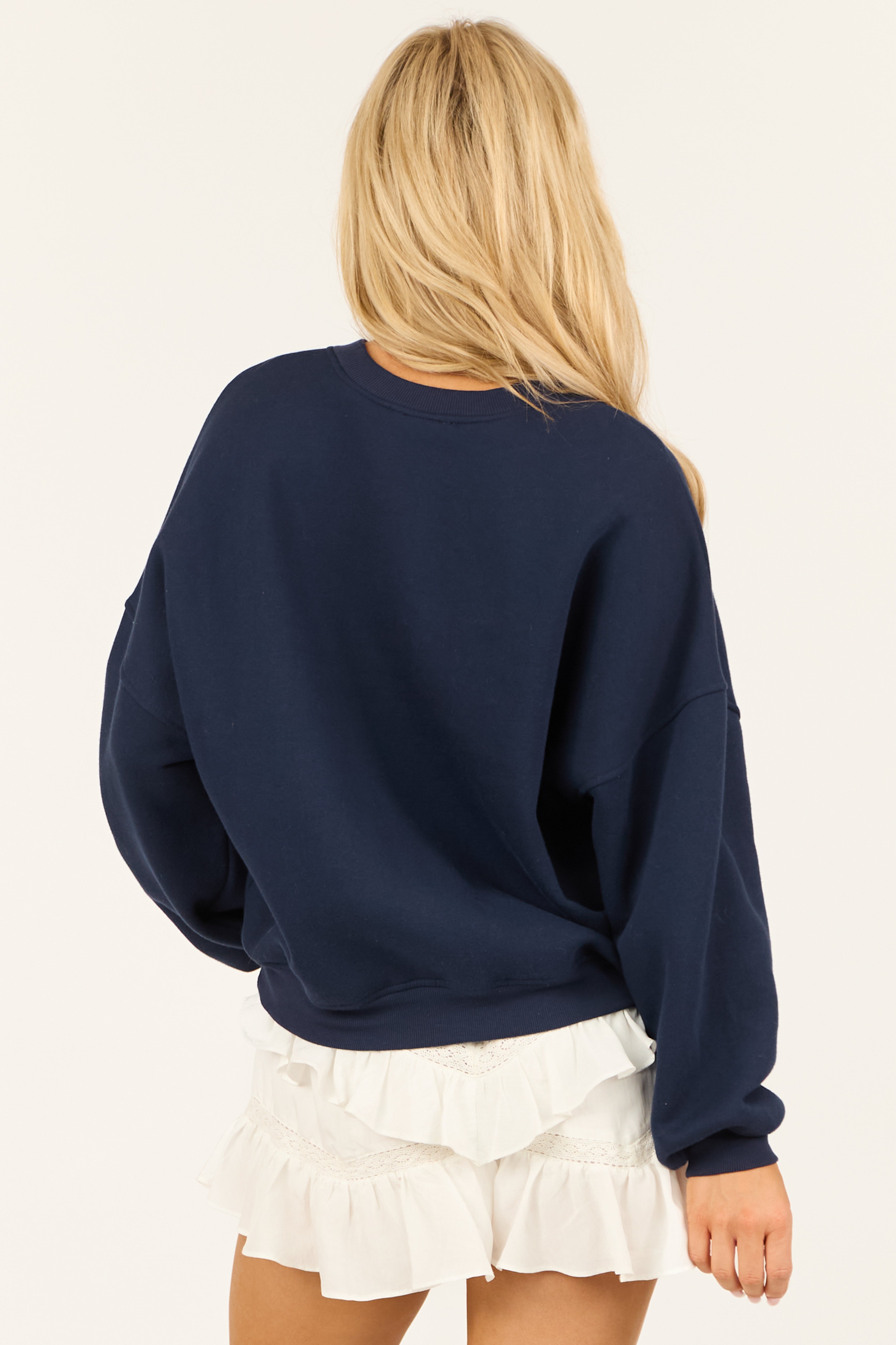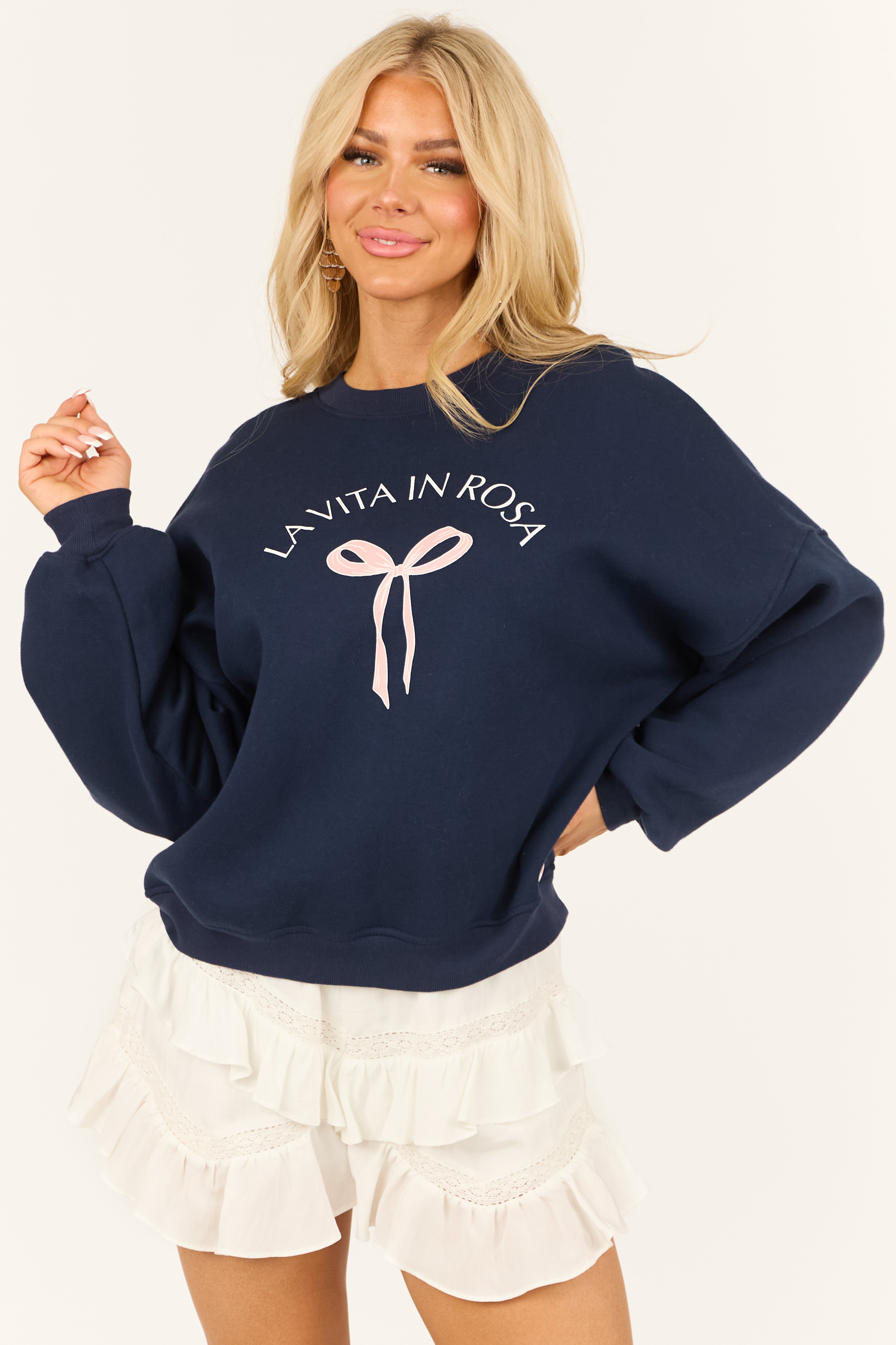 Stay stylish and comfortable in this Navy Graphic Sweatshirt featuring a stretchy ribbed knit with a uniqueLa Vita in Rosagraphic in shades of Off White and Cherry Blossom. Designed with a banded trim, drop shoulder, and long sleeves for a trendy look. Crafted from a blend of 60% Cotton and 40% Polyester with 96% Cotton and 4% Spandex contrast. Perfect for casual wear, this sweatshirt is unlined and comes with care instructions for long-lasting quality. Available in sizes S, M, and L. Model is wearing size Small. Ideal for those who appreciate fashion and comfort.