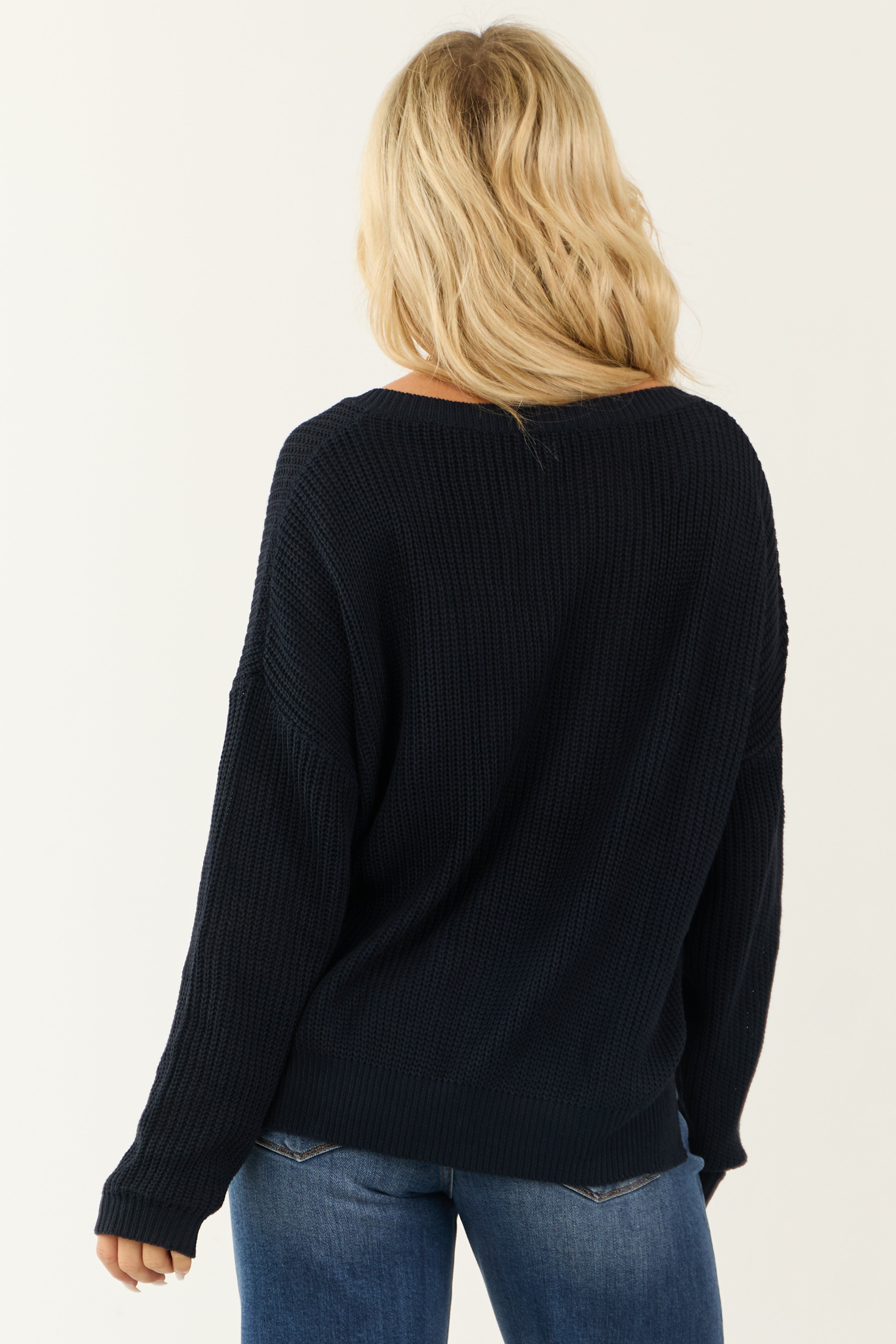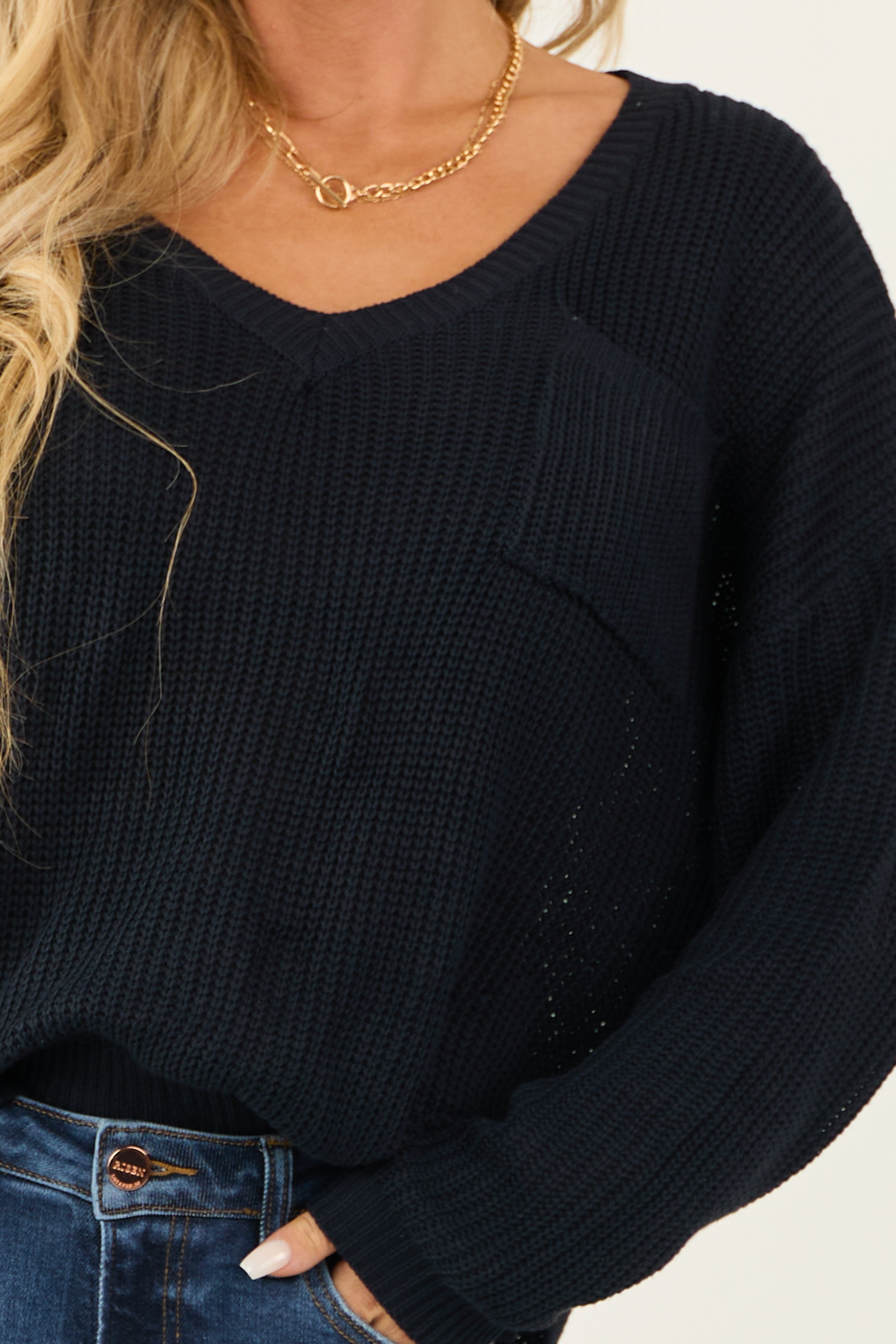 Stay cozy in this Navy Knit V-Neck Sweater with Chest Pocket. With an oversized fit, stretchy knit, and ribbed trim, this sweater offers comfort and style. Features drop shoulders, banded cuffs, and a longline silhouette to keep you warm. The V neckline and chest pocket add a touch of uniqueness. Crafted from 95% Polyester and 5% Nylon. Hand wash cold, lay flat to dry. Model is wearing a size Small. Available in sizes S, M, and L.