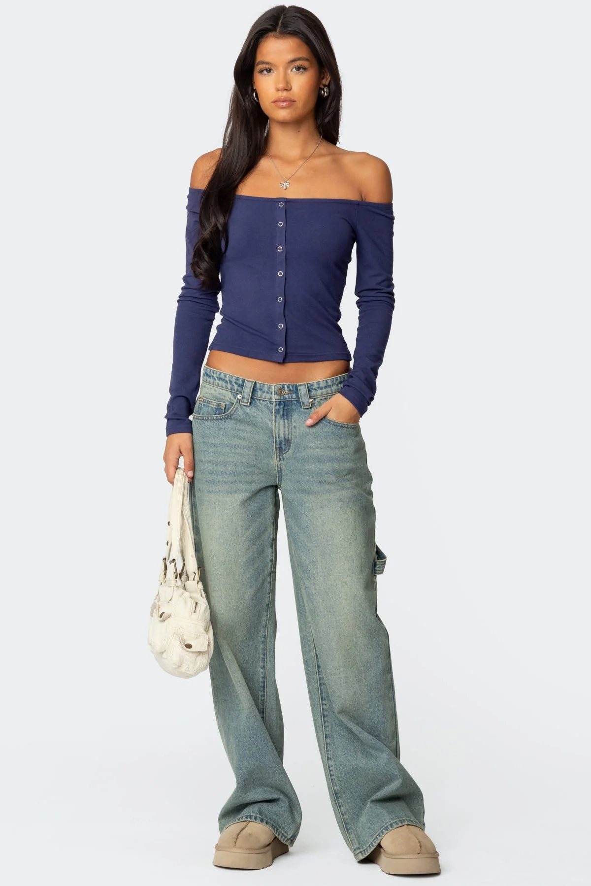 Elevate your style with this Navy Off Shoulder Snap Button Top featuring long sleeves, irresistible off-shoulder design, and convenient front snap button closures. Made from a blend of Rayon and Spandex for a comfortable fit. Perfect for casual outings or special occasions. This top is a must-have addition to your wardrobe. Available sizes: XS, S, M, L, XL. Model wears size S – Model height: 58. Please wash with similar colors.