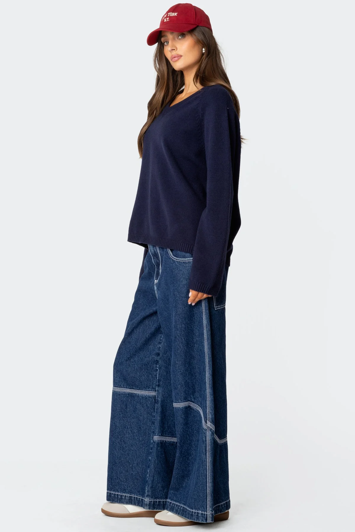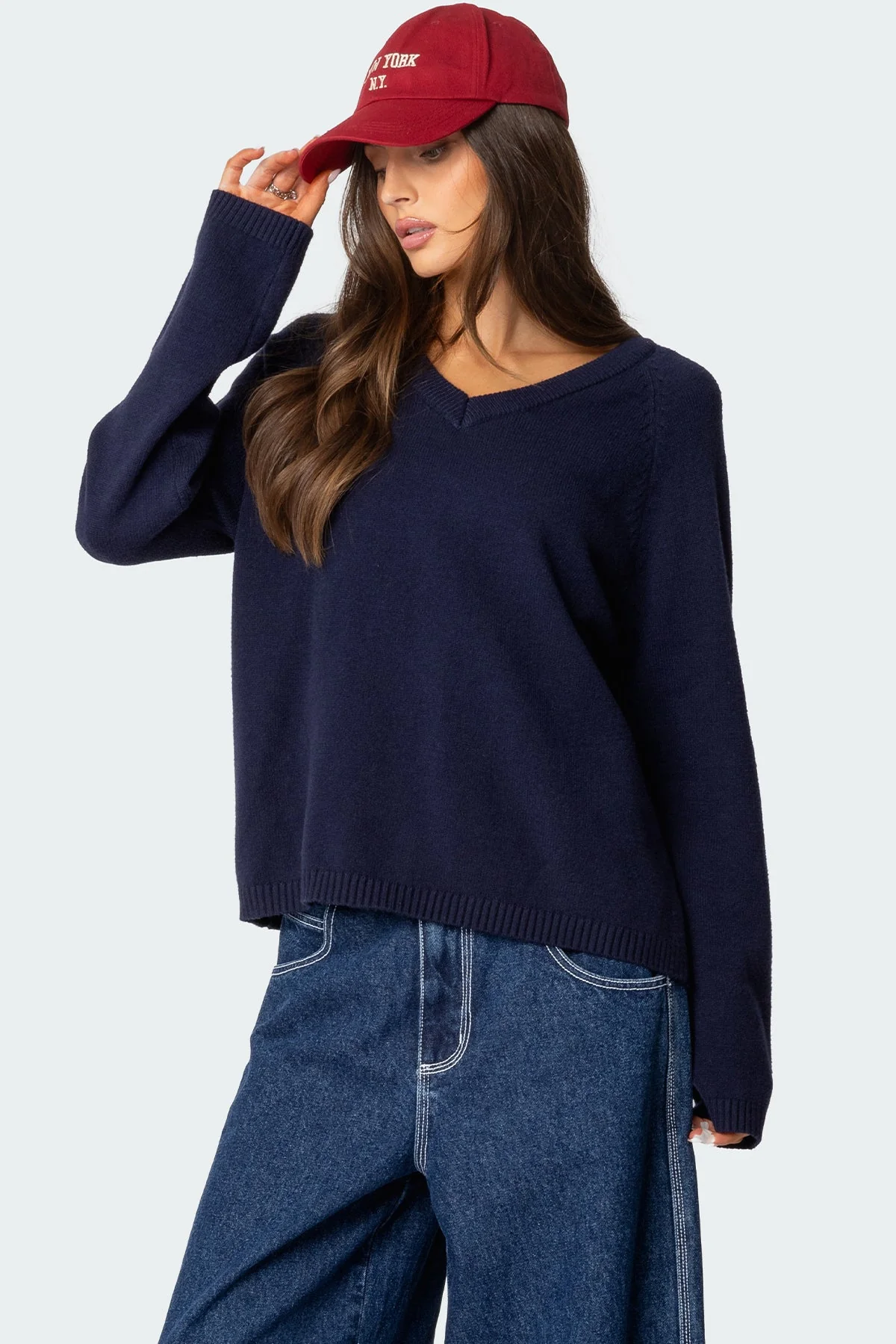Experience ultimate comfort and style with our navy oversized V-neck sweater. Made from high-quality acrylic, this sweater features a relaxed fit perfect for any occasion. The model is 59 and wears size S. Care instructions: Machine wash at a maximum of 30ºC, do not bleach, do not tumble dry, iron at a maximum of 110ºC, do not dry clean.