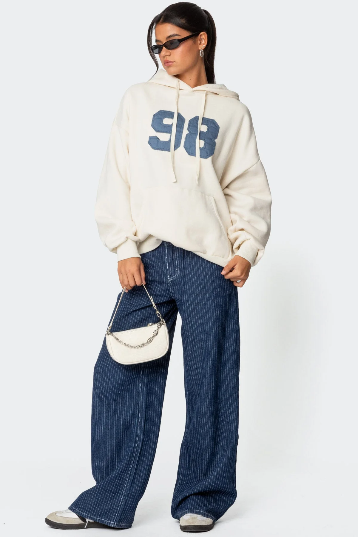 Experience style and comfort with our navy pinstripe low rise jeans featuring a straight leg fit in high-quality 100% cotton denim fabric. Keep up with the latest fashion trends and elevate your wardrobe effortlessly. Ideal for daily wear or a night out with friends. These jeans exude confidence and sophistication. Model wears size S. Model height is 58. Care Instructions: Machine wash with similar colors.