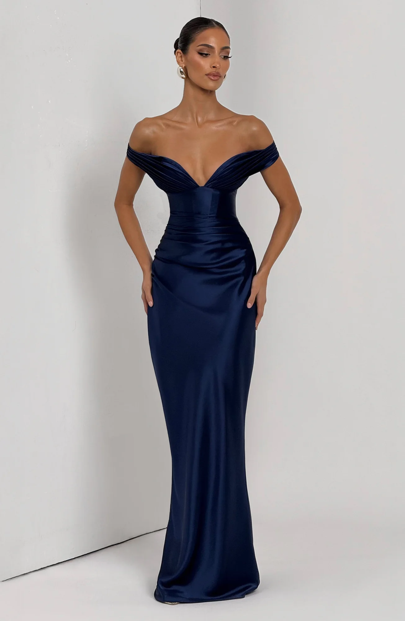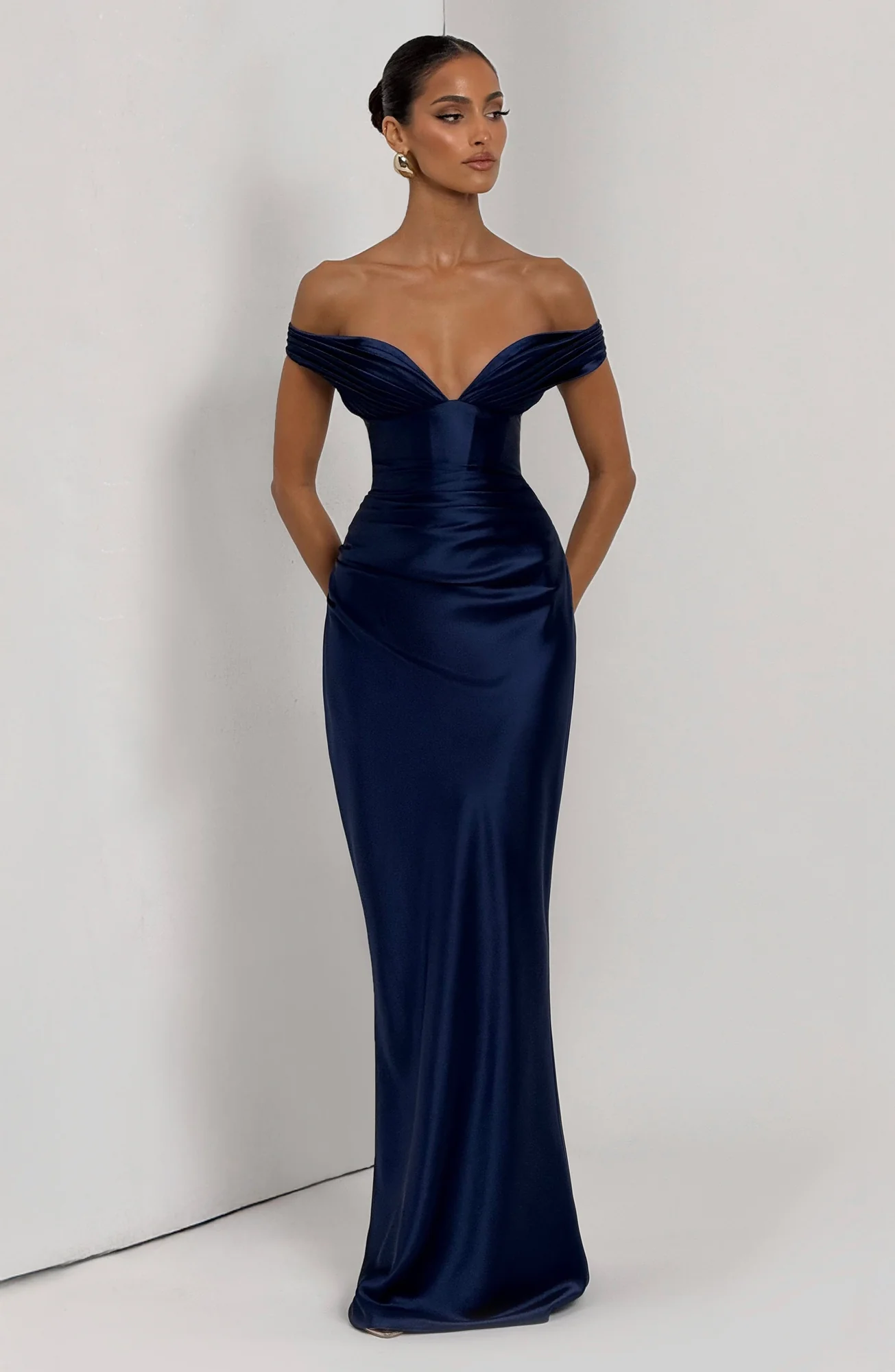 Indulge in the timeless elegance of our Navy Satin Asymmetric Bardot Maxi Dress. Crafted from luxurious satin, this dress features a flattering plunge bardot neckline with pleated cups and an internal boned corset. The lace-up back adds a touch of allure, while the asymmetric pleated bodice and sleek column-shaped skirt create a sophisticated silhouette. Perfect for formal events or evening occasions. Available in sizes XS to XXL.